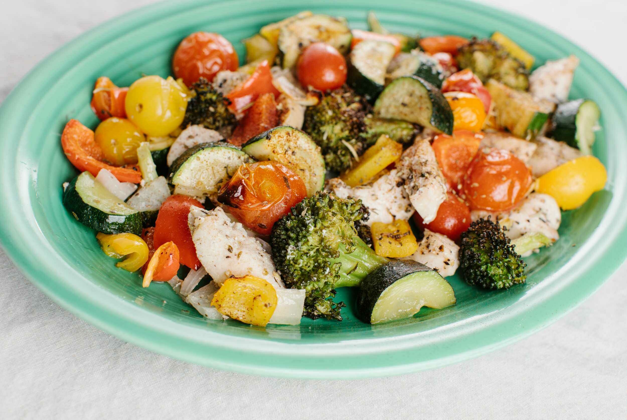 Step 2 -Place the chicken, the bell pepper, the onion, the zucchini, the broccoli, and the tomatoes in a medium-sized baking dish or sheet pan.