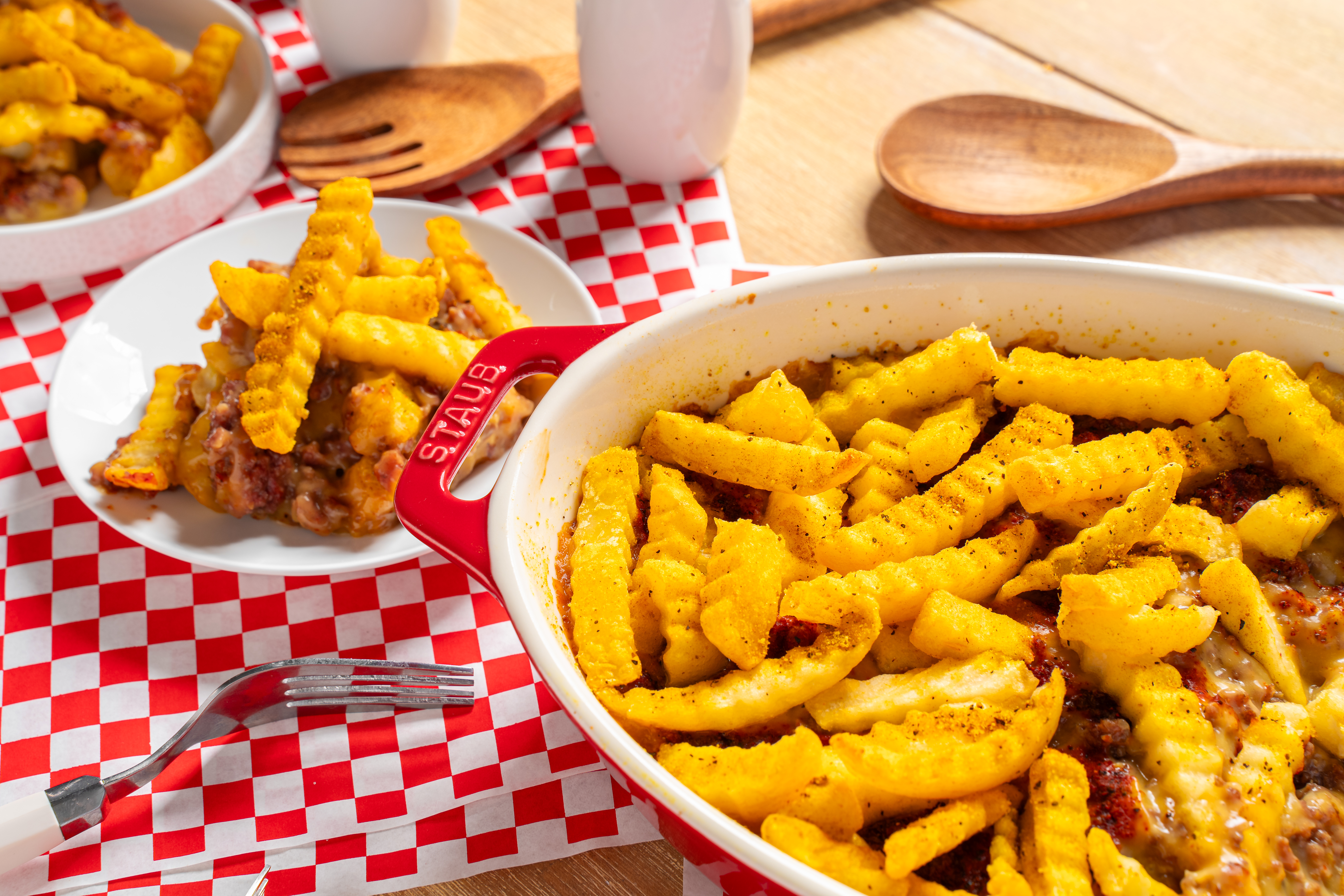 Step 7 -Arrange the fries evenly on top of the beef mixture evenly.