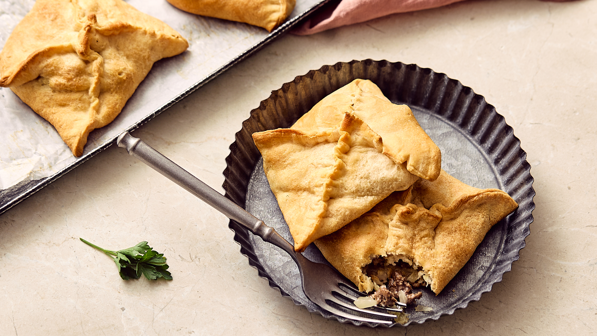 5-Ingredient Beef Turnovers are meaty pockets of savory flavor with a golden-brown crust! These are so easy to put together and bake up... you can have it ready in just half an hour! Filled with melty, nutty Swiss cheese and electrically tangy sauerkraut to contrast the beefy succulence, 5-Ingredient Beef Turnovers are far better than the sum of their (very few) parts! This is a new take on dinner that will make you happy!