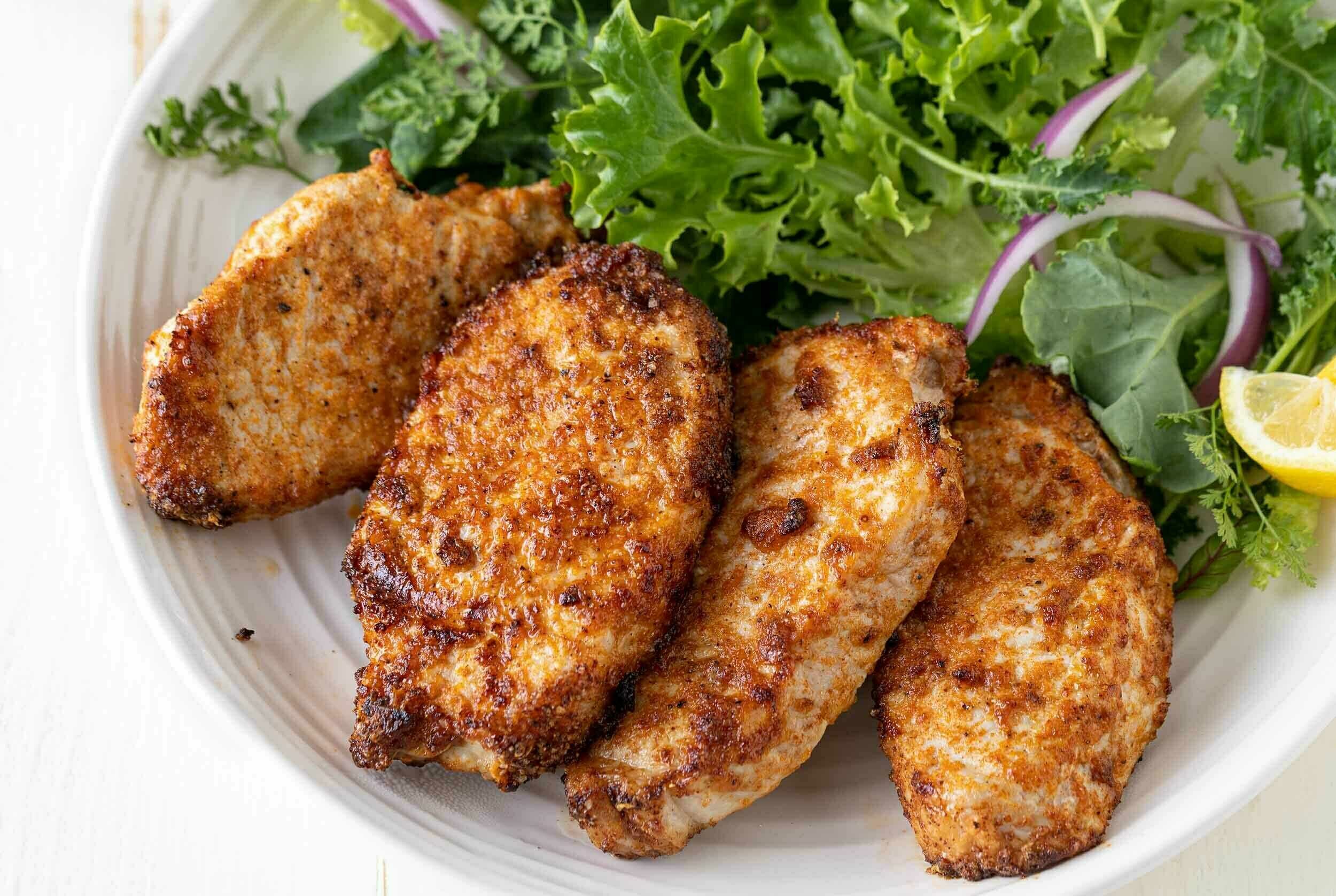 When you're in a time crunch and need a fulfilling source of protein, Air Fryer Pork Chops are it! Fatty, boneless pork chops are coated with savory parmesan, smokey paprika, caramelly garlic, and sweet onion powder. Then you simply drop them in your beloved air fryer for nine whole minutes. Air Fryer Pork Chops will have you filled up in a hurry!