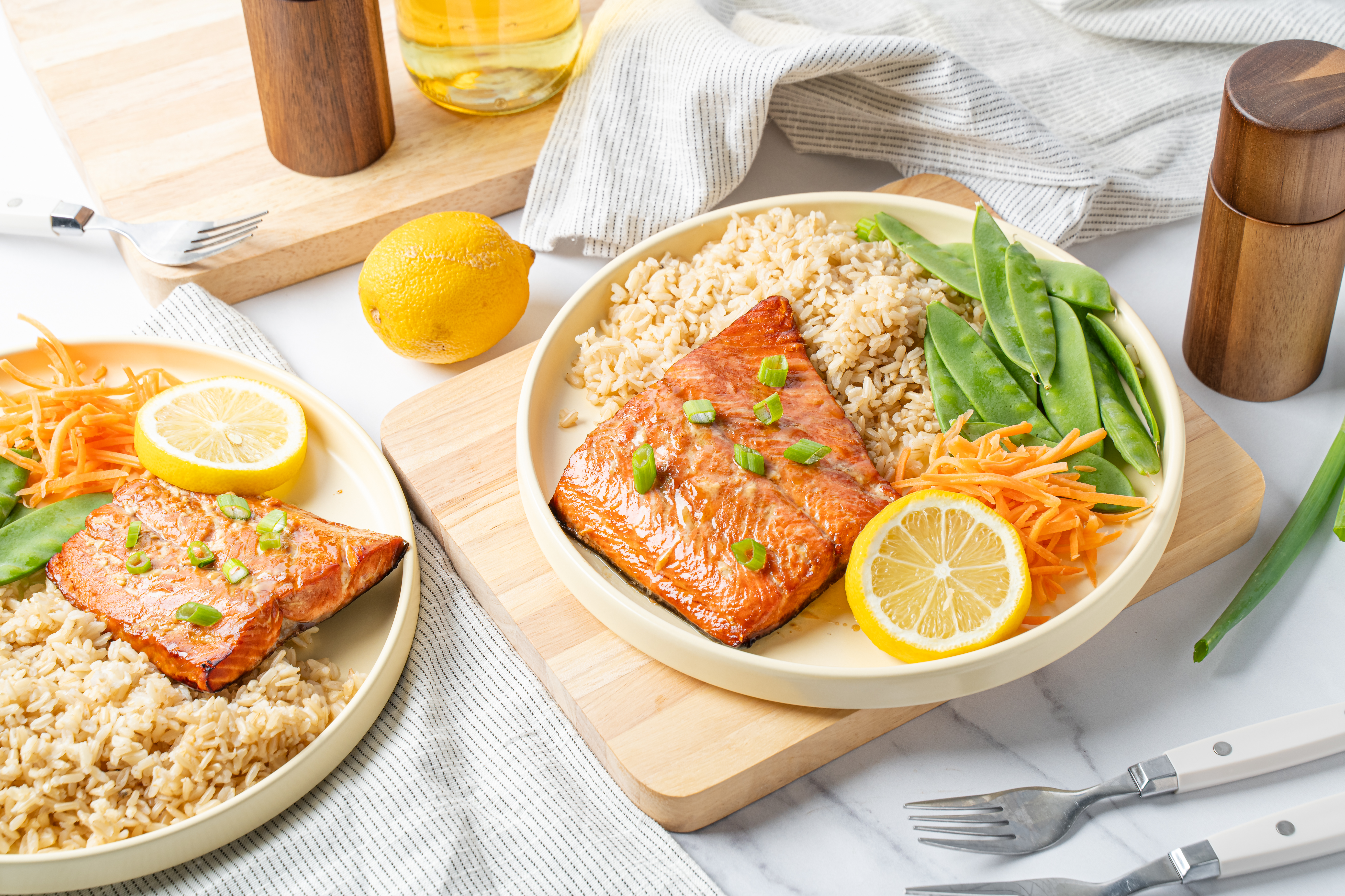 Step 17 -Plate the salmon fillets with the remaining marinade sauce, the brown rice, the snow peas, and the shredded carrots.