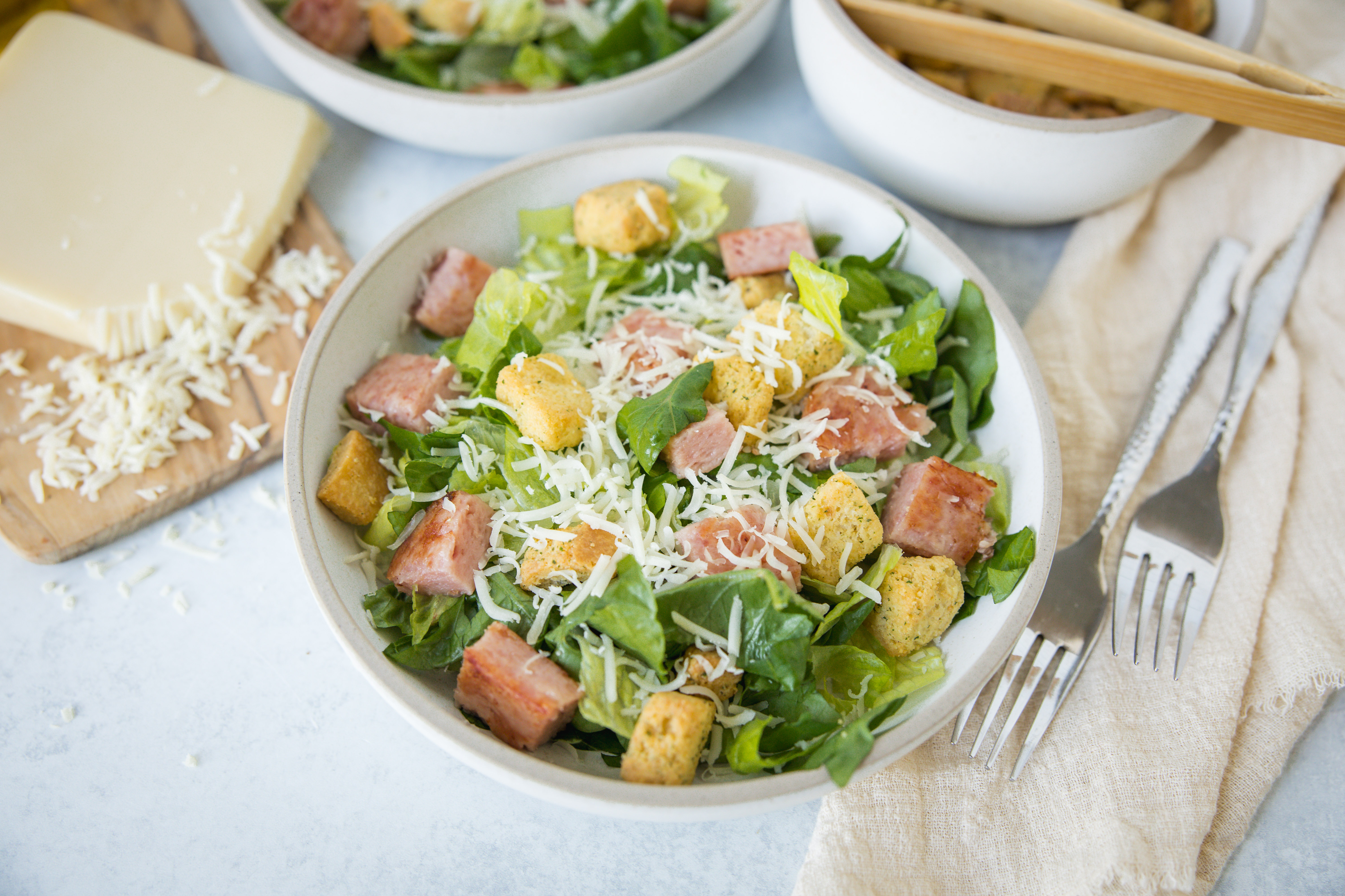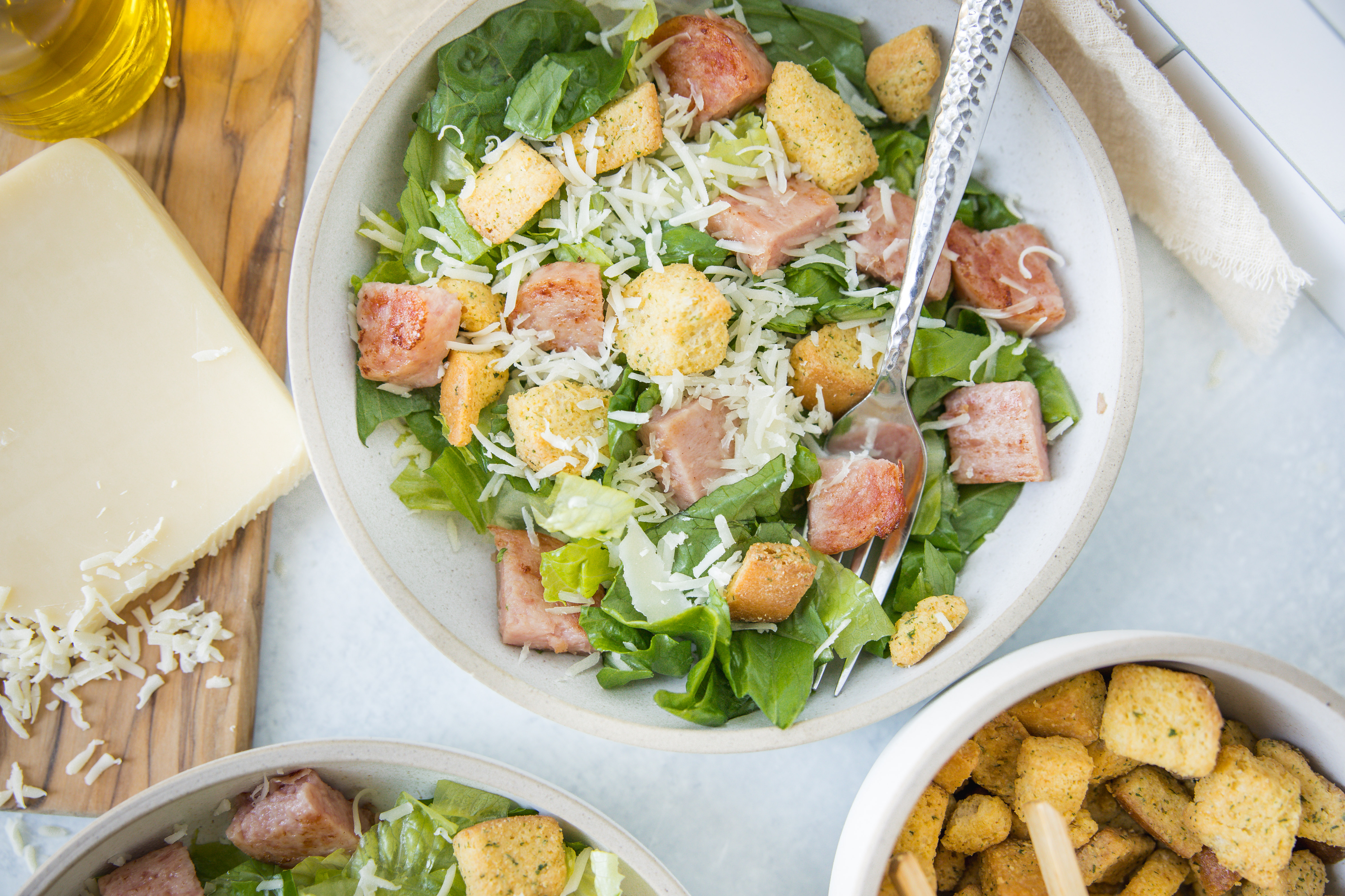 Salads really don't get much more American than this. All-American Spam® Salad is the much beloved classic Caesar salad with a few twists to ramp up its flavor (and its patriotism). These twists include quick-toasted, golden, and crunchy homemade croutons and warm, succulent, and flavorful cubes of Spam. With a homemade Caesar-inspired dressing for that creamy tanginess and a sprinkling of smoky Gruyère cheese, All-American Spam Salad really shows what American cooking can do!
