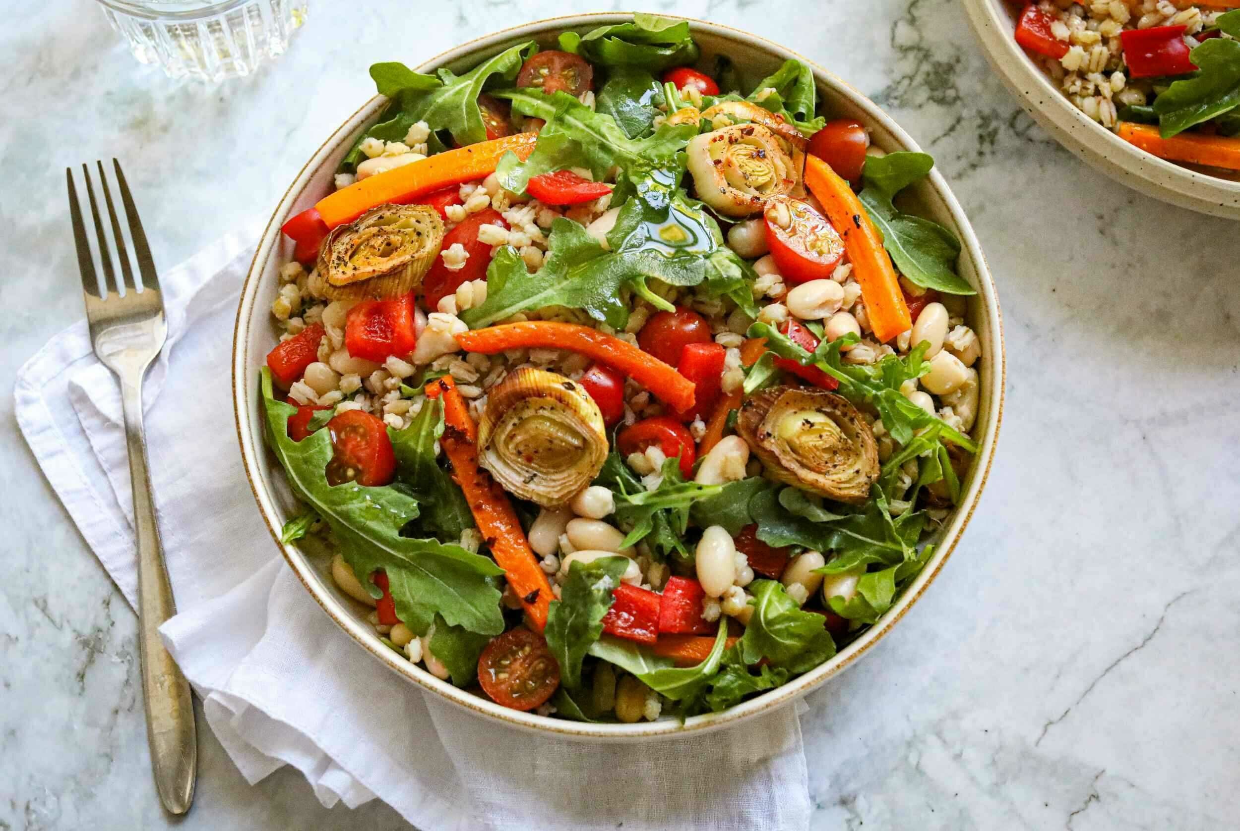 Step 9 -In a large bowl, toss the farro, roasted carrots, roasted leeks, beans, bell pepper, cherry tomatoes, and radicchio.