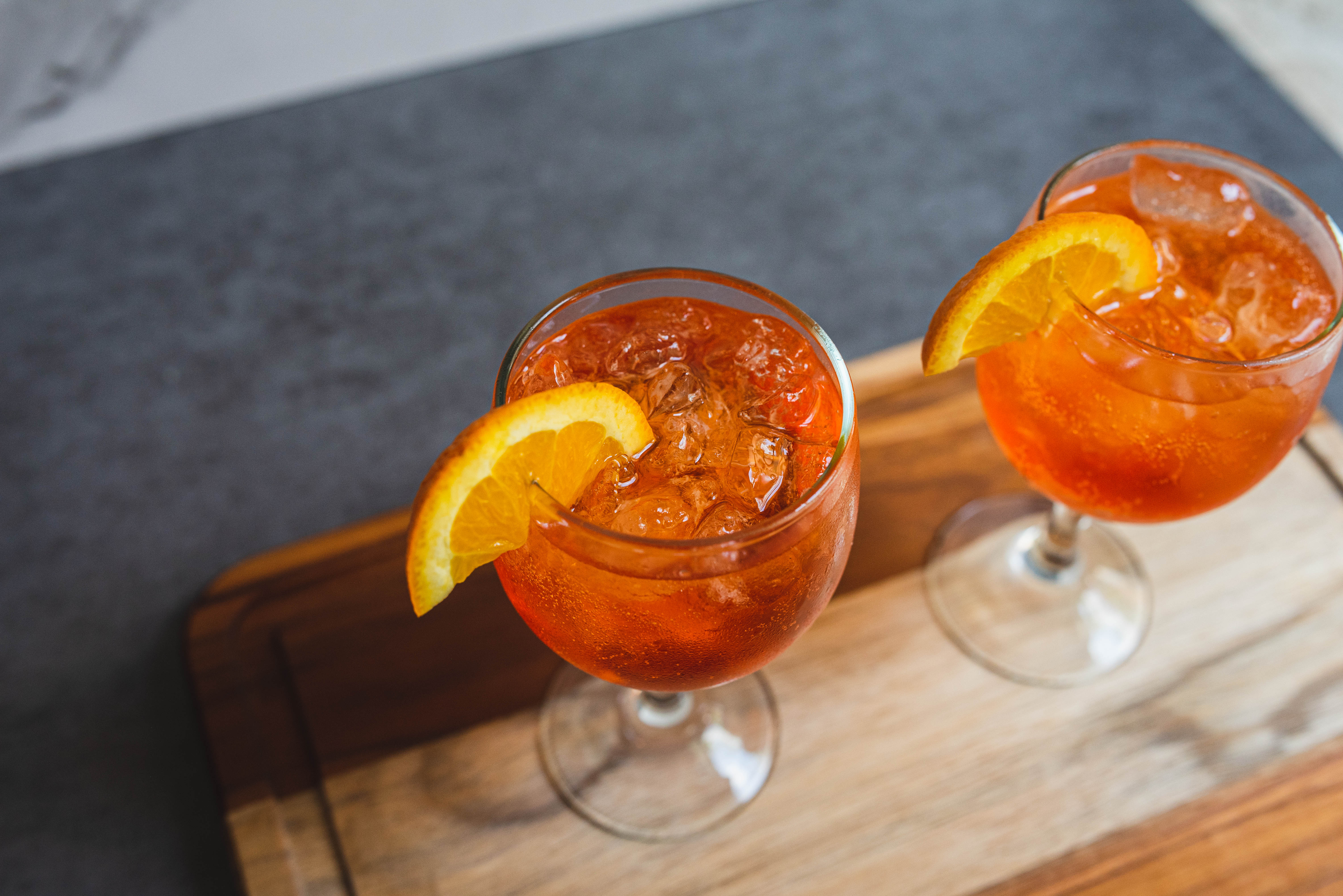 Step 1 -Add the ice to four cocktail glasses, then add 2 ounces of the Aperol to each glass.