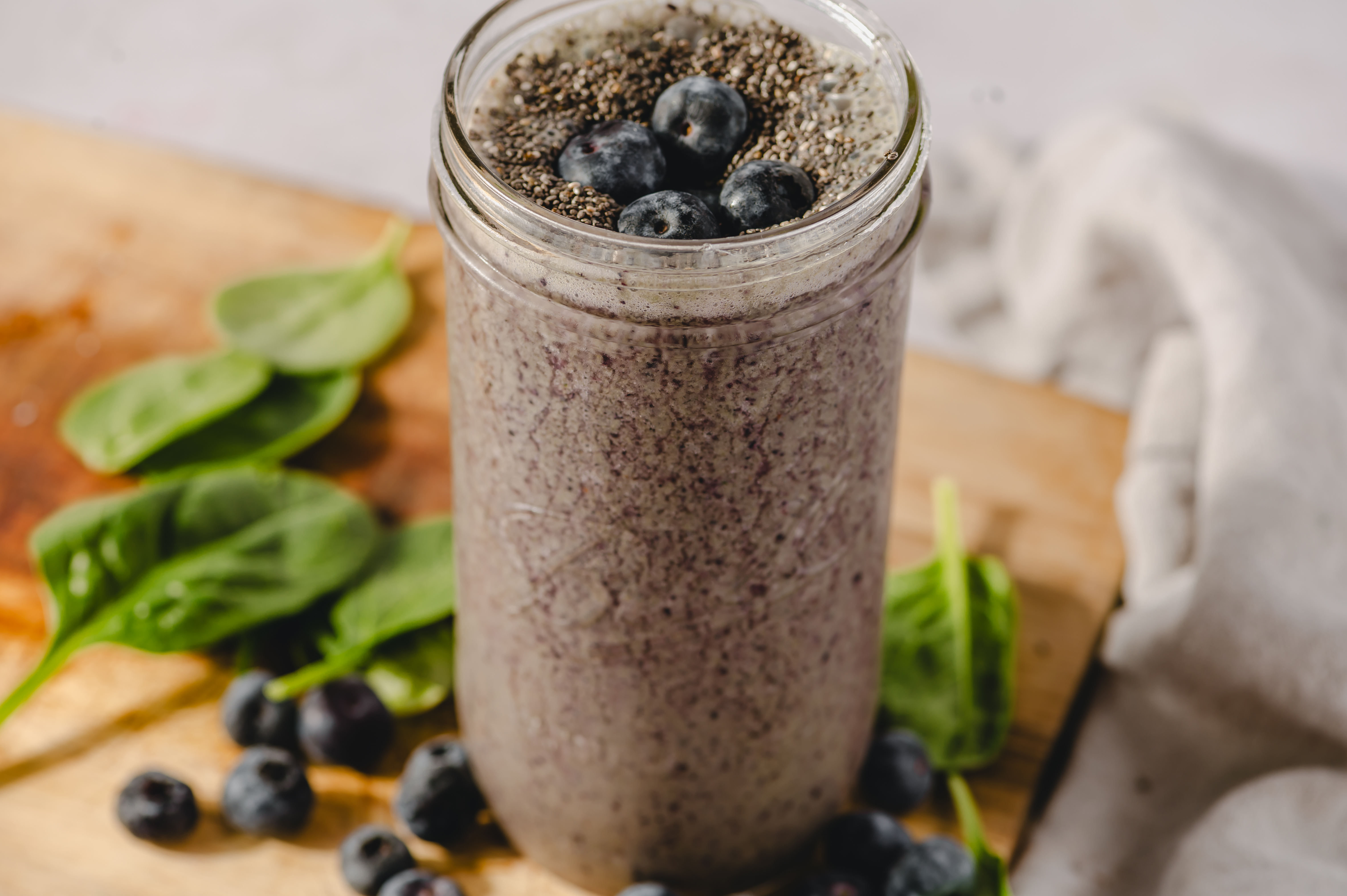 Step 4 -Serve the smoothie in the chilled glass, garnished with the extra blueberries and the chia seeds.