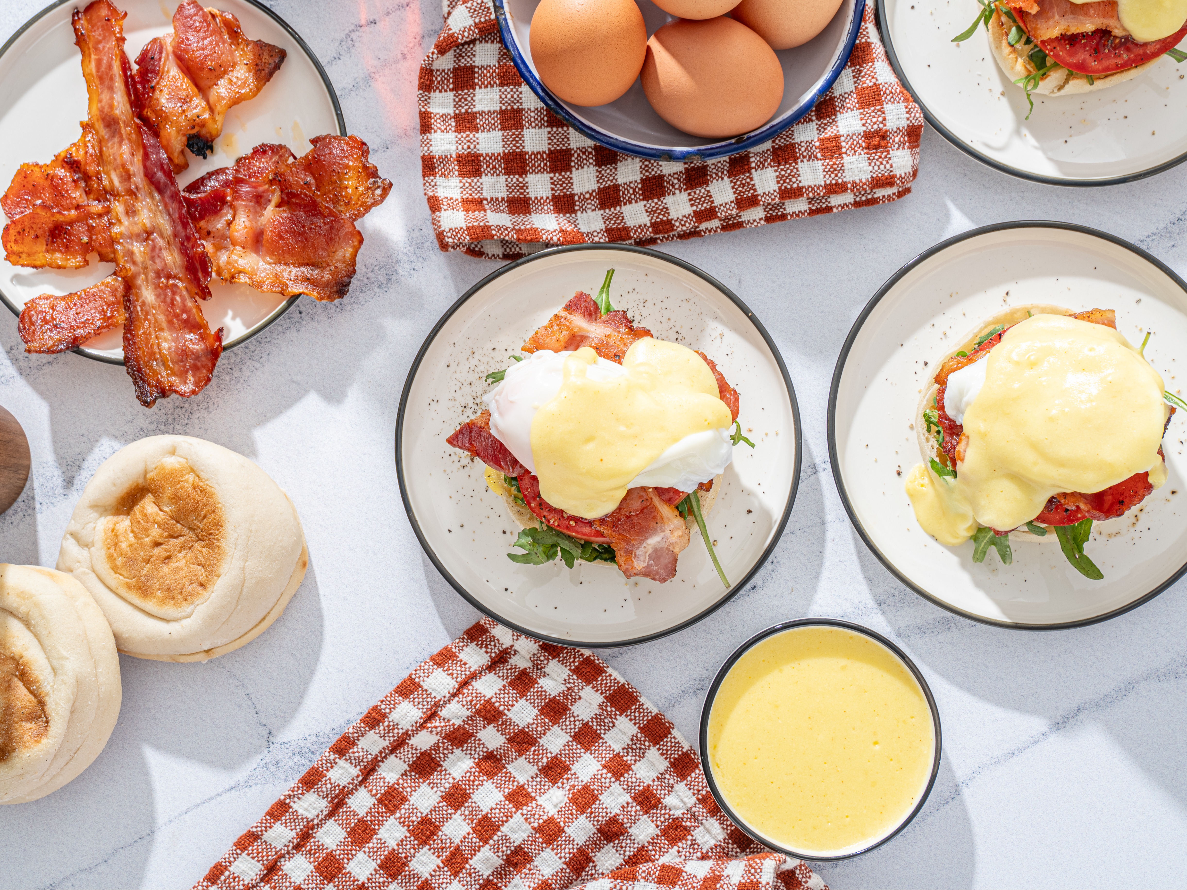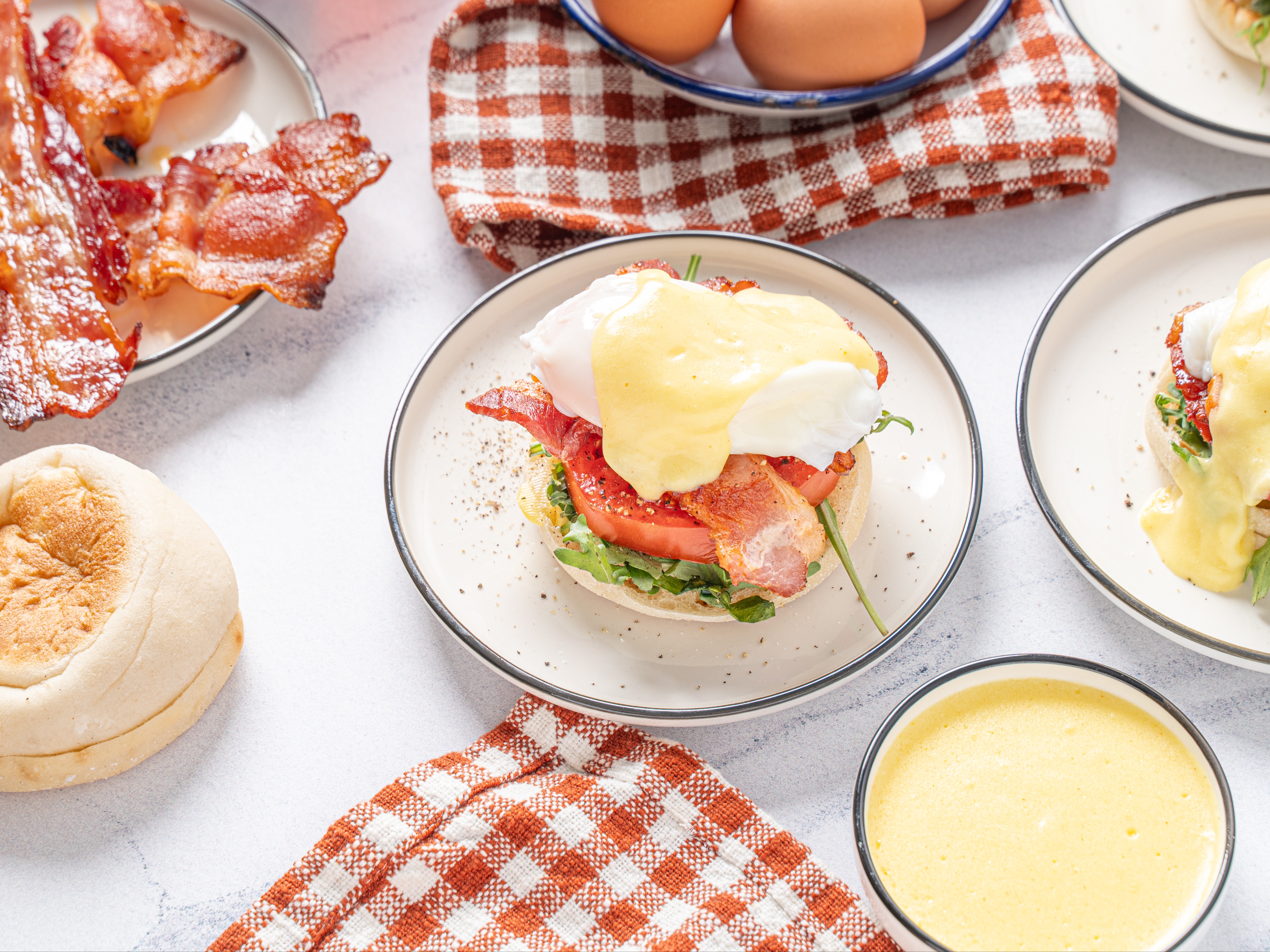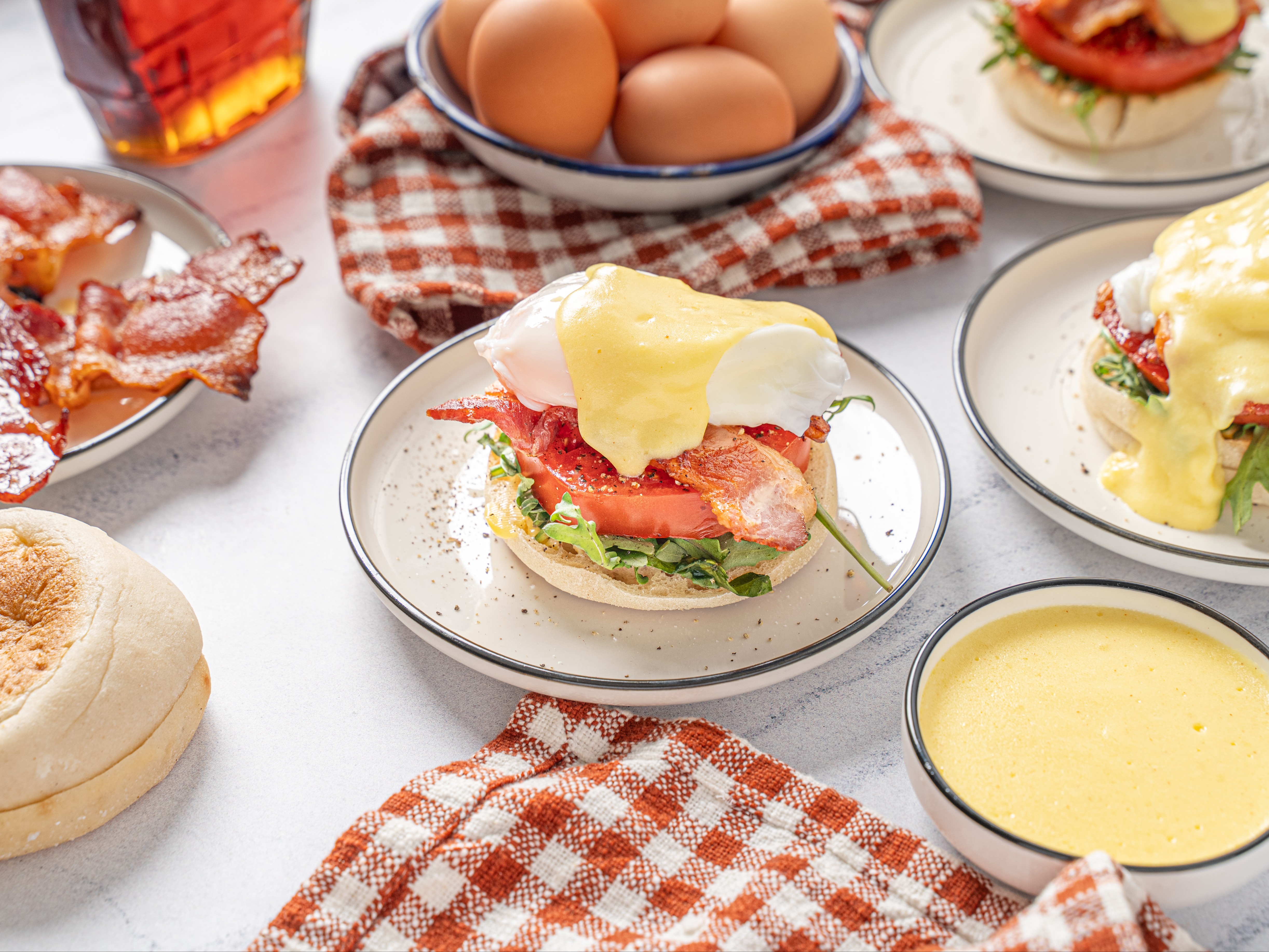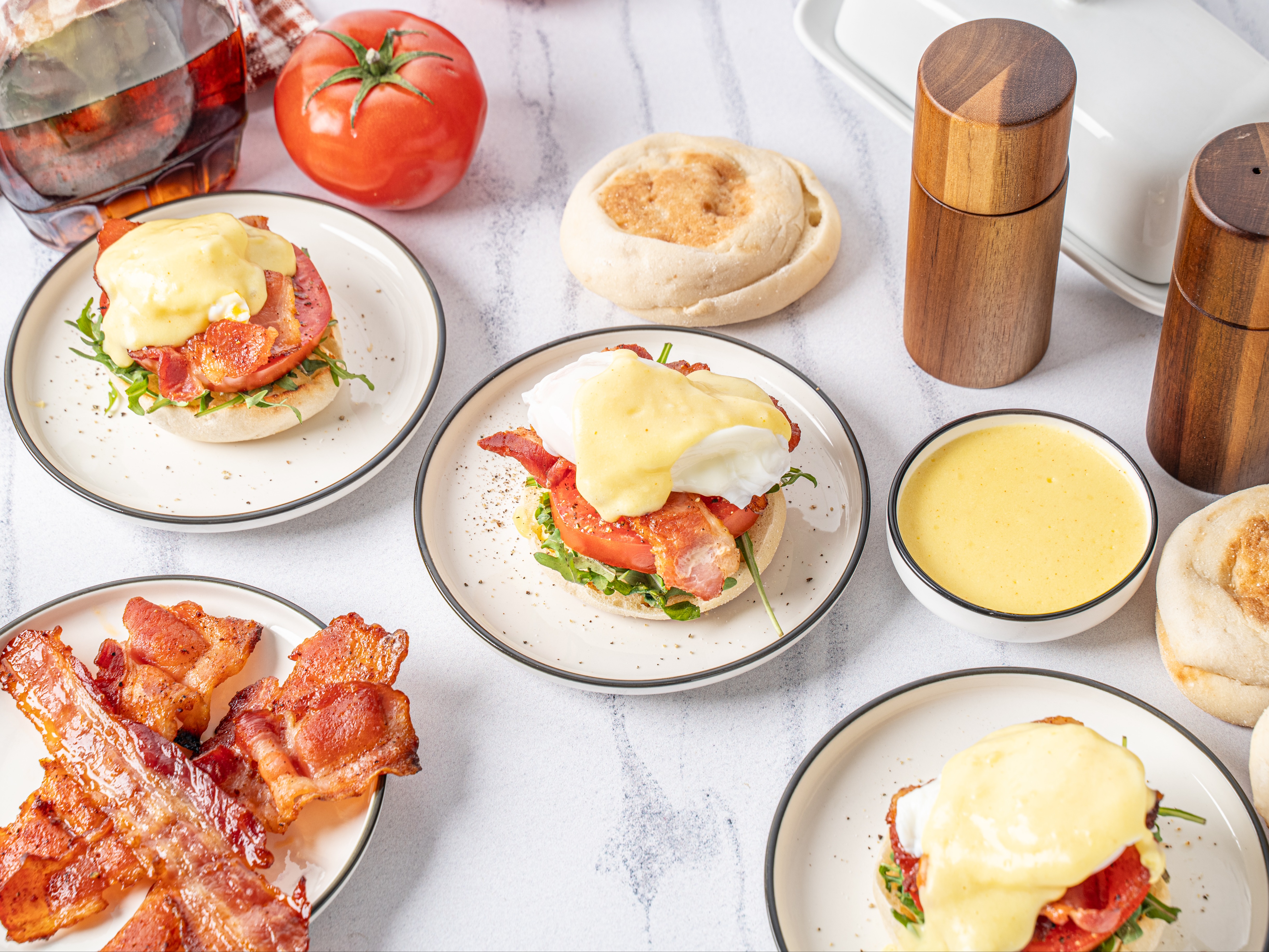 Ah, the BLT Benedict! The perfect candidate for your brunch bonanza. These open-faced sammies are packed with the iconic BLT trio (and might we mention, the "B" is candied and the "L" is upgraded to fresh arugula) then topped off with a fancy poached egg to bring in the beloved breakfast aspect. There are a million reasons why brunch is the best and the BLT Bendict drizzled in this yummy hollandaise sauce is definitely one of them!