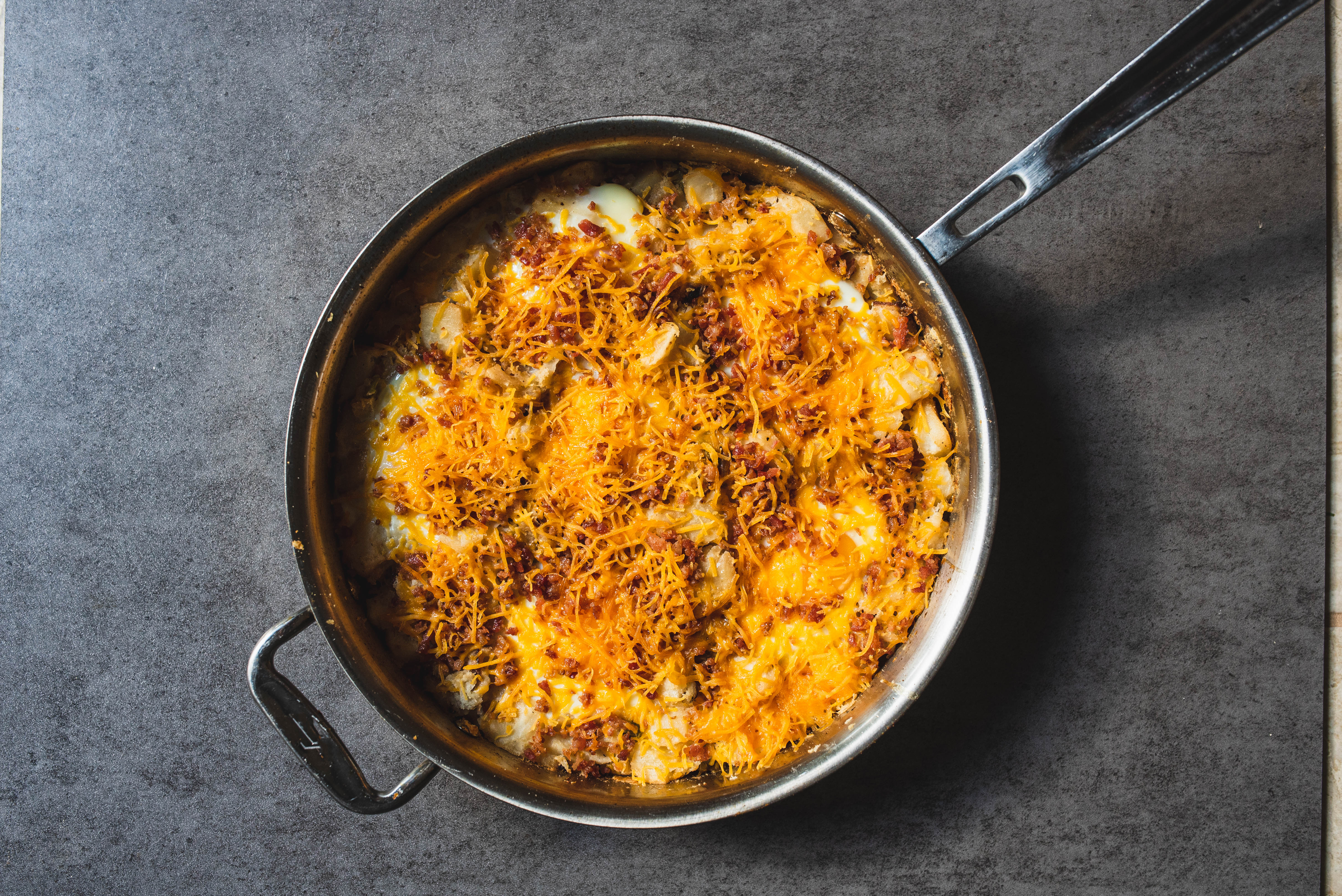 Step 9 -Transfer the skillet from the heat and sprinkle with the cheese and the crumbled bacon.