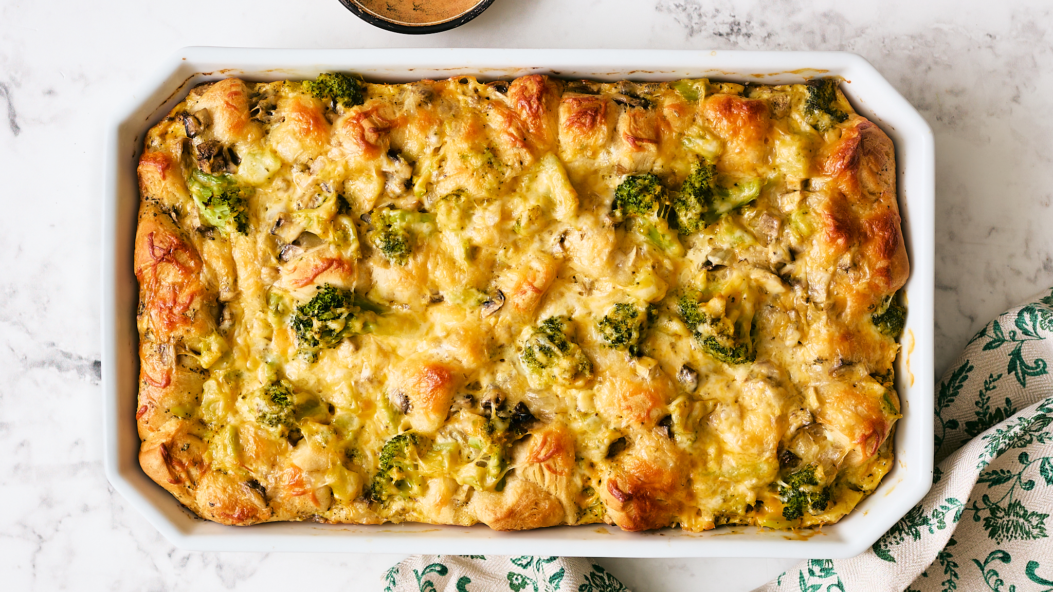 Hmmm, is Broccoli Bubble Bake a side dish or a breakfast? Mmmm, well it doesn't matter really; it's delicious either way! A bed of fluffy, fantastically savory eggs atop a layer of buttery biscuit pieces would be tasty enough, but then it gets filled with all the good stuff — broccoli, mushrooms, and onions — which create a hearty and satisfying meal! Top it with cheese and Broccoli Bubble Bake is just the best!