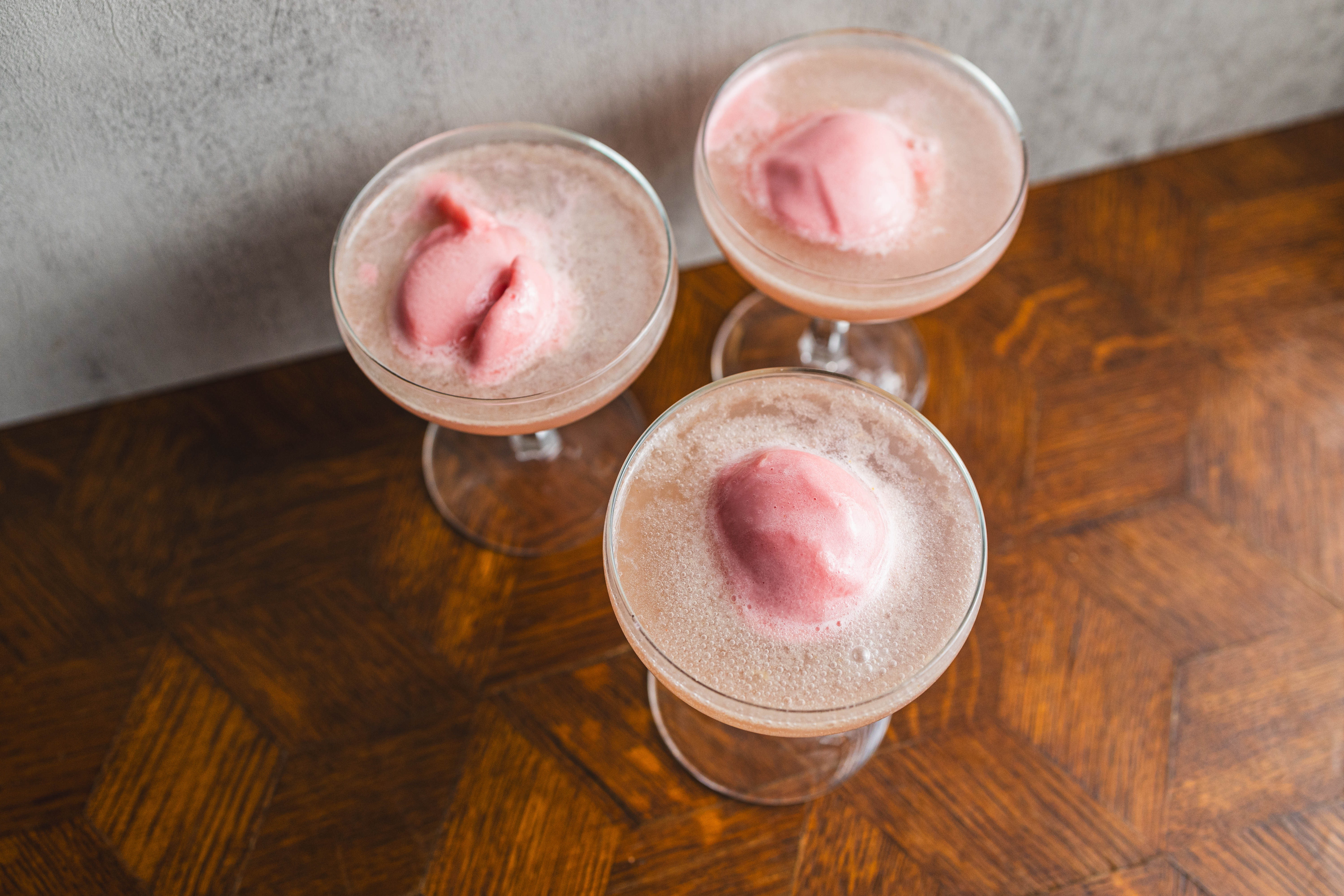 Cheers! Champagne Strawberry Floats bring beauty to all your bashes! Whether you're celebrating a bride-to-be, a pastel-themed birthday, the fact that spring has sprung, or anything else beautiful in between, your flutes full of sparkling bubbly poured over some sweet strawberry lemonade will be the perfect touch. Topped with a scoop of creamy strawberry sorbet for a little extra berry brilliance, these Champagne Strawberry Floats are just so perfect for pretty parties!