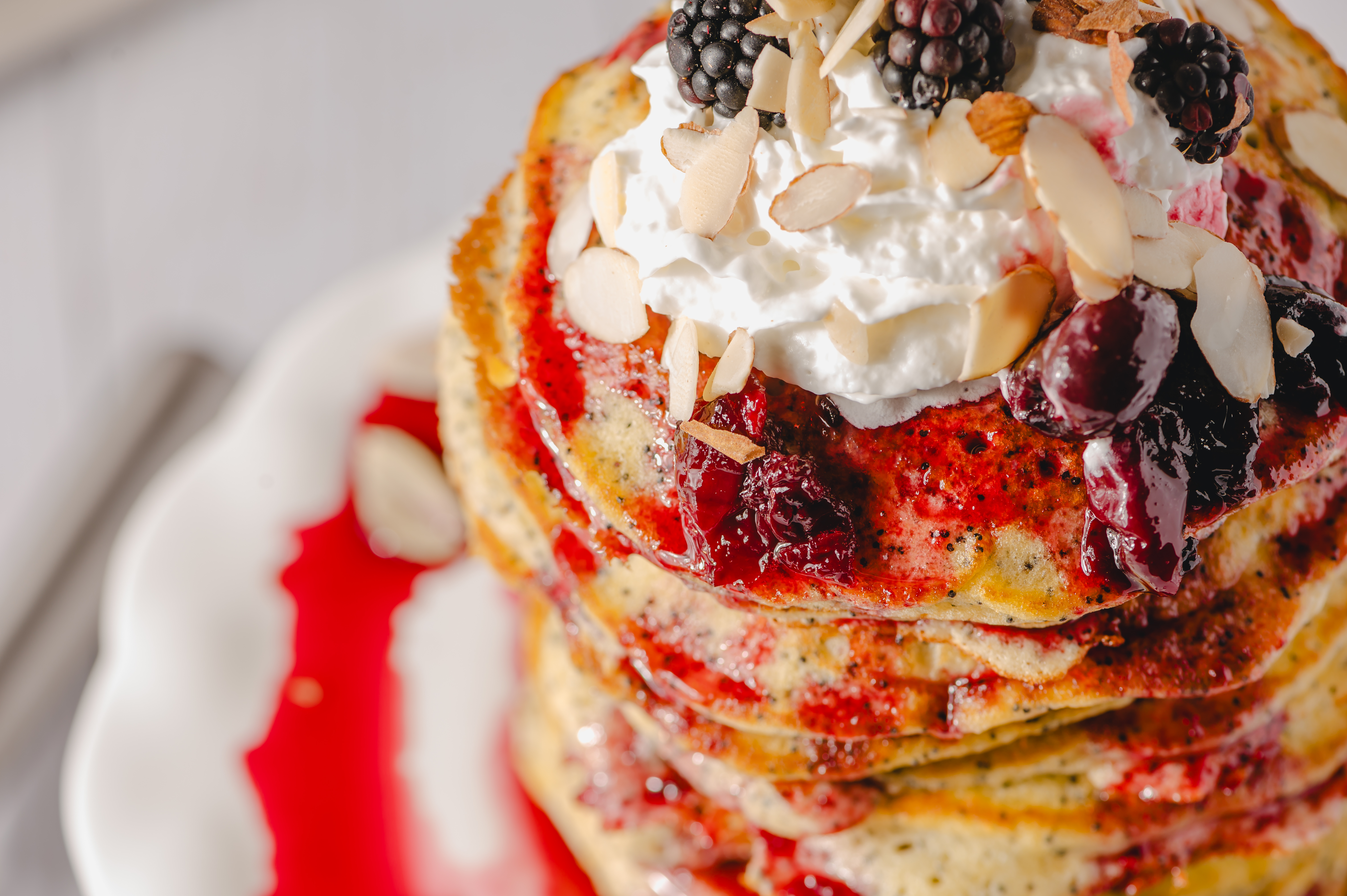 Nothing can put a smile on your face like Cheery Cherry Pancakes! These ultra-fluffy, ultra golden poppy seed pancakes are wonderfully nutty and buttery, which would be amazing all on their own. But then each delicious pancake is topped with a homemade sweet and tart cherry syrup! And whipped cream! And berries and almonds, because these are Cheery Cherry Pancakes! They're all about making you happy!