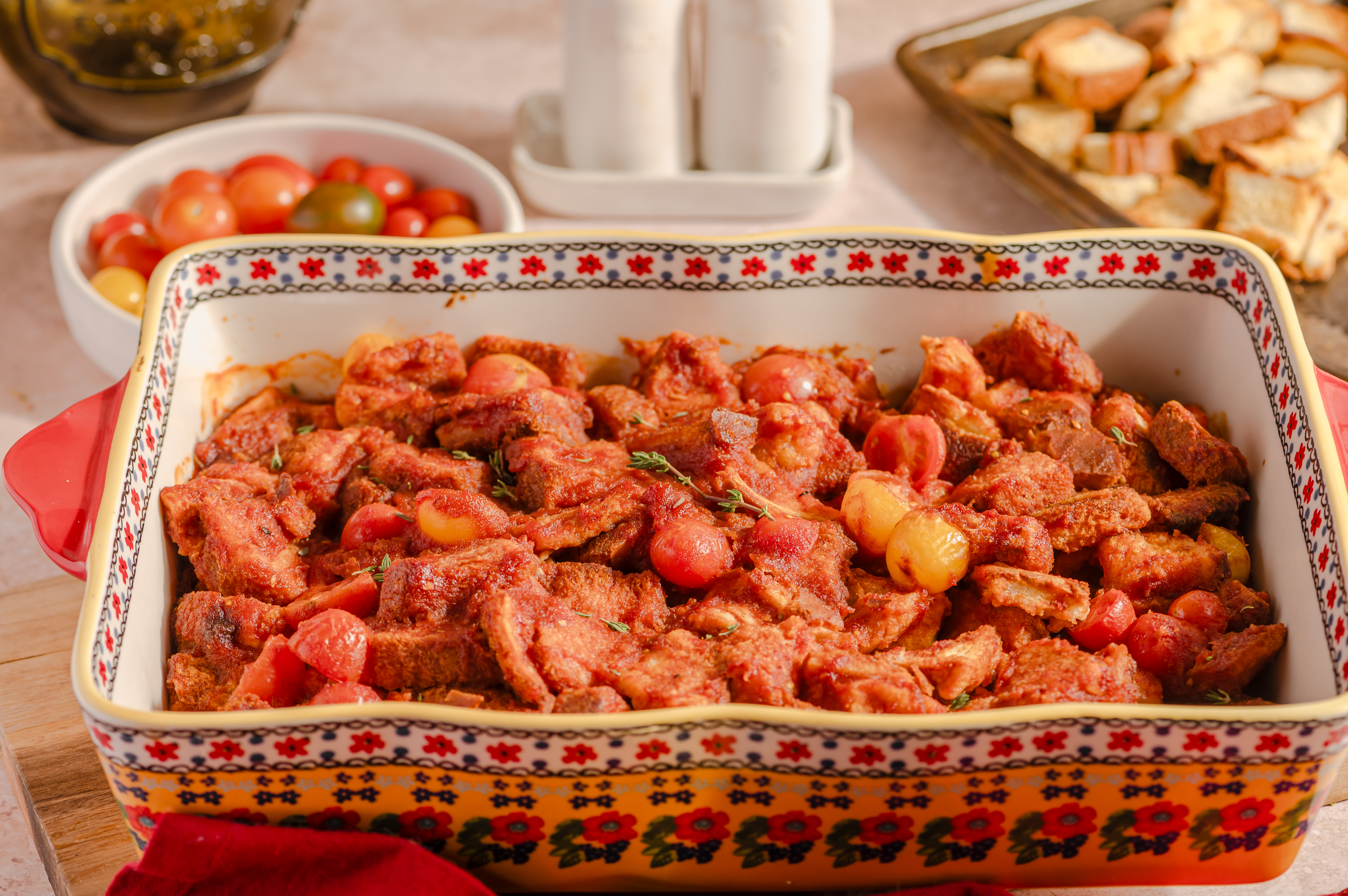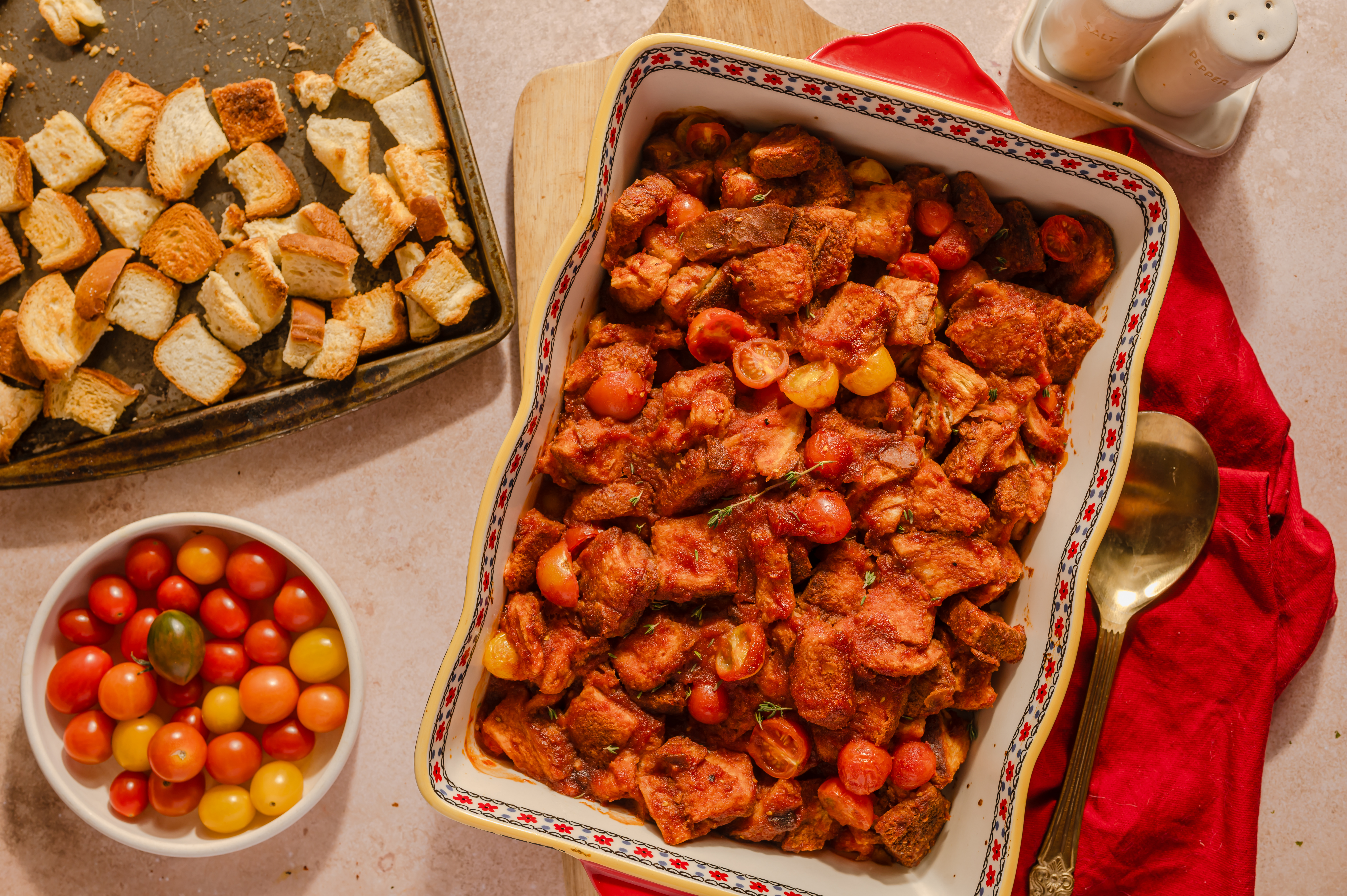 The Cherry Tomato Cobbler is how to fully embrace your love of tomatoes, even without pasta! Toasty bread cubes are soaked in a slightly sweetened, smoky, and vibrant tomato sauce with plenty of juicy cherry tomatoes for a burst of extra flavor. Rustic, charming, and delicious, Cherry Tomato Cobbler brings a new kind of tomato love to your taste buds!