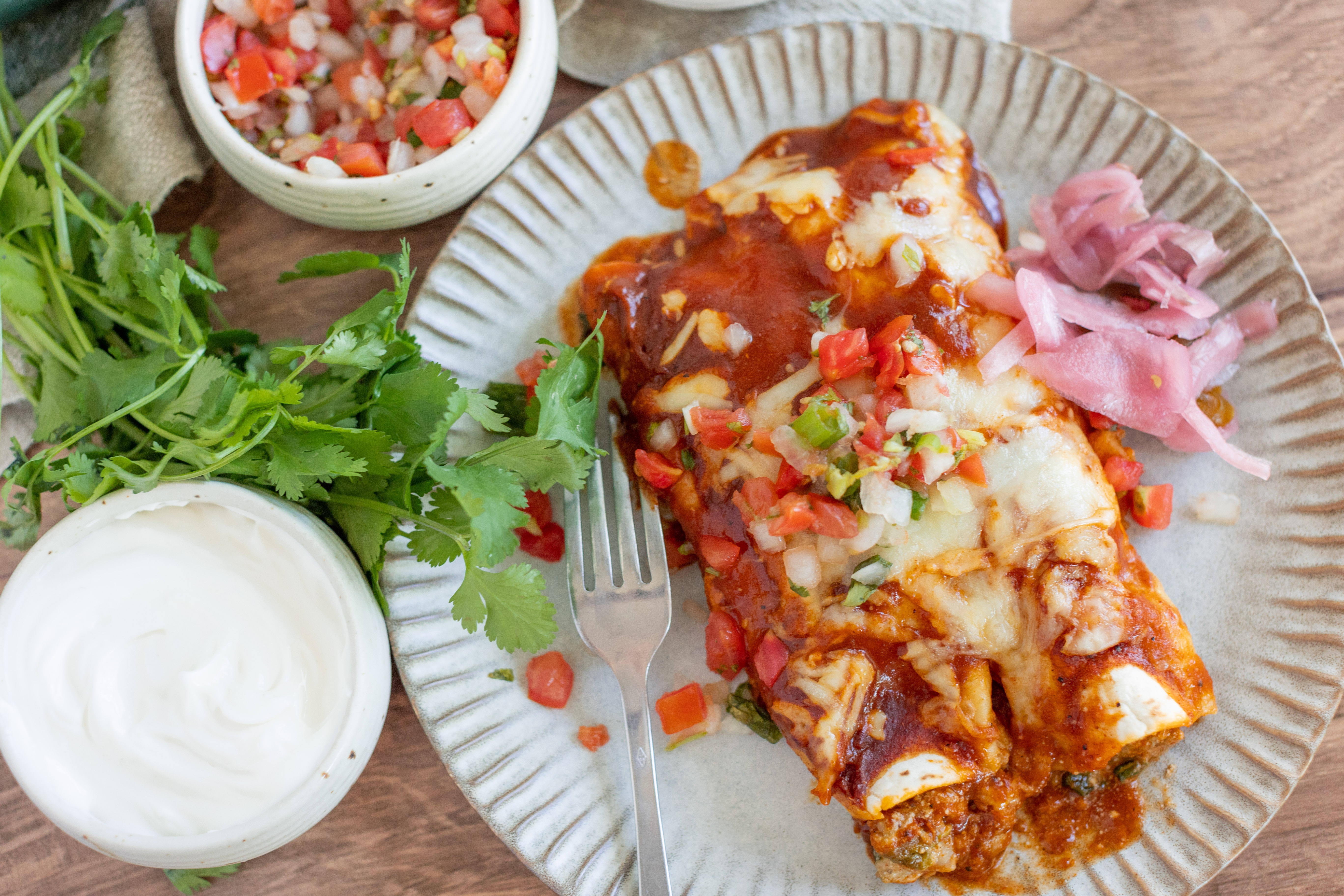 Mmmmm, Chicken & Spinach Enchiladas just sound great, don't they? Tender, savory chicken breasts and fresh spinach in a Tex-Mex blend of spices, with plenty of sour cream and cheese. And then wrapped in a tortilla, topped with enchilada sauce and even more cheese... yes, these Chicken & Spinach Enchiladas are the key to a good time. You'll be wrapped up in a great flavor after one bite!