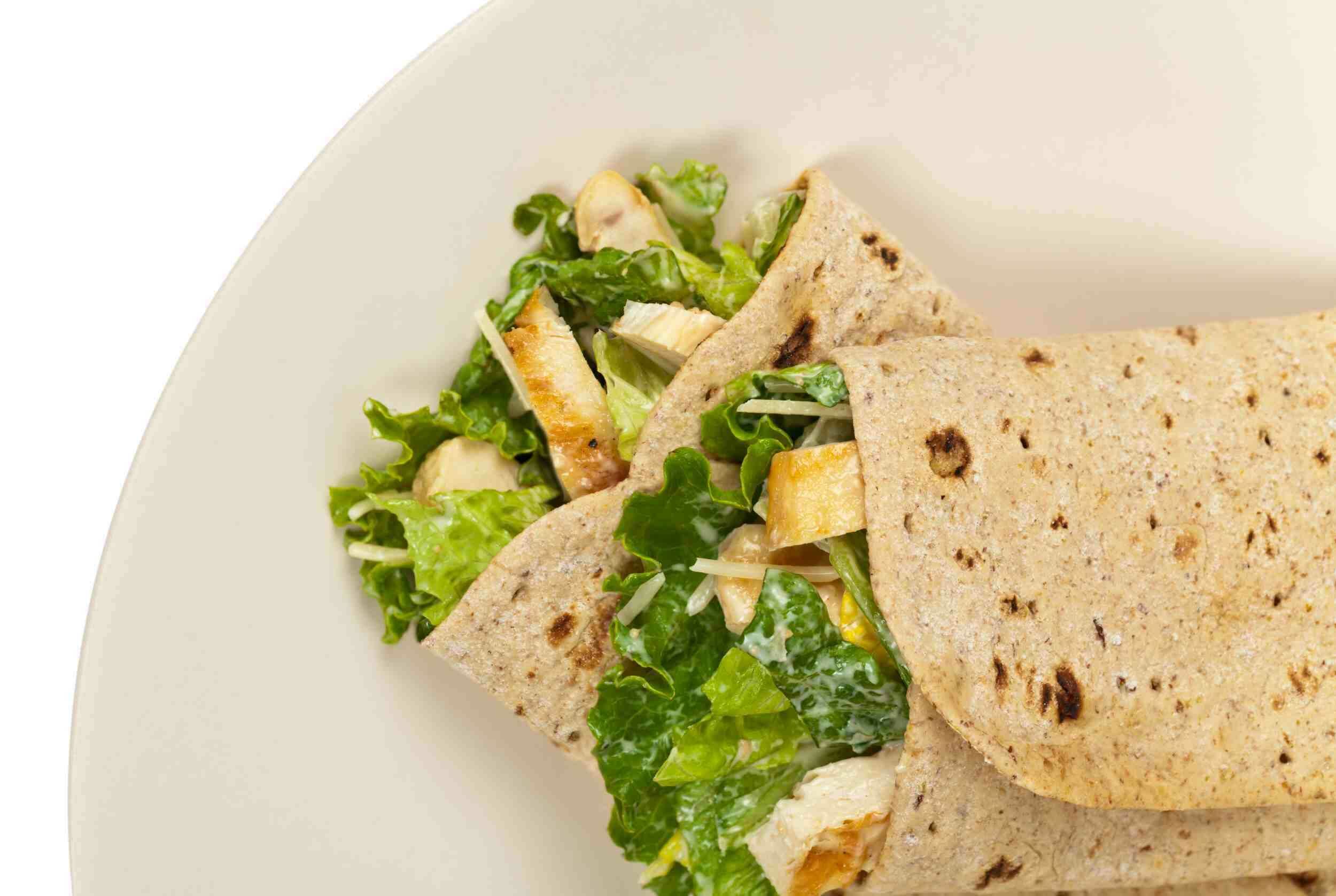 Chicken Caesar Wraps are perfect for whenever you need to quickly whip up a delicious meal on the go! These wraps take only 10 minutes to make, and they are so tasty you’ll want to make them for lunch on the regular. Each bite is full of crunchy lettuce, juicy chicken, sharp parmesan cheese, and creamy Caesar dressing. Lunch is served, and it’s Chicken Caesar Wraps!
