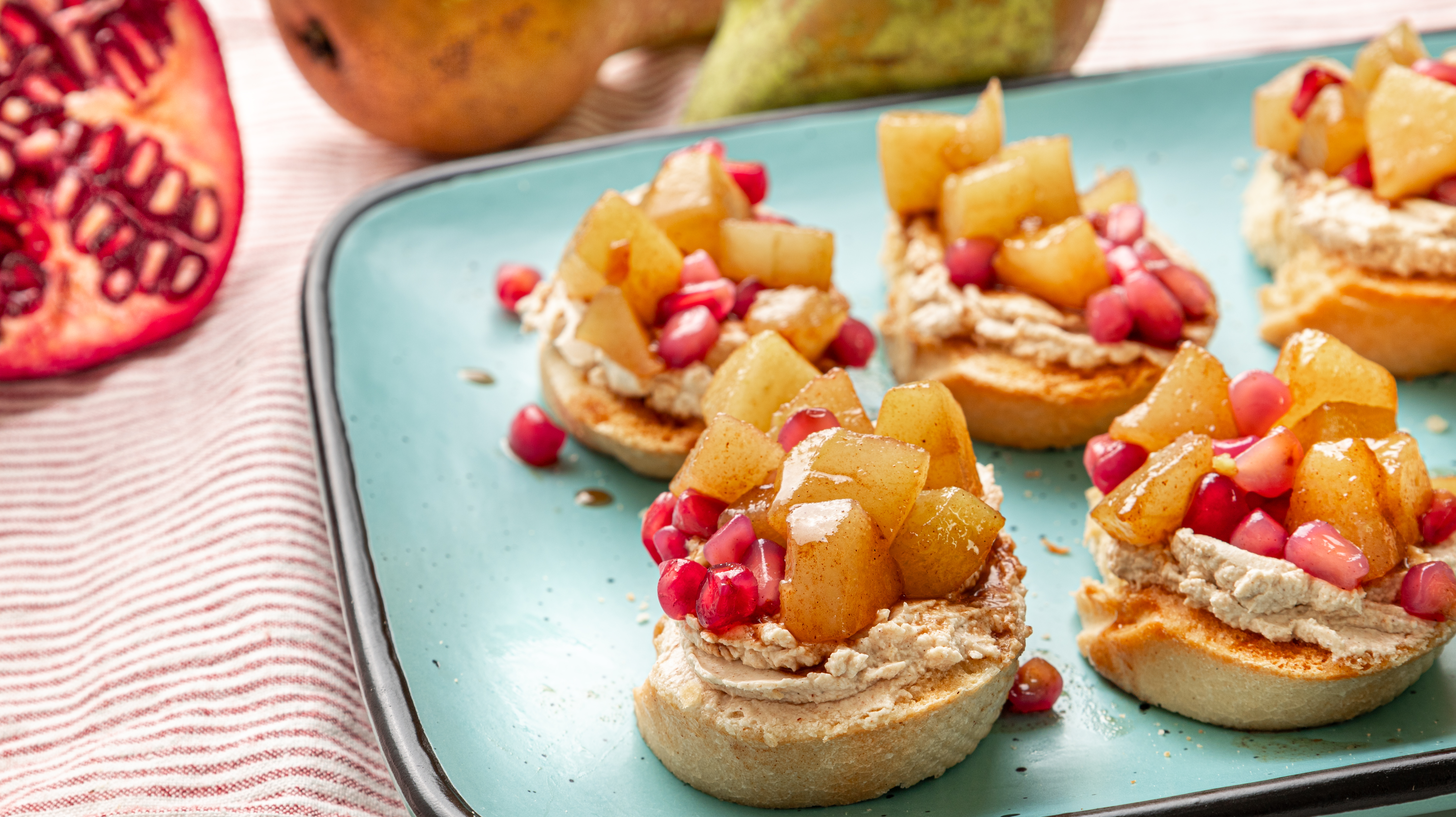 Are these hors d'oeuvres or are these desserts? Honestly, Christmas Crostini goes back and forth between the two! They might even be sweet appetizers! Toasted, buttery baguette slices with a luscious layer of cinnamon cream cheese and jammy, warm pears! Bursts of tart pomegranate and smoky balsamic make Christmas Crostini a balanced and enticing holiday treat! Ho Ho Ho! Have some more!