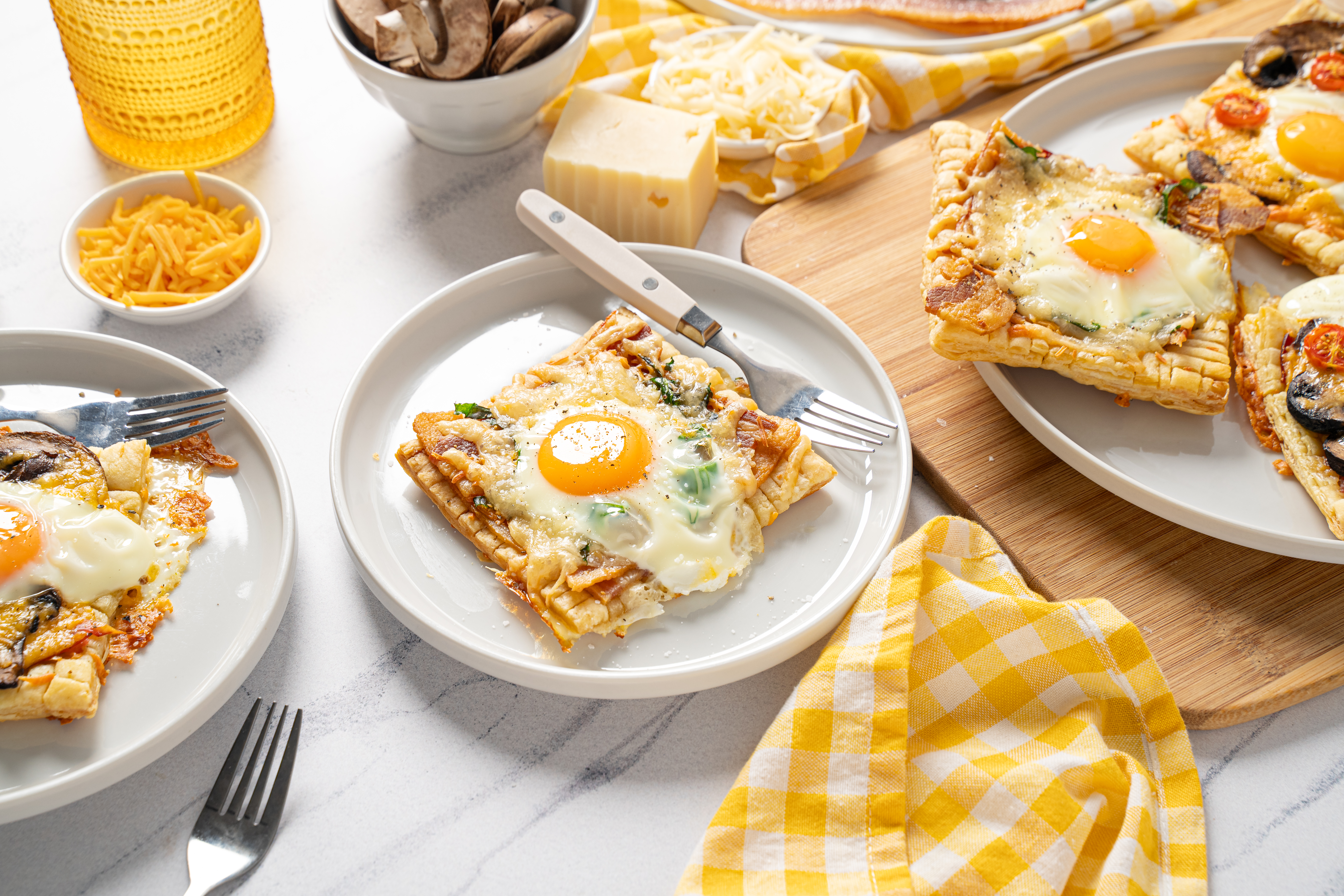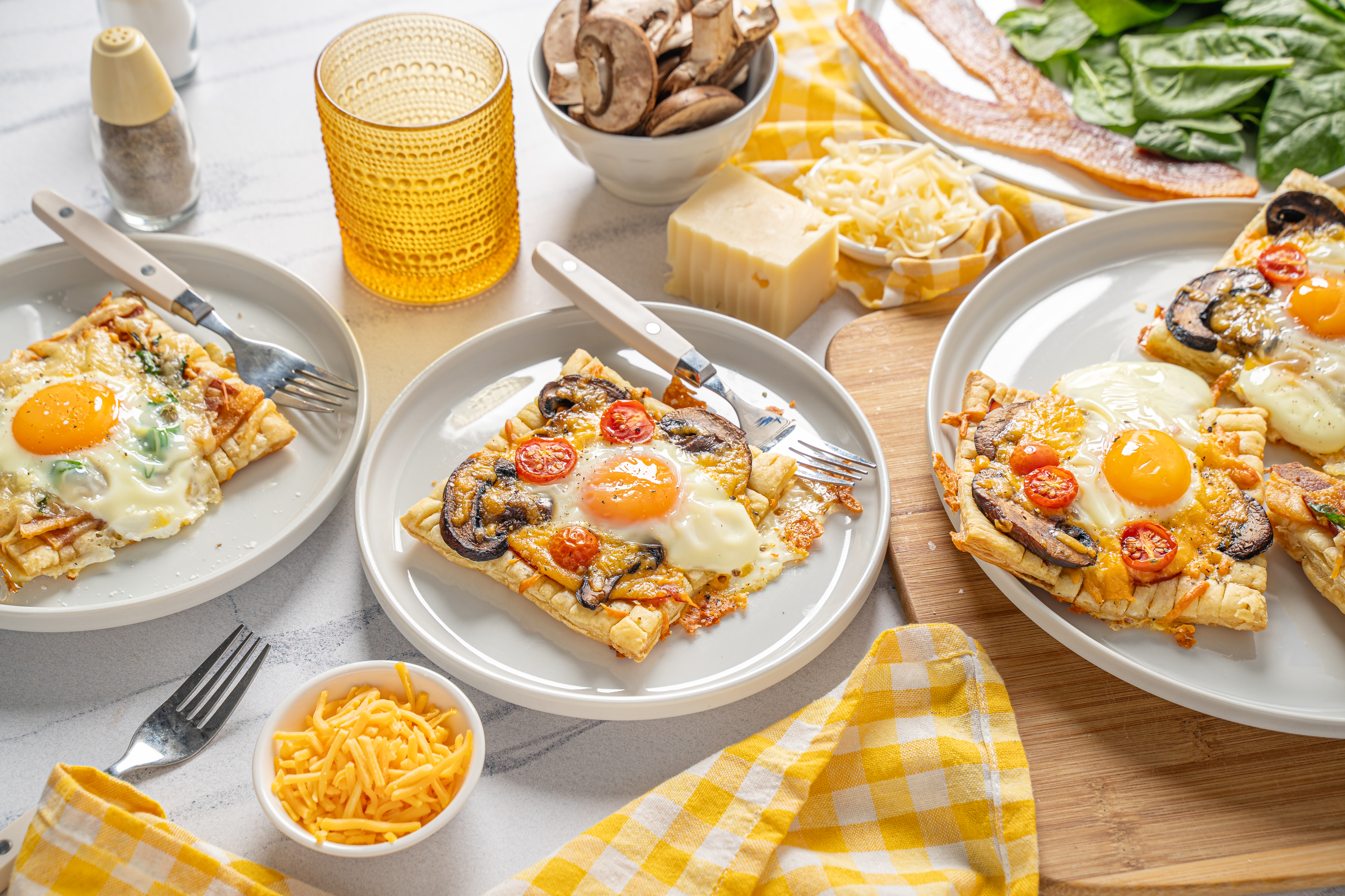 Remember how excited you used to get on Christmas Eve? You could hardly sleep because you just couldn't wait to see what Santa was going to leave under your tree. Well, now that you're older, there's a new reason for your sleepless anticipation and it's all because of these Christmas Morning Breakfast Pies! You'll run right past the gifts for a bite of the delightfully flaky pastries topped with crispy bacon, melty cheese, fresh spinach, tangy mushrooms, hearty ham, juicy tomatoes, and runny eggs. It's the gift that keeps on giving! Everyone, no matter their age, will get excited about Christmas Morning Breakfast Pies! Unwrap some tasty holiday goodness with your fork!