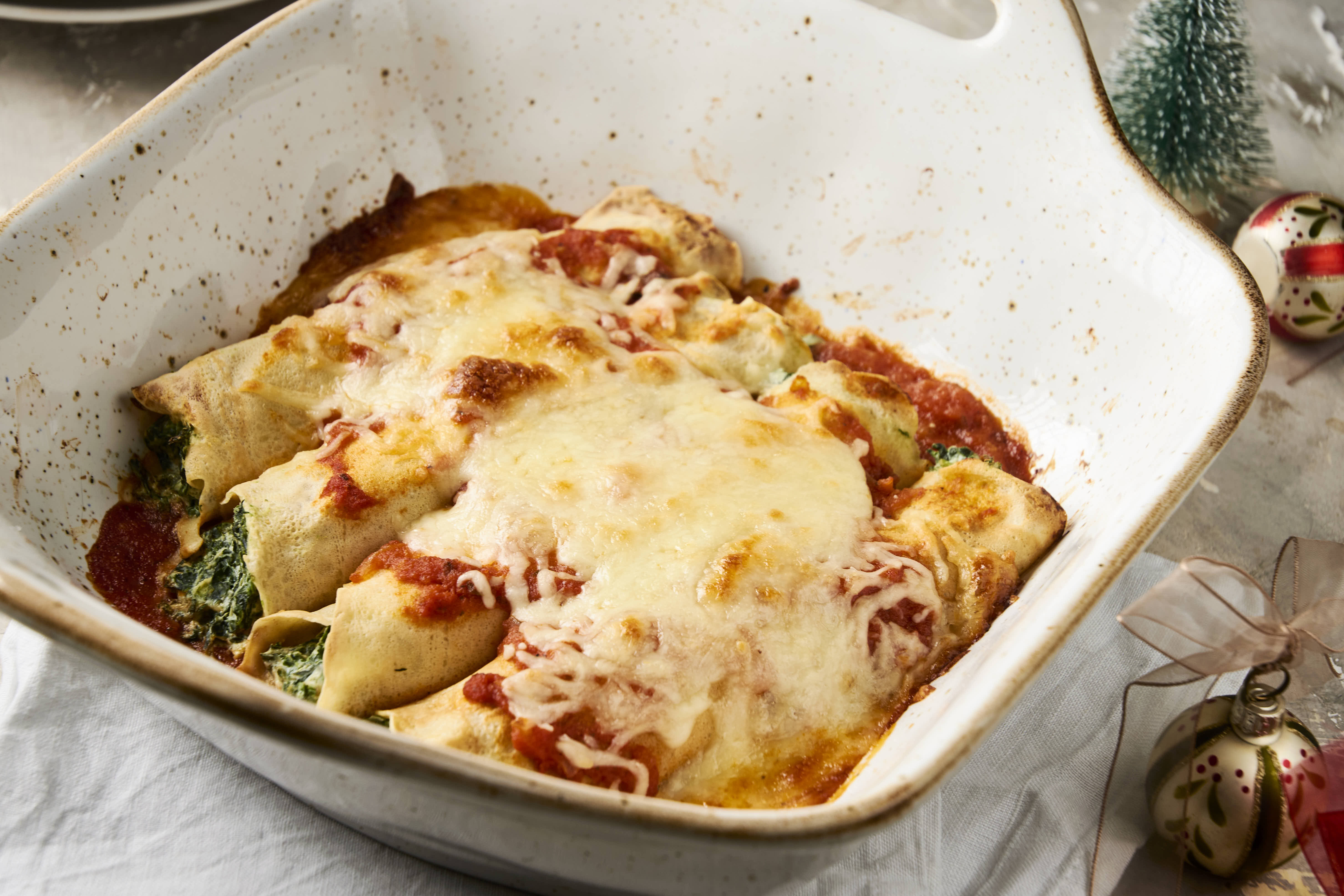 Psst. Hey. Here's the secret behind Christmas Night Manicotti... it's not actually made with manicotti. We know! Shocker! Instead, Christmas Night Manicotti serves up extra-tender, golden crêpes. We all love pasta, of course, but doesn't that just sound even better than pasta? Of course, it's not the non-pasta alone that makes Christmas Night Manicotti special. It stuffs itself full of tangy, cheesy, refreshing goodness! Slathered with rich tomato sauce and even more melty cheese, this dish really does pass out the festive fun!
