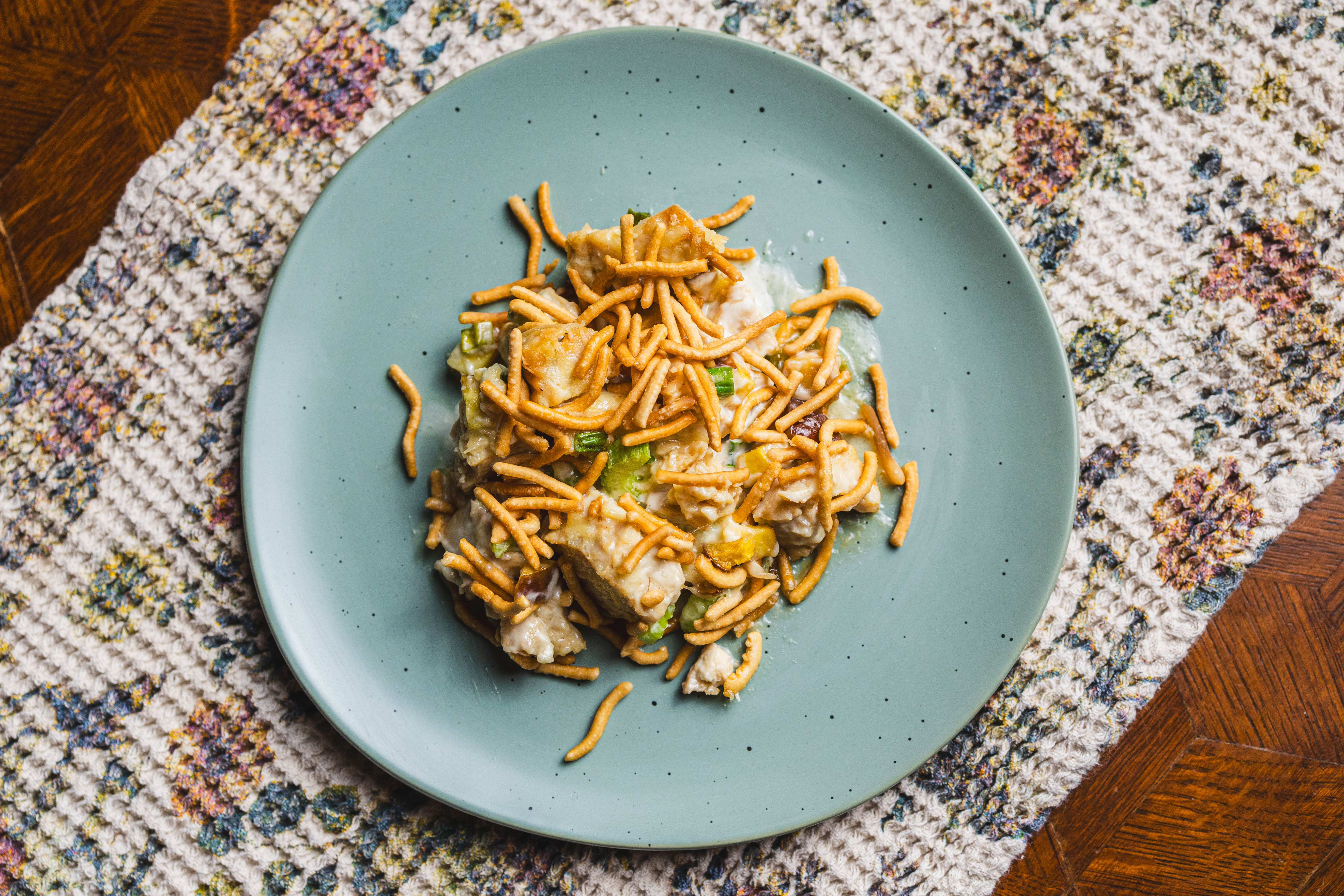Step 6 -Pour the chicken mixture into the prepared baking dish and sprinkle with the chow mein noodles.