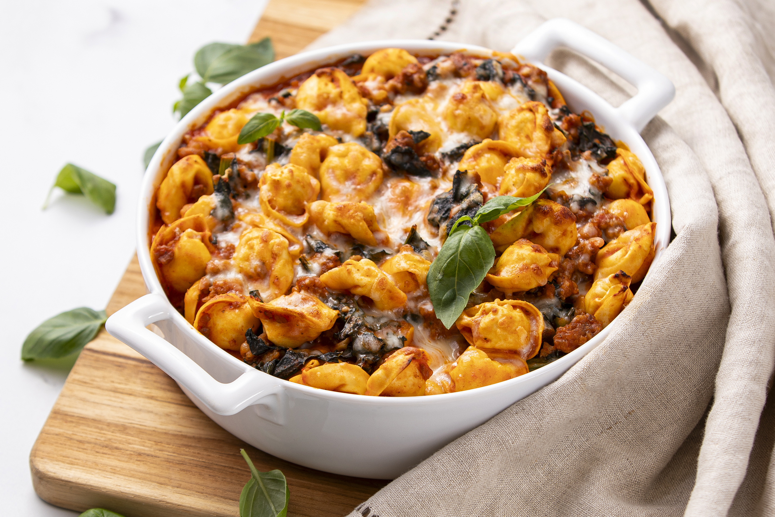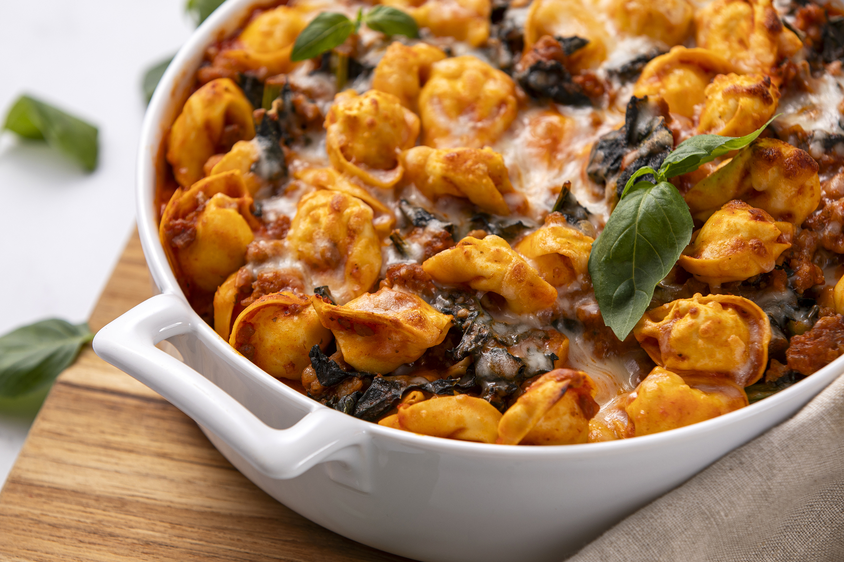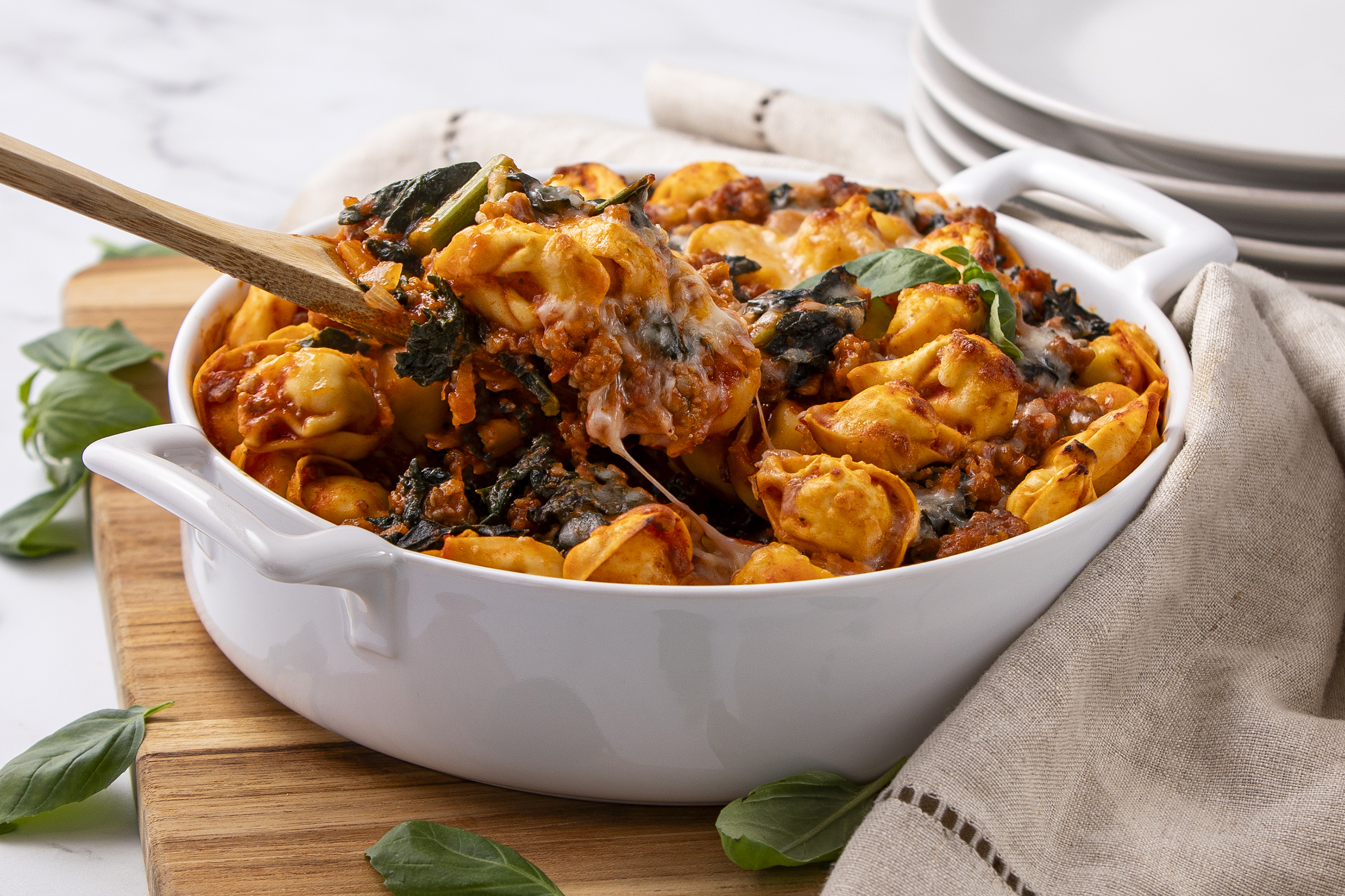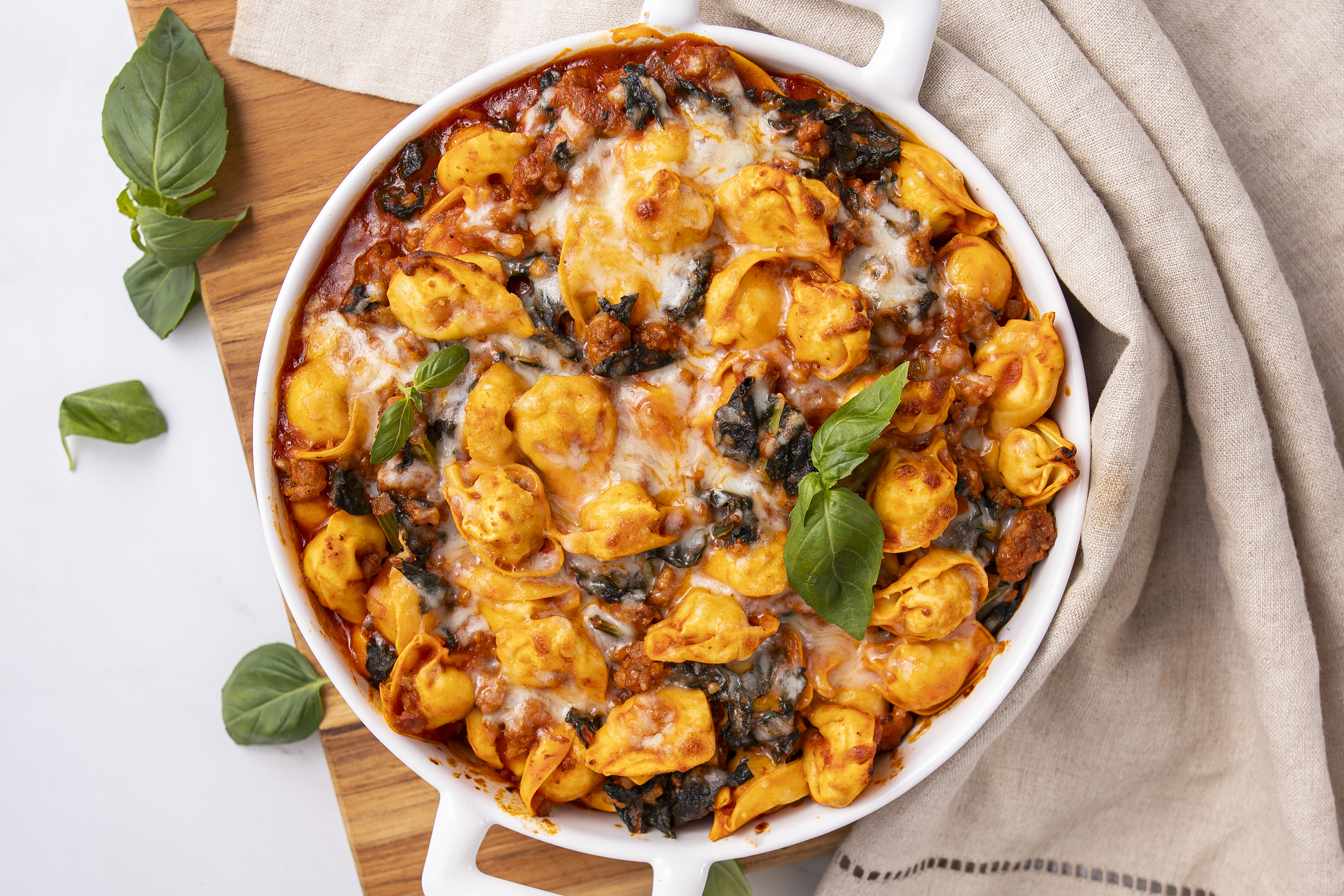 A one-skillet wonder to make it through those hectic evenings! Comforting Tortellini Casserole is ready to put your mind and your family's hunger at ease. Savory Italian sausage, cheesy tortellini, and garden-fresh kale come together with a perfectly seasoned tomato sauce and melted mozzarella for a fork-full of fabulous tongue-tingling fun! Make your evening meals delicious again with this Comforting Tortellini Casserole!
