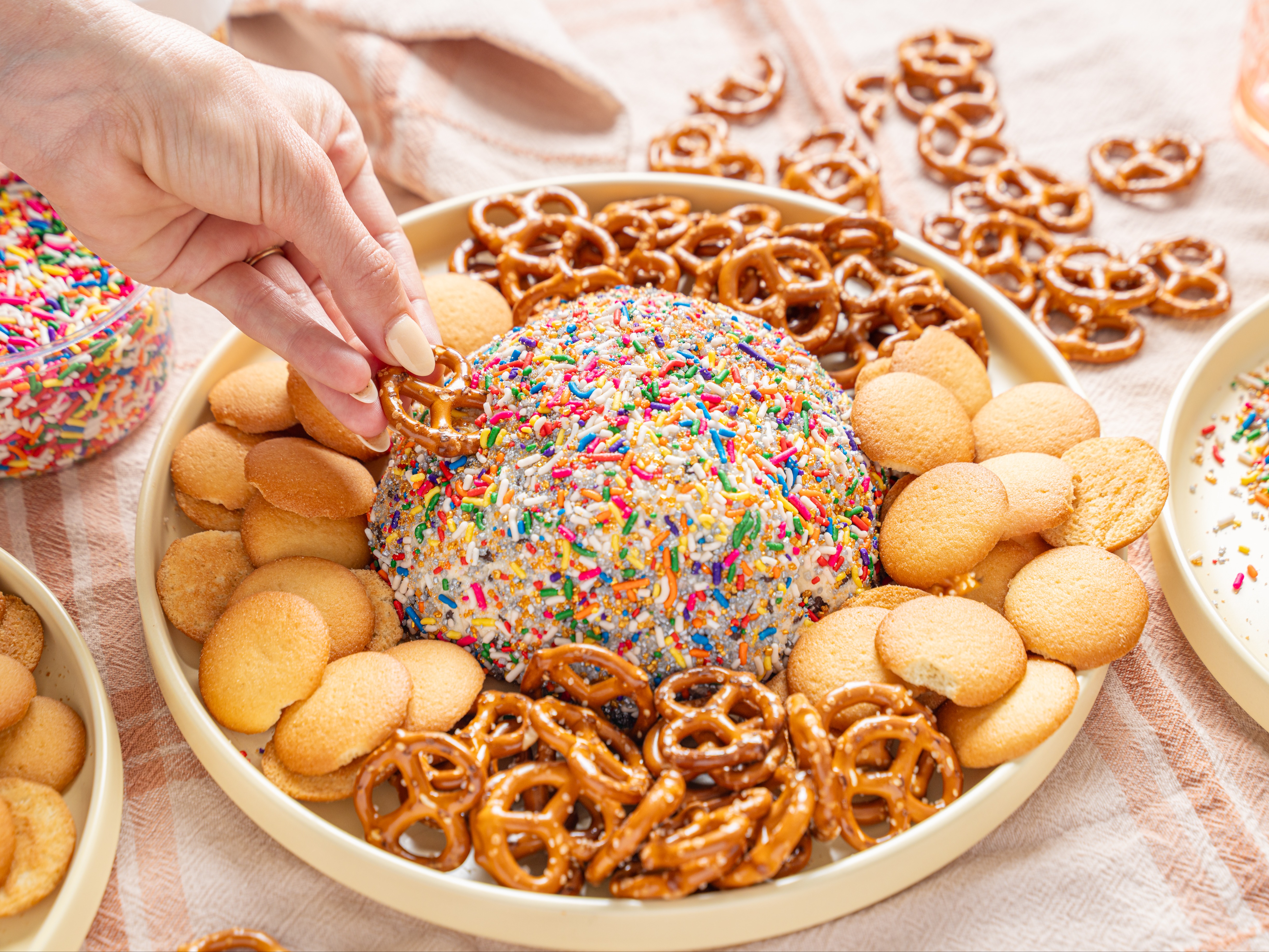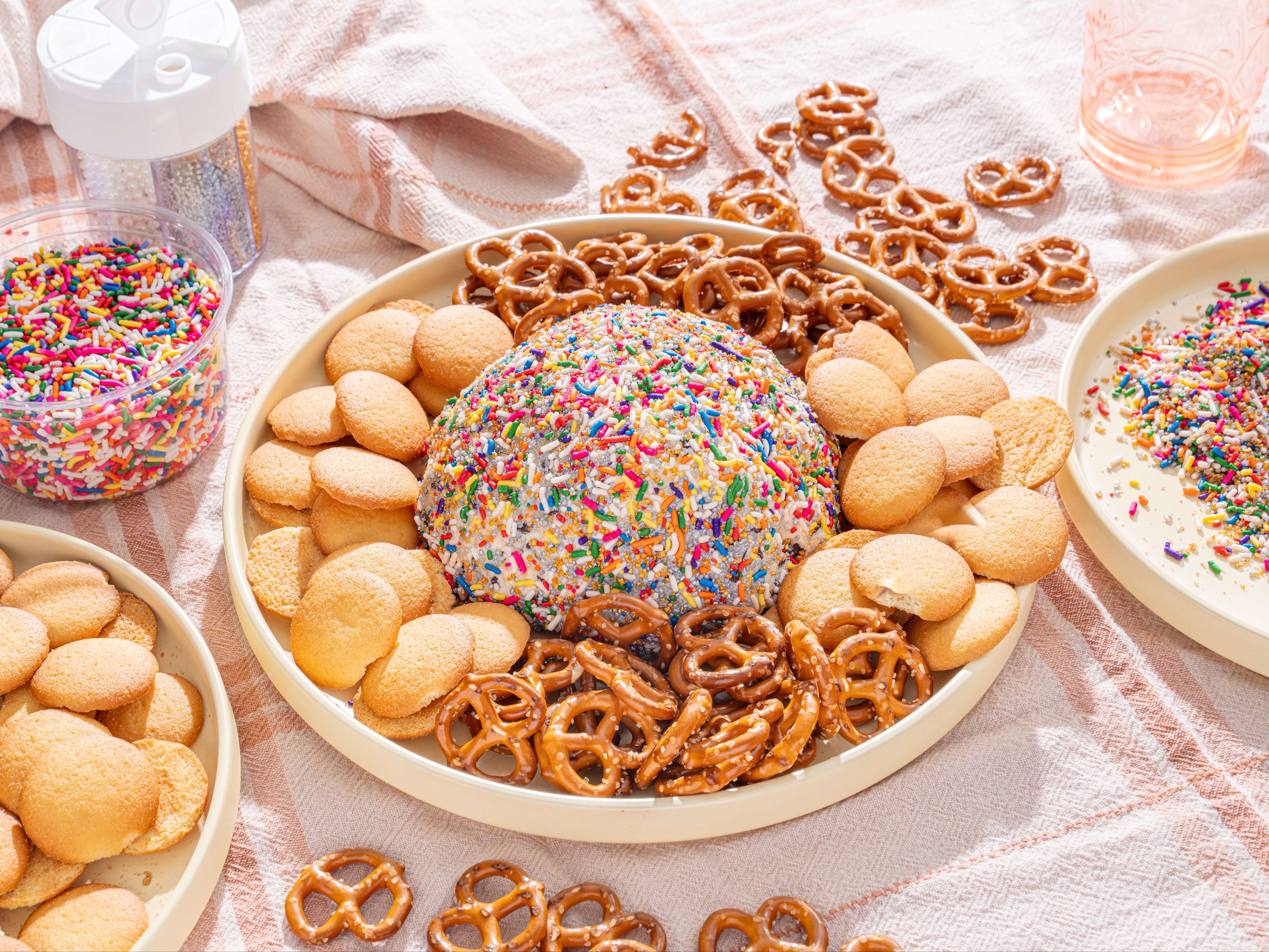 Step 8 -Unwrap the cookie dough ball and place it on a serving plate. Evenly cover it with the sprinkle mixture, pressing to adhere.