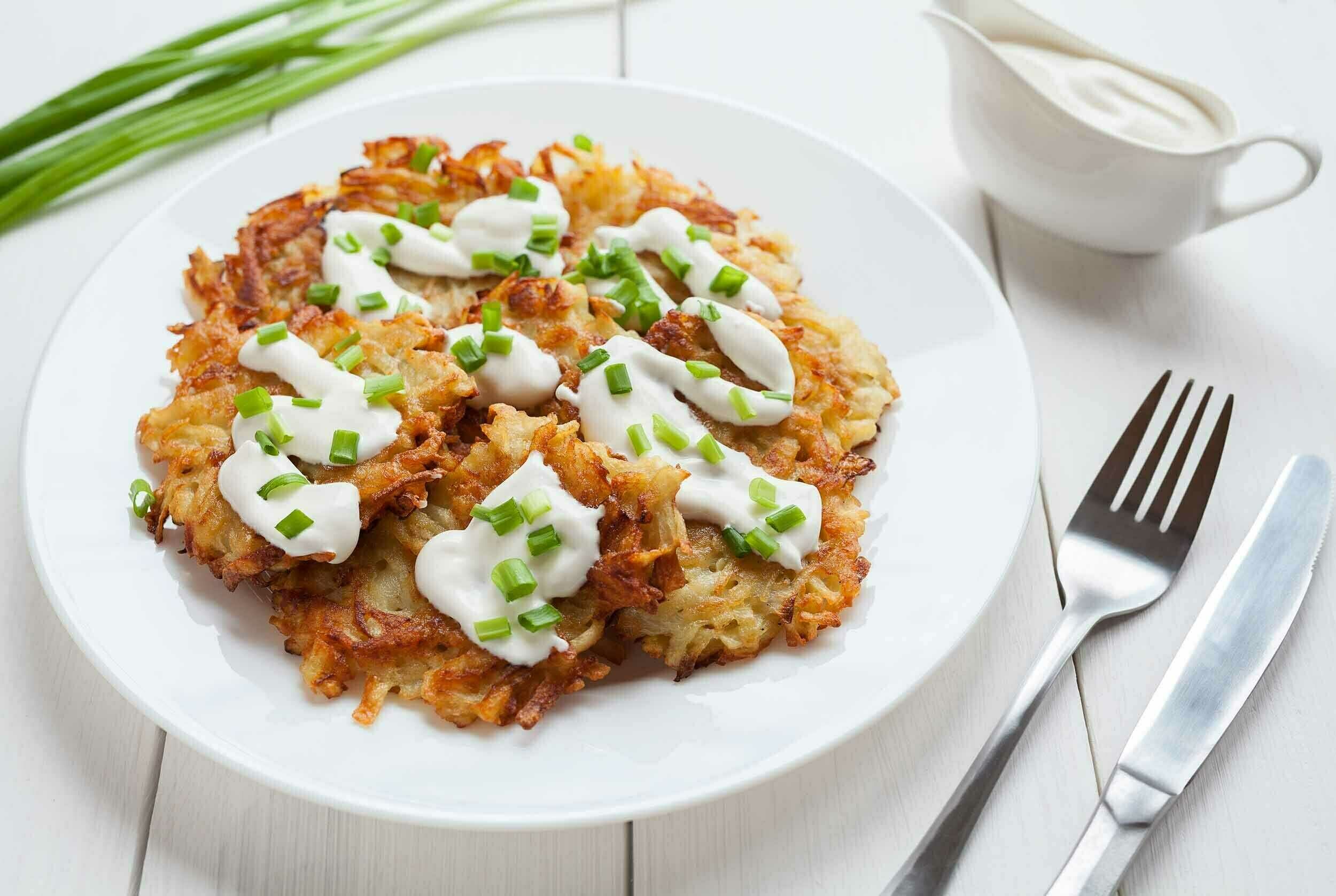 Country Potato Pancakes, also known as latkes, prove that pancakes don't have to be sweet to be amazing! Fluffy and hearty potatoes are transformed into crispy patties perfect for piling high with your favorite toppings, like tangy sour cream and jammy applesauce. You can serve up Country Potato Pancakes with eggs and coffee or eat them all on their own! You can even serve them alongside donuts for a true carbo-load of joy!