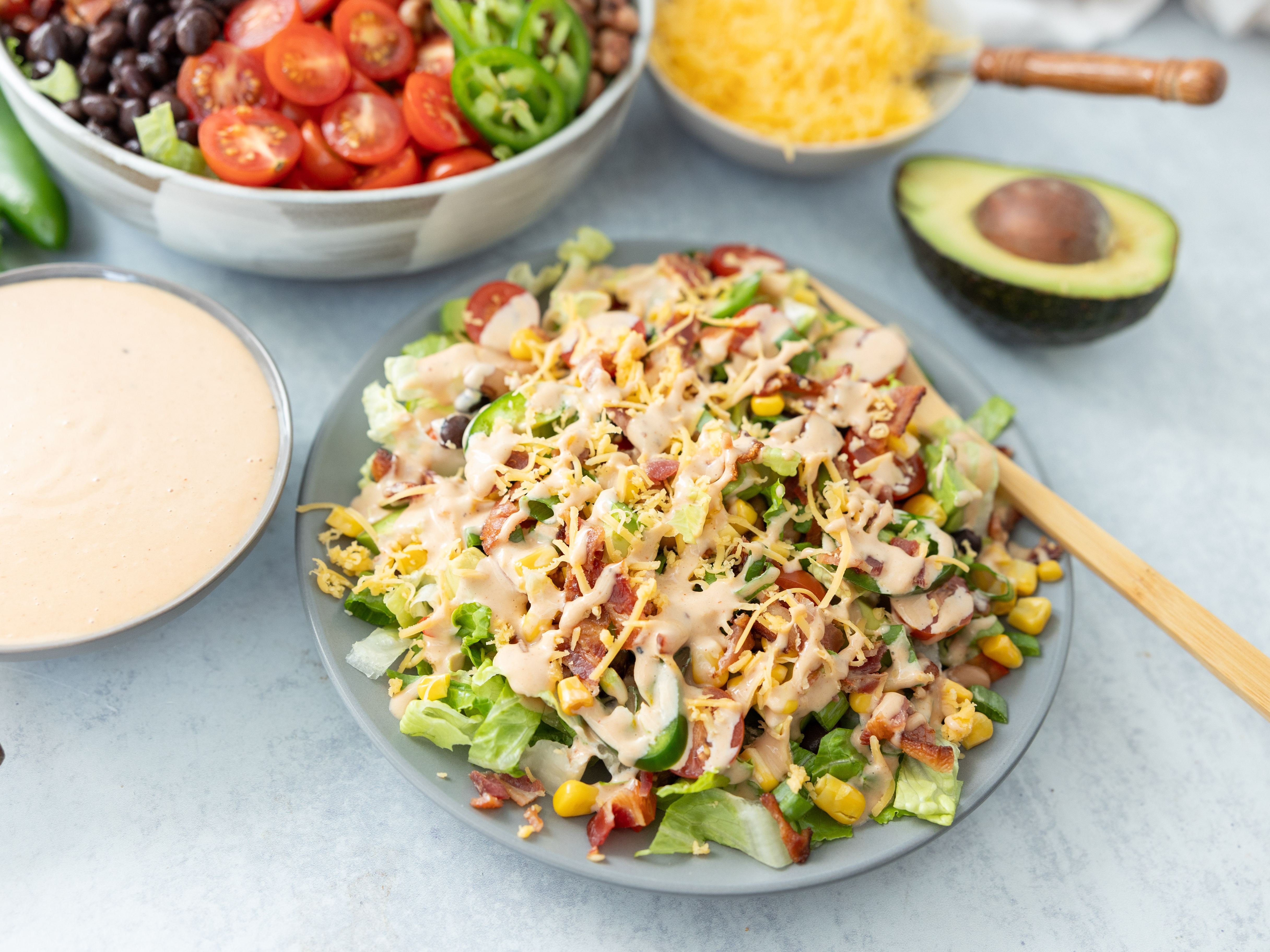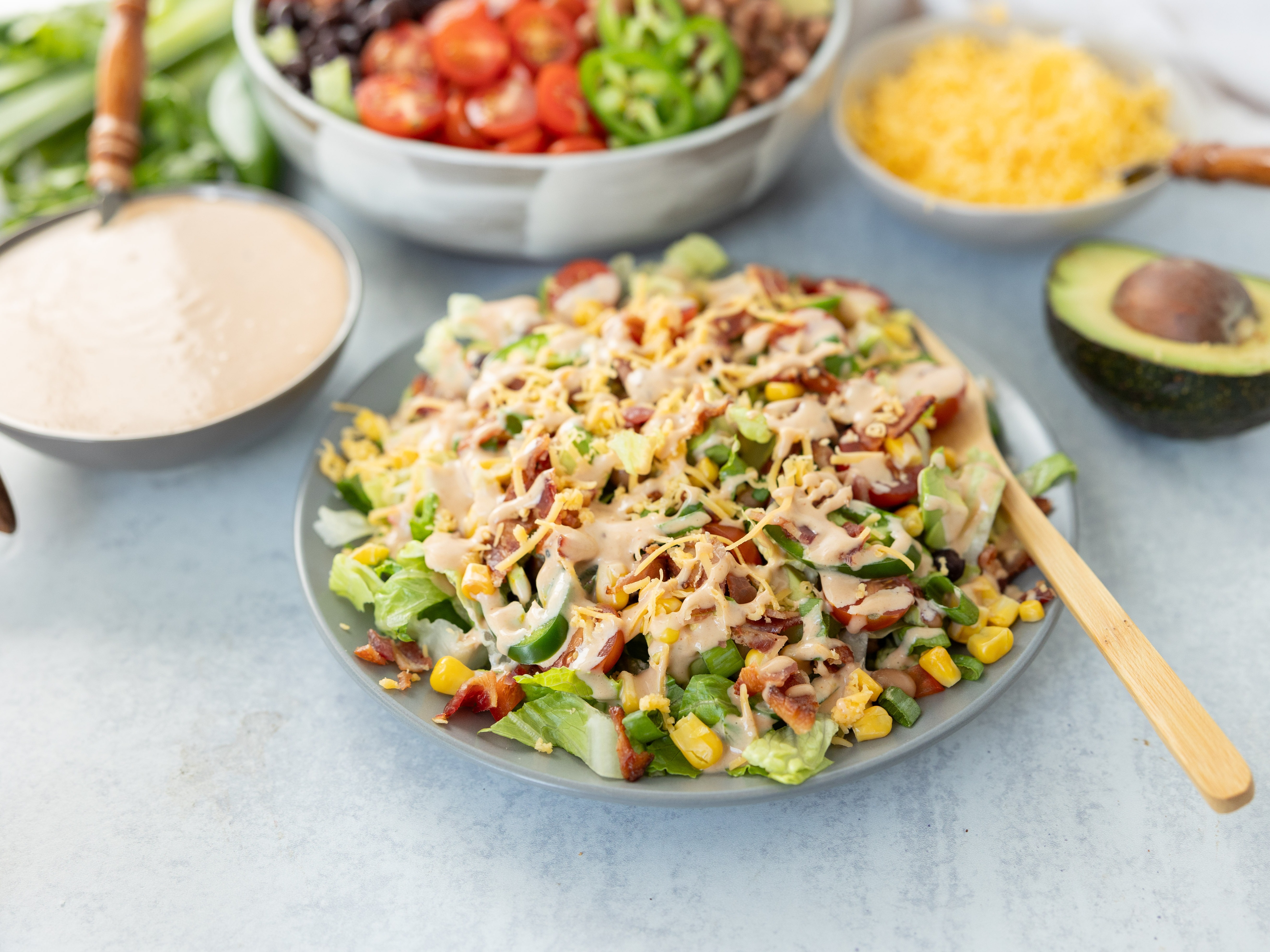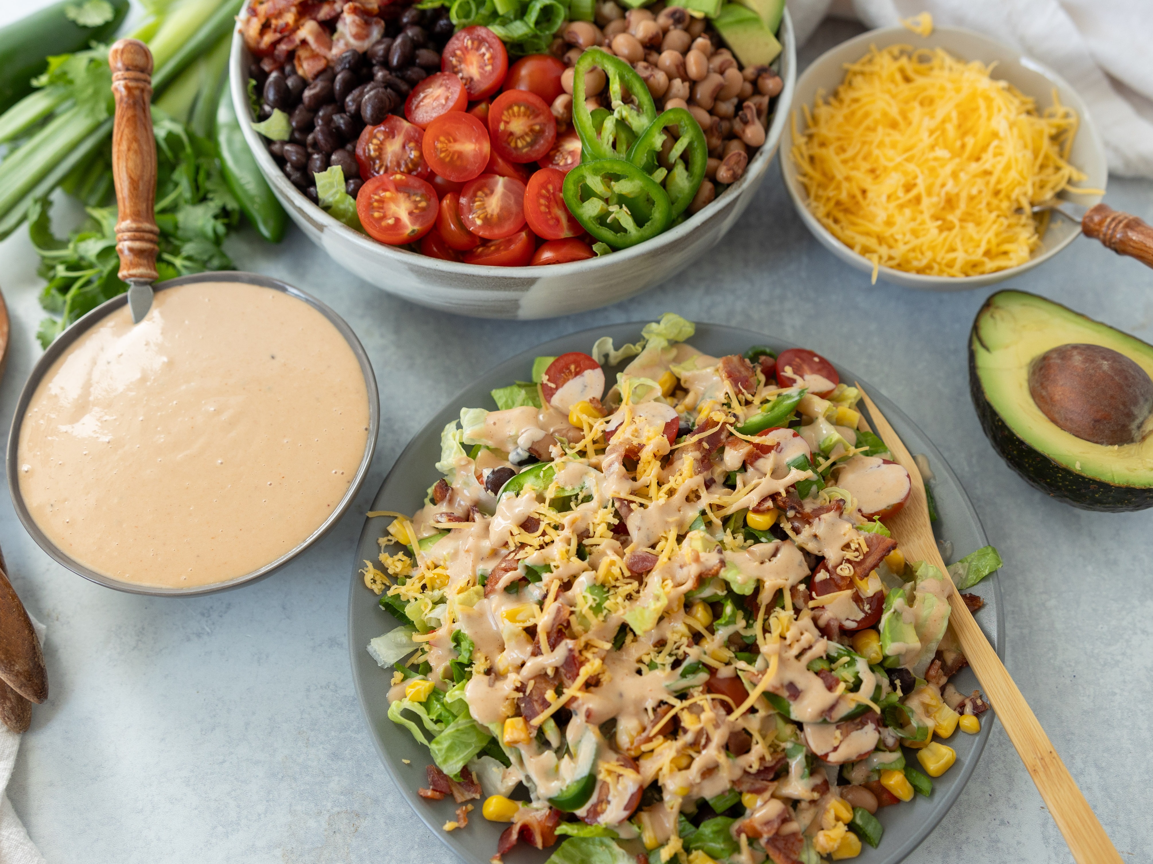 Giddy on up to the lunch table, partner! Cowboy Salad will lasso you in with all its hearty, tasty flavors and you'll be smitten forever. Fresh, crispy, and nourishing, it's the perfect pick-me-up after a long morning on the ranch (ahem, or the office). And you'll be head-over-boots for the creamy, tangy barbecue ranch dressing drizzled all over that you make yourself. Cowboy Salad is the one the whole corral will love!
