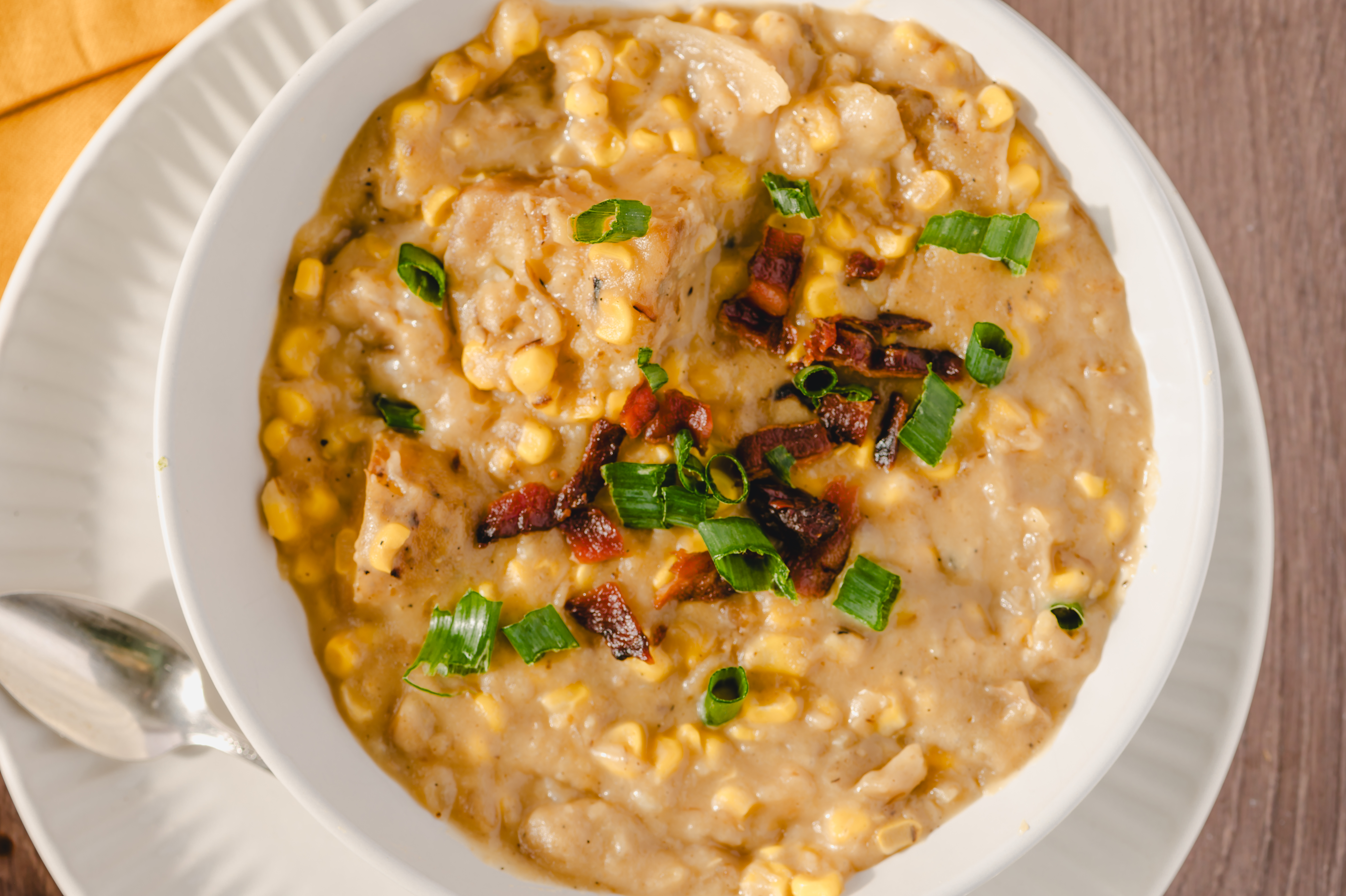 When the breeze is brisk, the bowl needs to be warm. Let Creamy Corn Chowder warm you from the inside out! Packed full of golden new potatoes and sweet corn in each creamy spoonful, every bite is more comforting than the last. Add some crumbled bacon and sliced scallions, and this Creamy Corn Chowder will reach optimal soup perfection. Warm up to a bowl... even two!