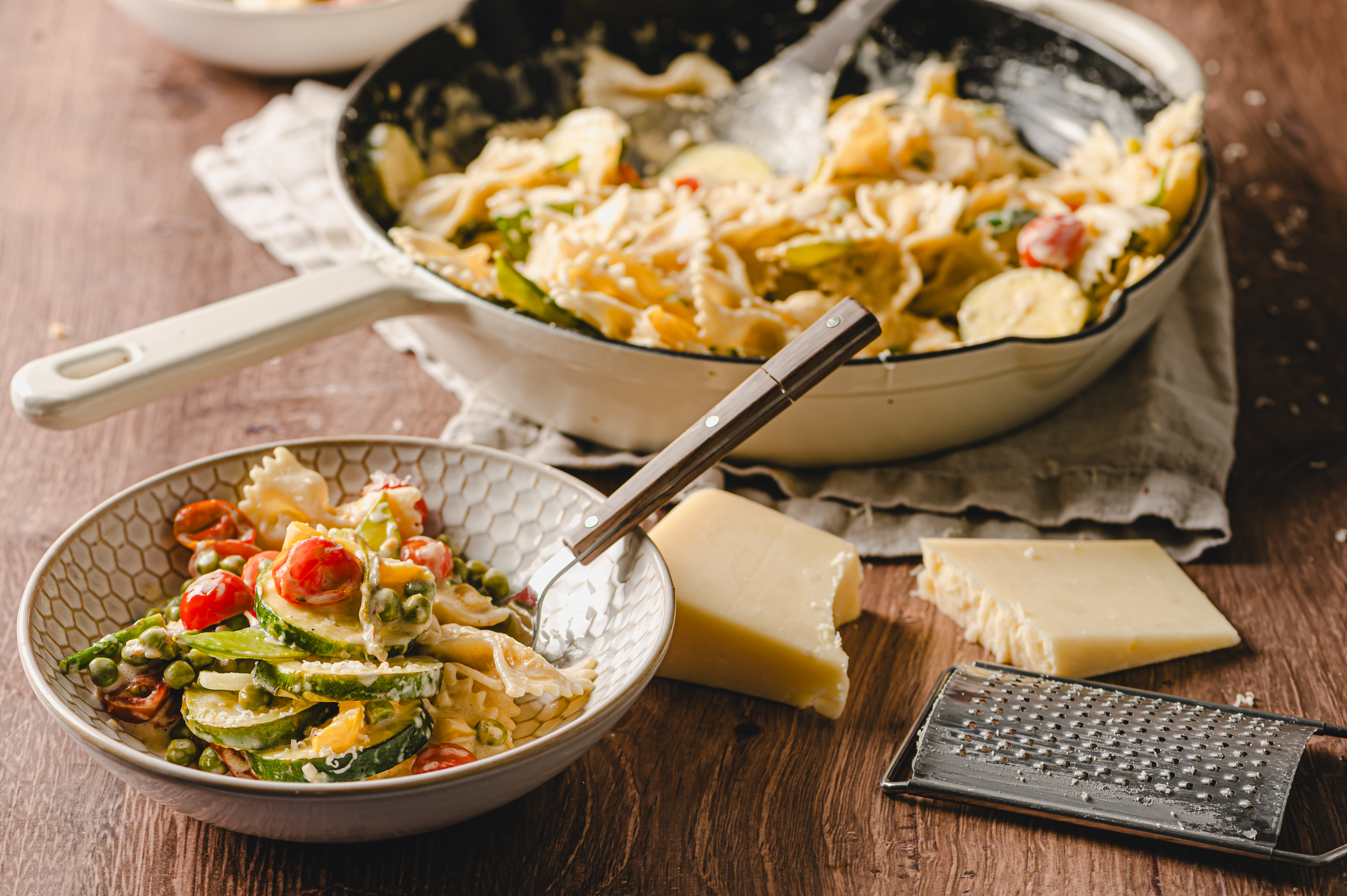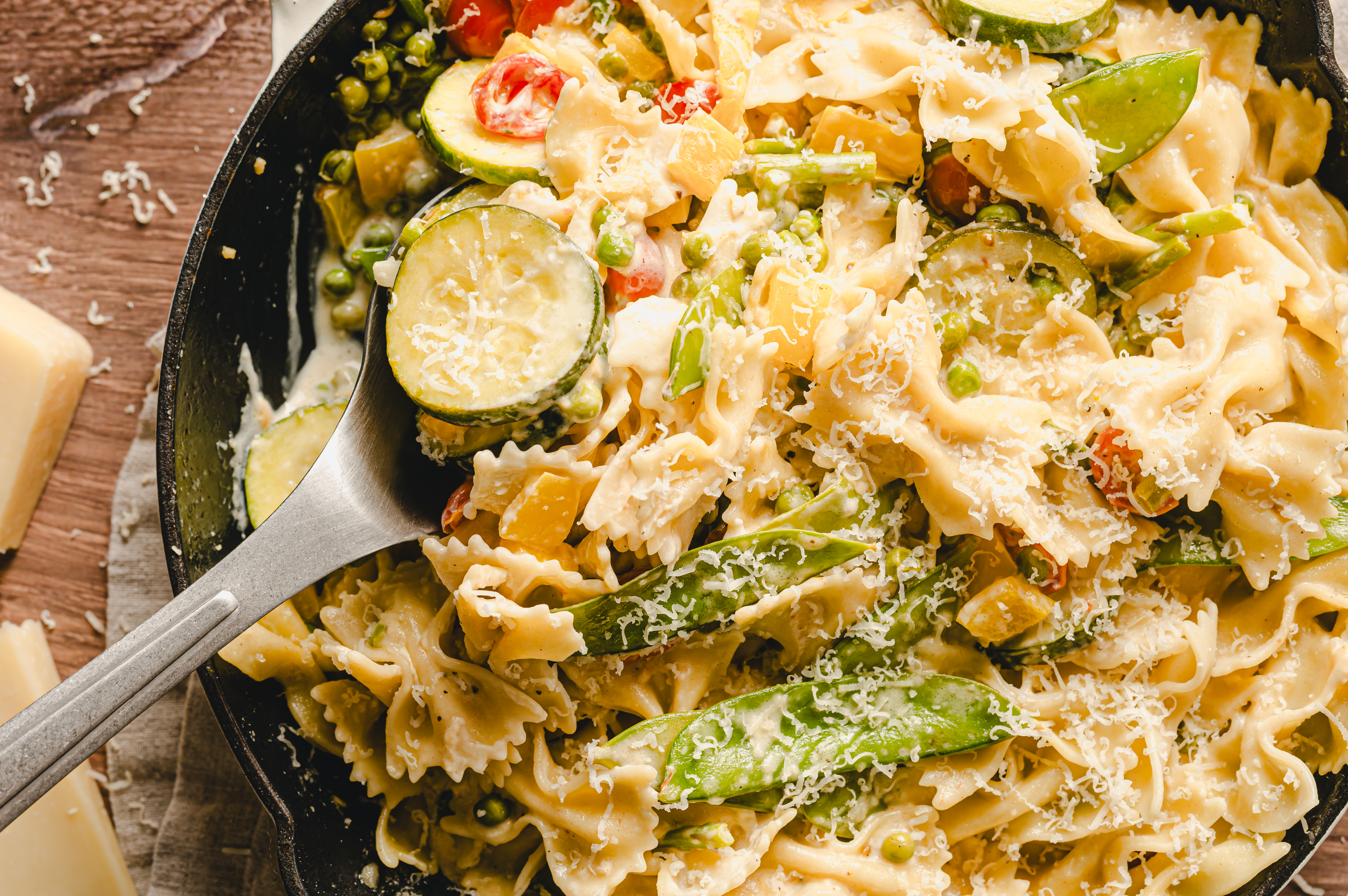 If you are going meat-free or even if you're not, this is the delicious main dish you've been searching for! Creamy Pasta Primavera takes some of the veggies you love and mixes it up a bit. Al dente pasta joins forces with the veggie gang — zucchini, asparagus, bell peppers, cherry tomatoes, and snow peas — in a creamy parmesan sauce for a delectable pasta treat you won't soon forget. Creamy Pasta Primavera fills in all the gaps of the great, fresh taste you crave. Remember to always eat your veggies!