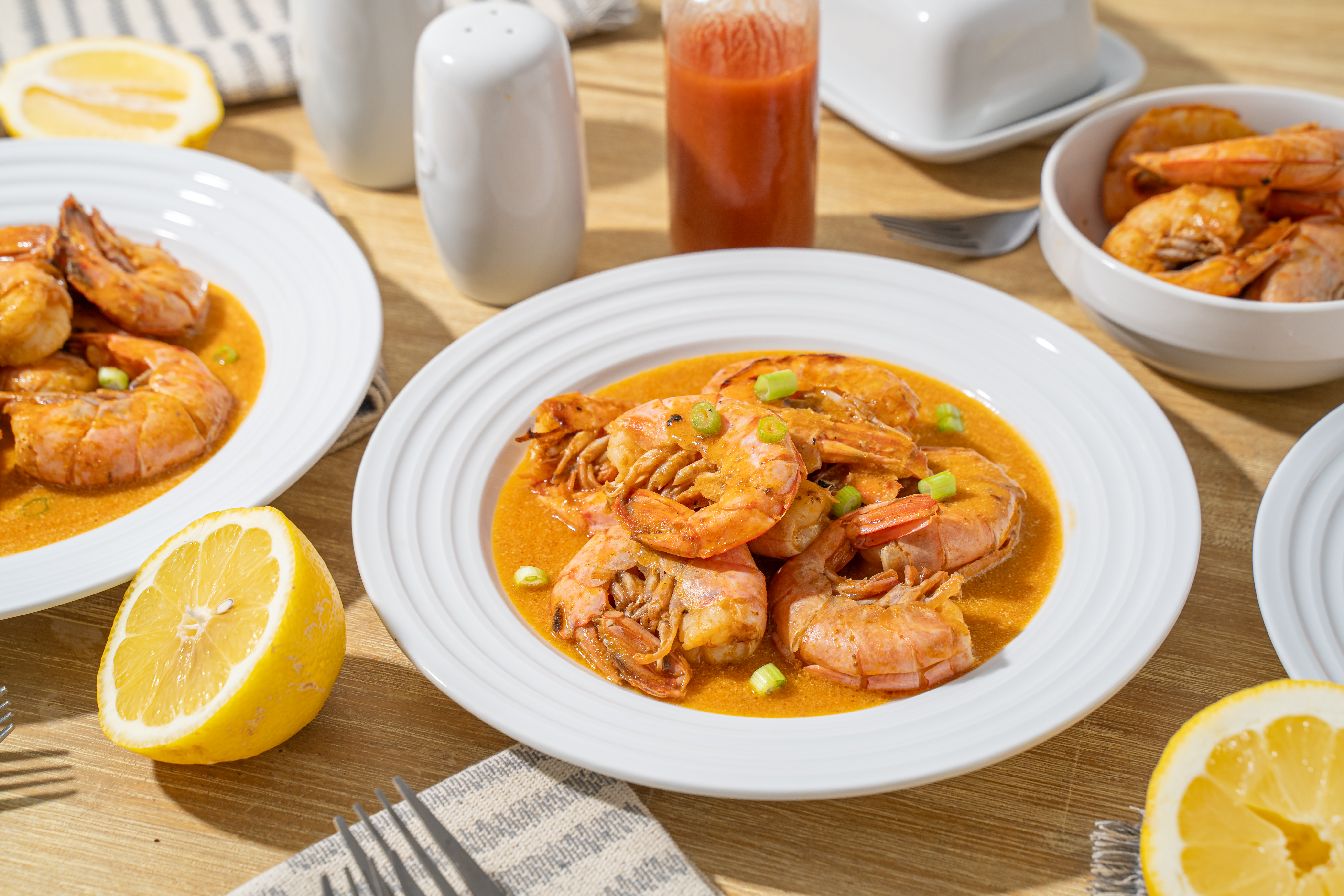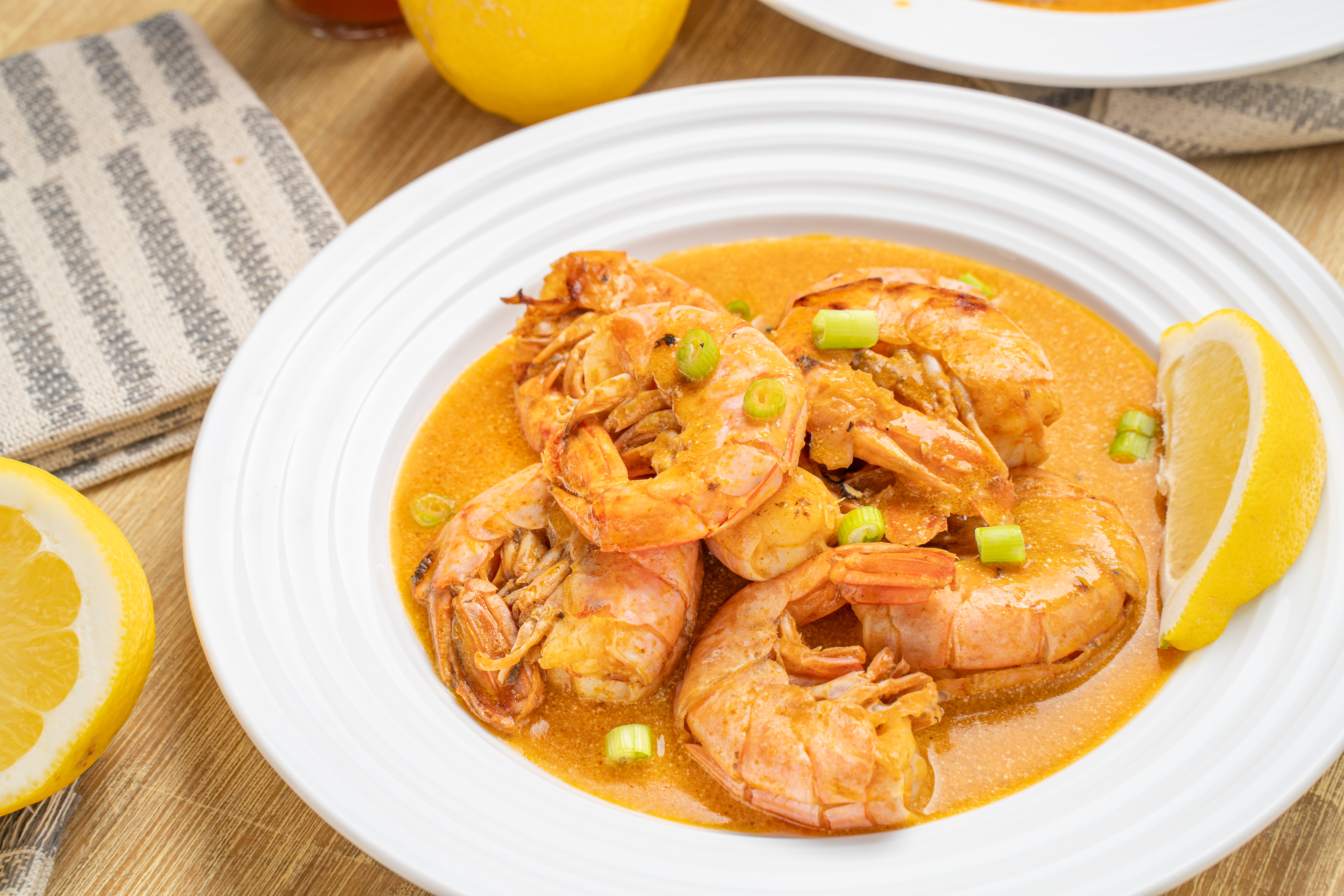 Step 11 -Garnish with the green onions and the extra lemon wedges and serve. Discard the shells and the heads before eating.