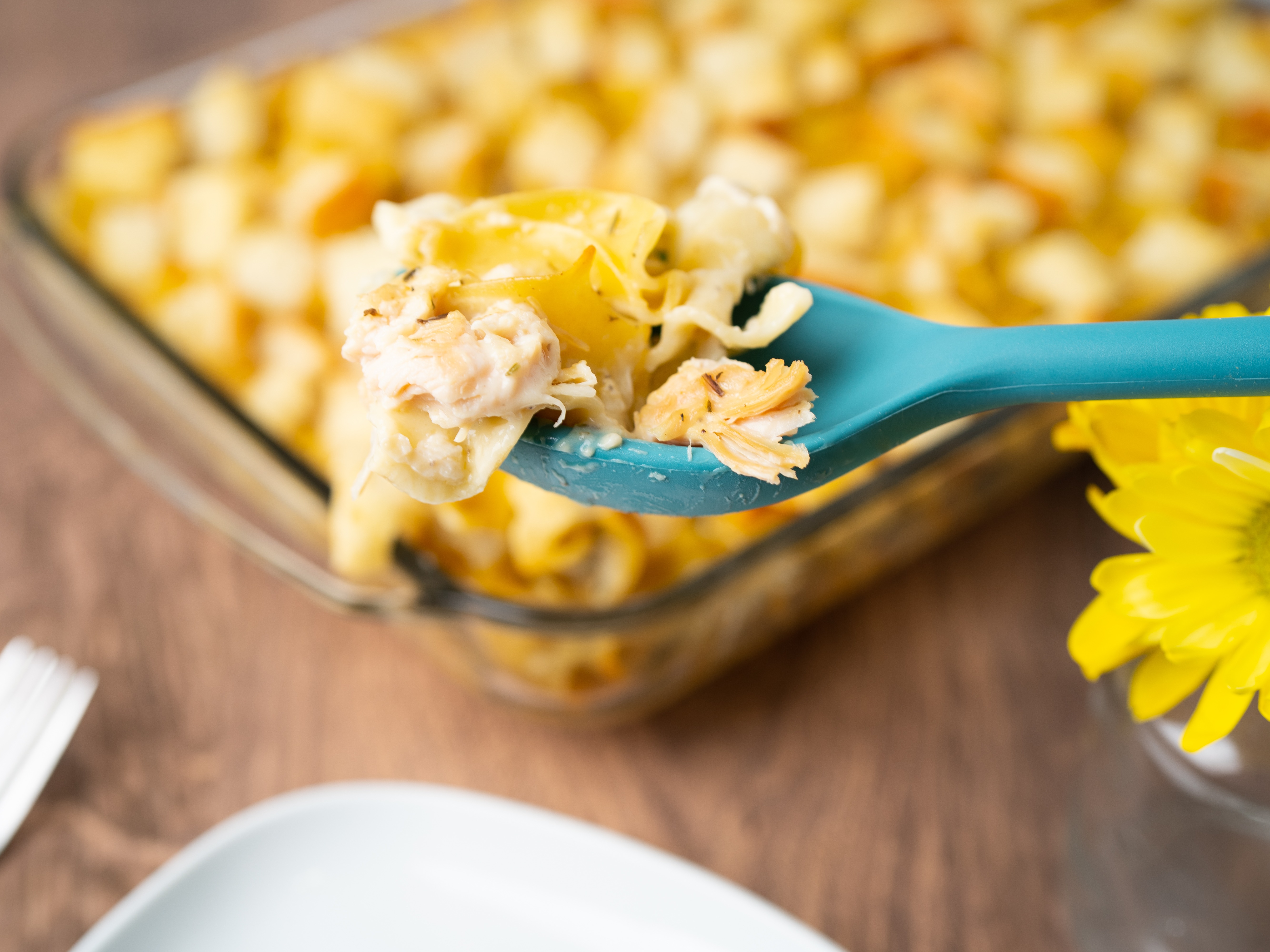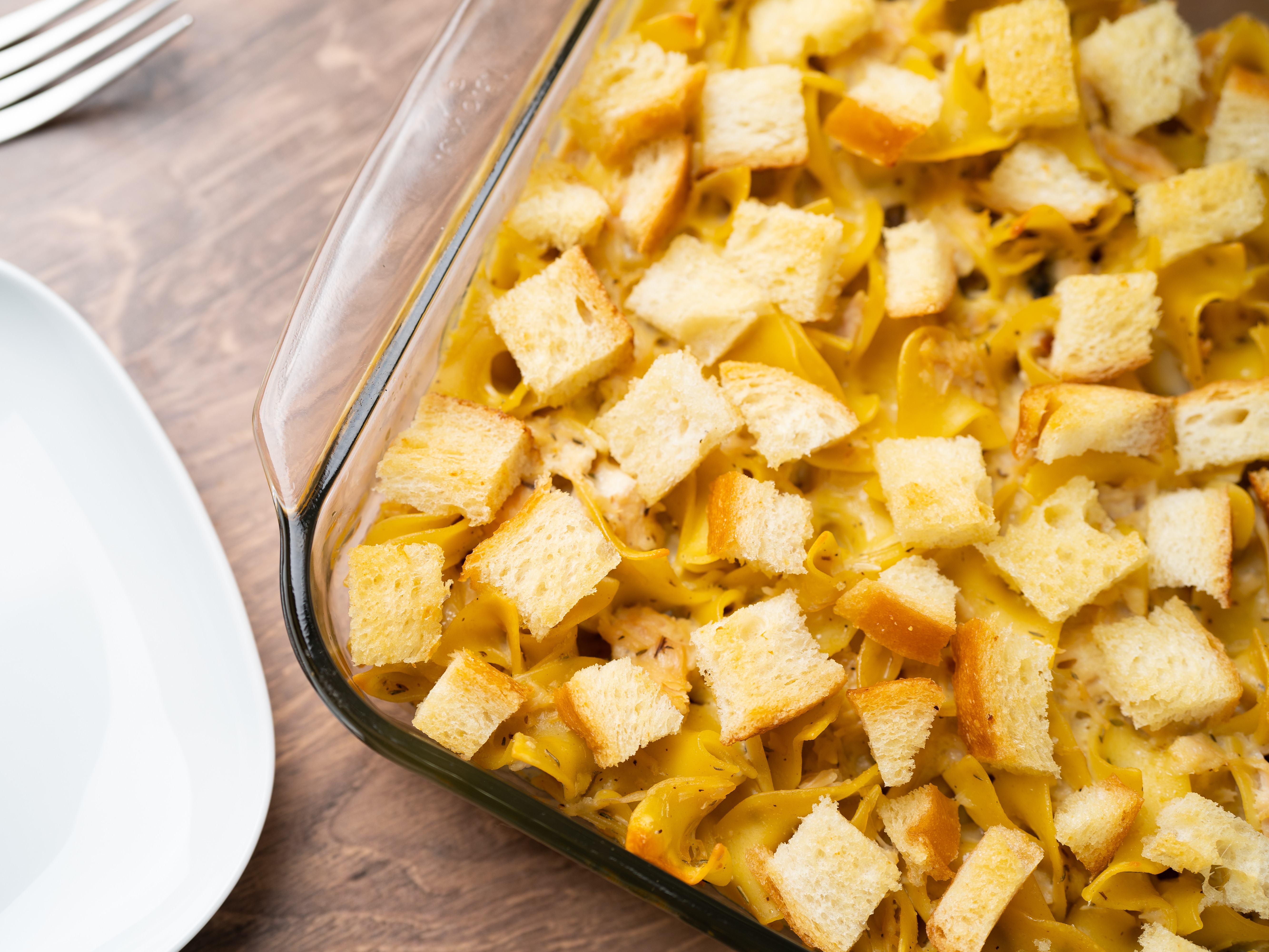 We've all been there: opening up the pantry, searching through all the cans, trying to figure out what exactly to make for dinner. No one wants to have to keep running out to the grocery store because they're missing some crucial ingredient for their desired dish. The Cupboard Casserole solves the problem by using only ingredients you could expect to find in your cupboard: egg noodles, cream soups, canned chicken, and some bread. The result is a creamy, savory, hearty dish with plenty of chicken flavor among the tender pasta and the crunchy, buttery bread topping. Cupboard Casserole is ready in just half an hour or less and makes enough for everyone, so you can stop agonizing about what to eat and focus on just enjoying dinner!