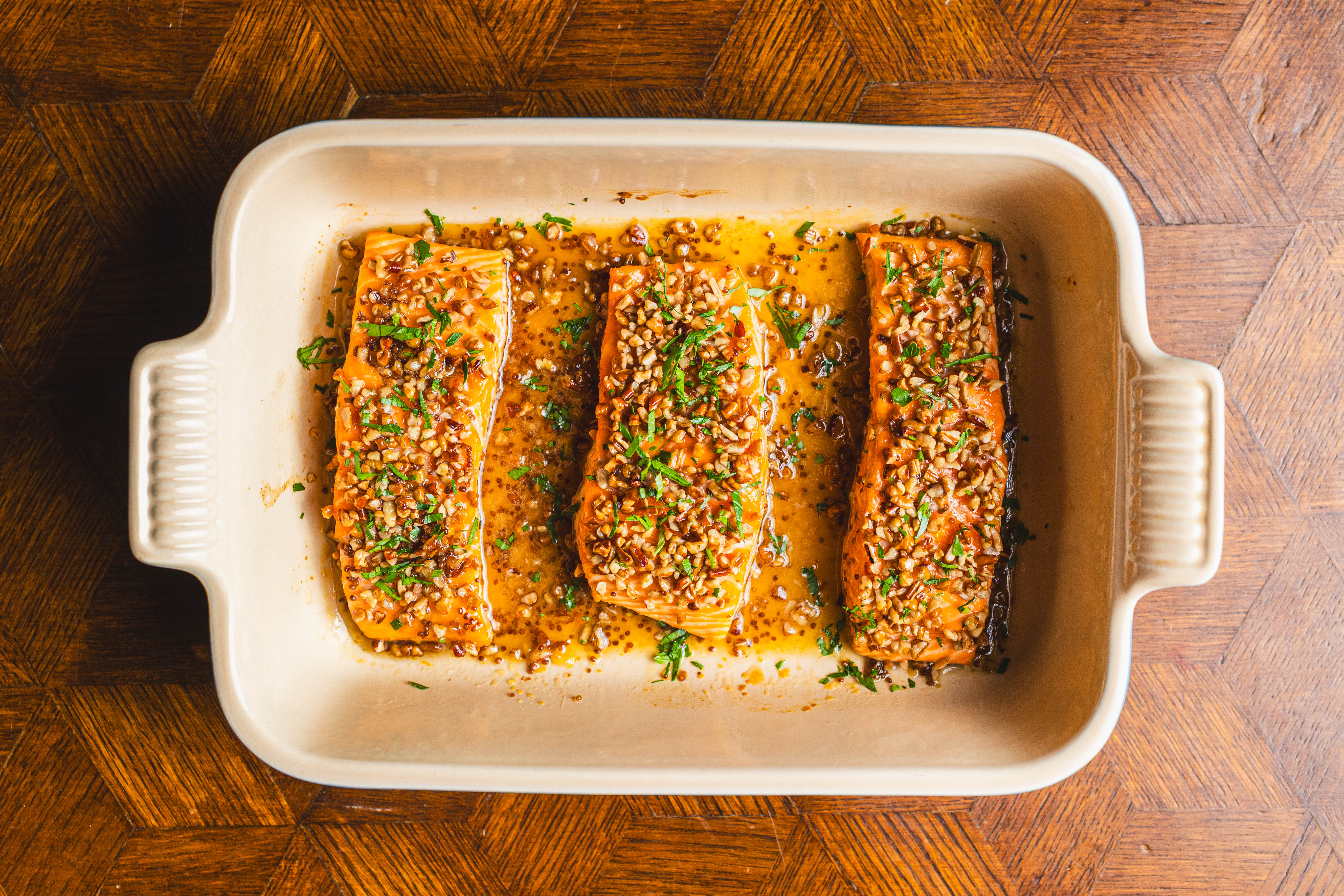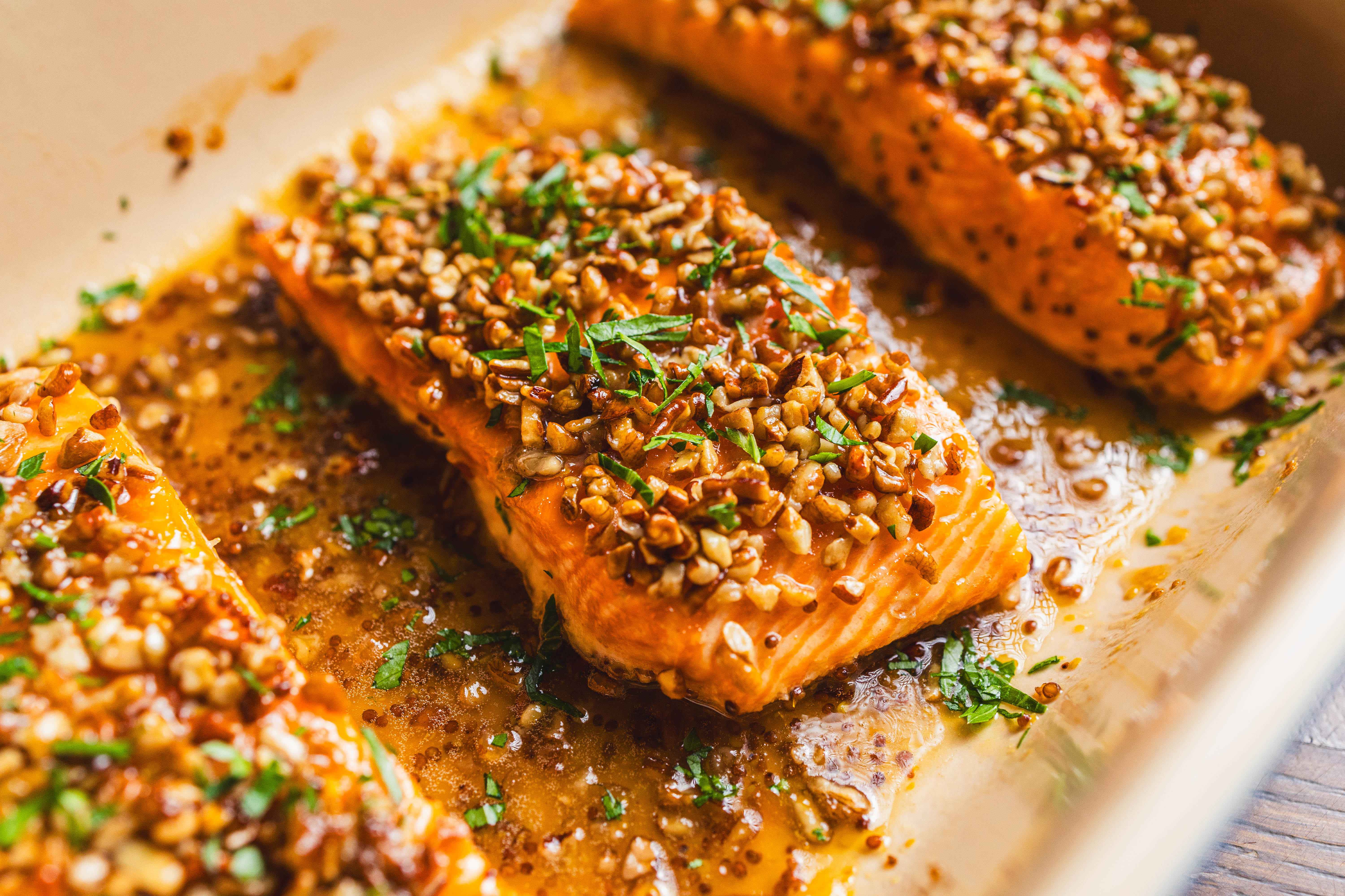 How romantic! How grand! How... easy? Yes, well, Date Night Salmon doesn't want to take up too much of your time and energy! You have a date to get to, after all! The salmon, succulent and rich in flavor, will be ready for you and your loved one, perfectly cooked and coated in a sweet, tangy, and electrically sunny citrus sauce! A crunchy pecan topping helps Date Night Salmon feel dressed to the nines, just like you are! This is how you begin a magical evening!