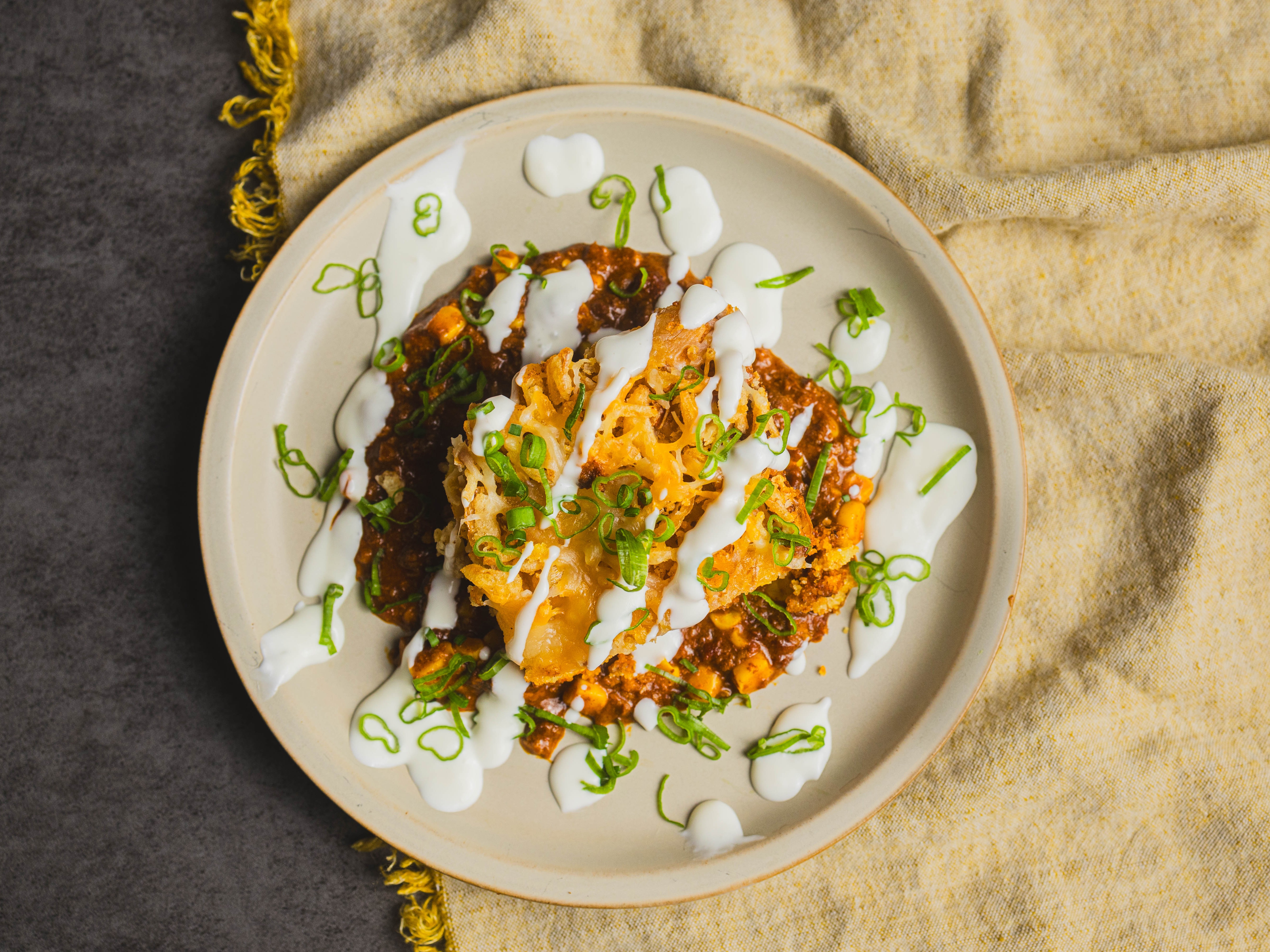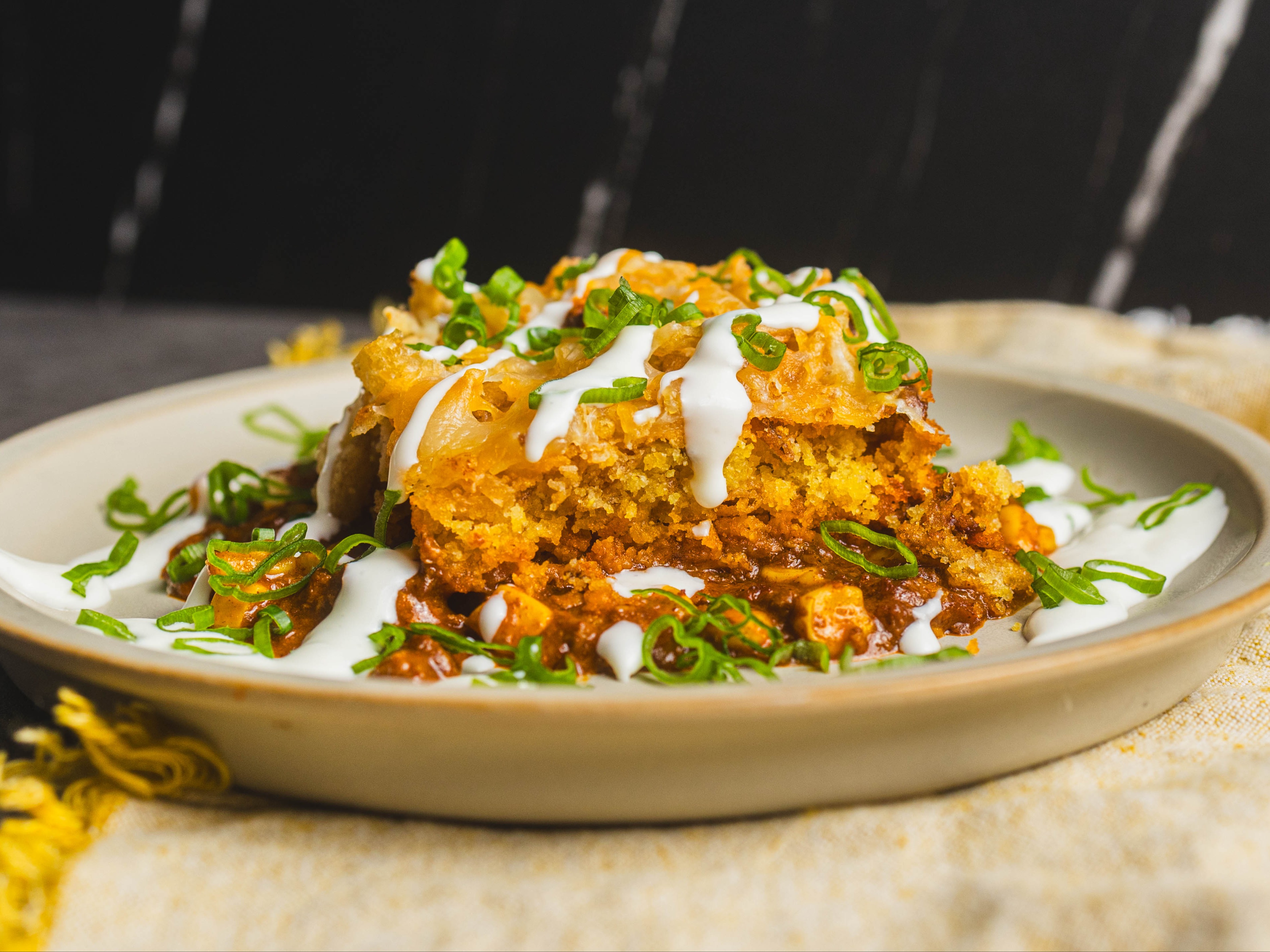 Step 9 -Serve the chili bake topped with the sour cream and the green onions.