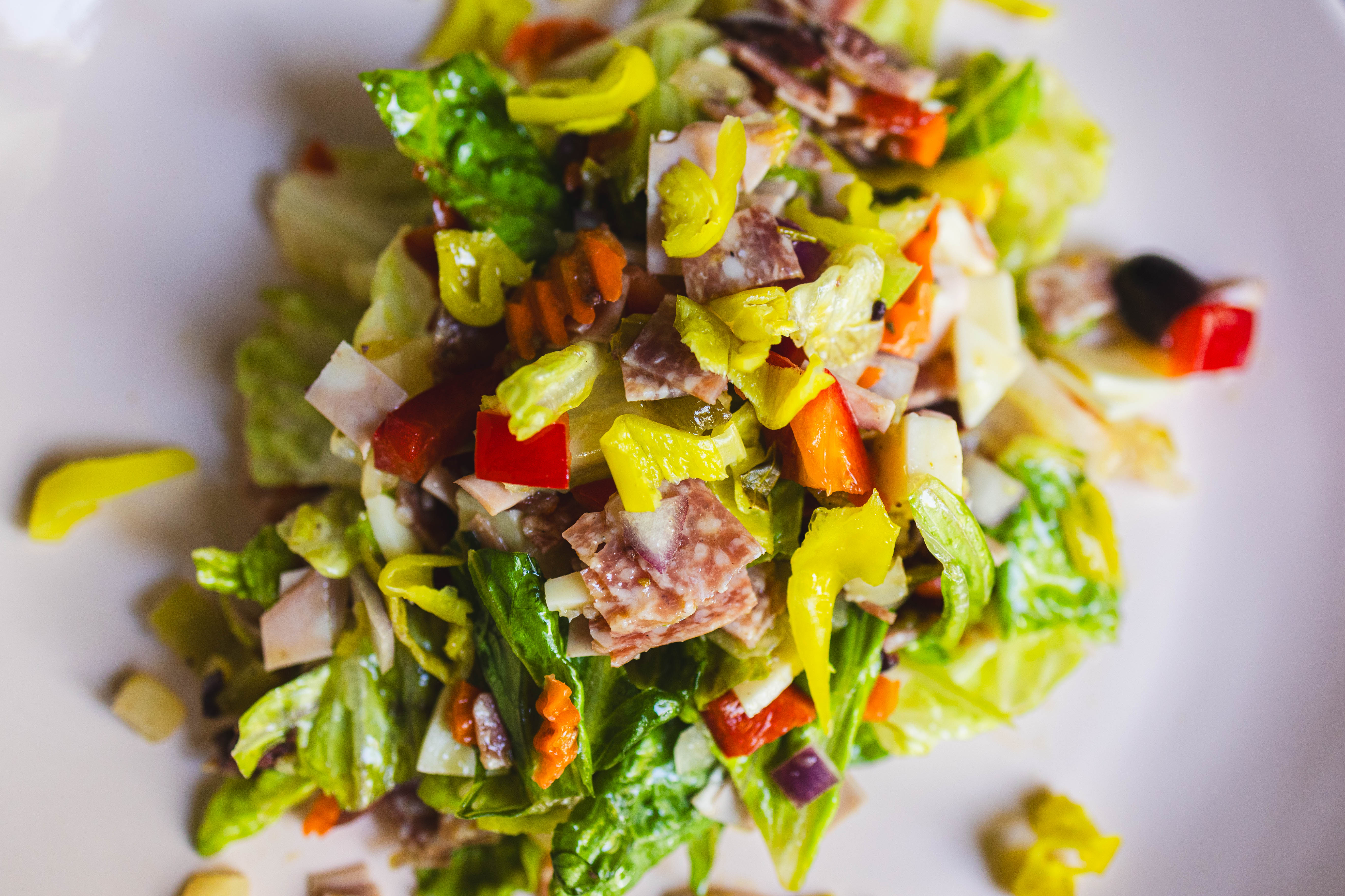Step 1 -In a large bowl, add the romaine, the celery, the bell pepper, the red onion, the salami, the soppressata, the mortadella, the provolone, the giardiniera, the olives, 6-8 of the pepperoncinis, and the parmesan.