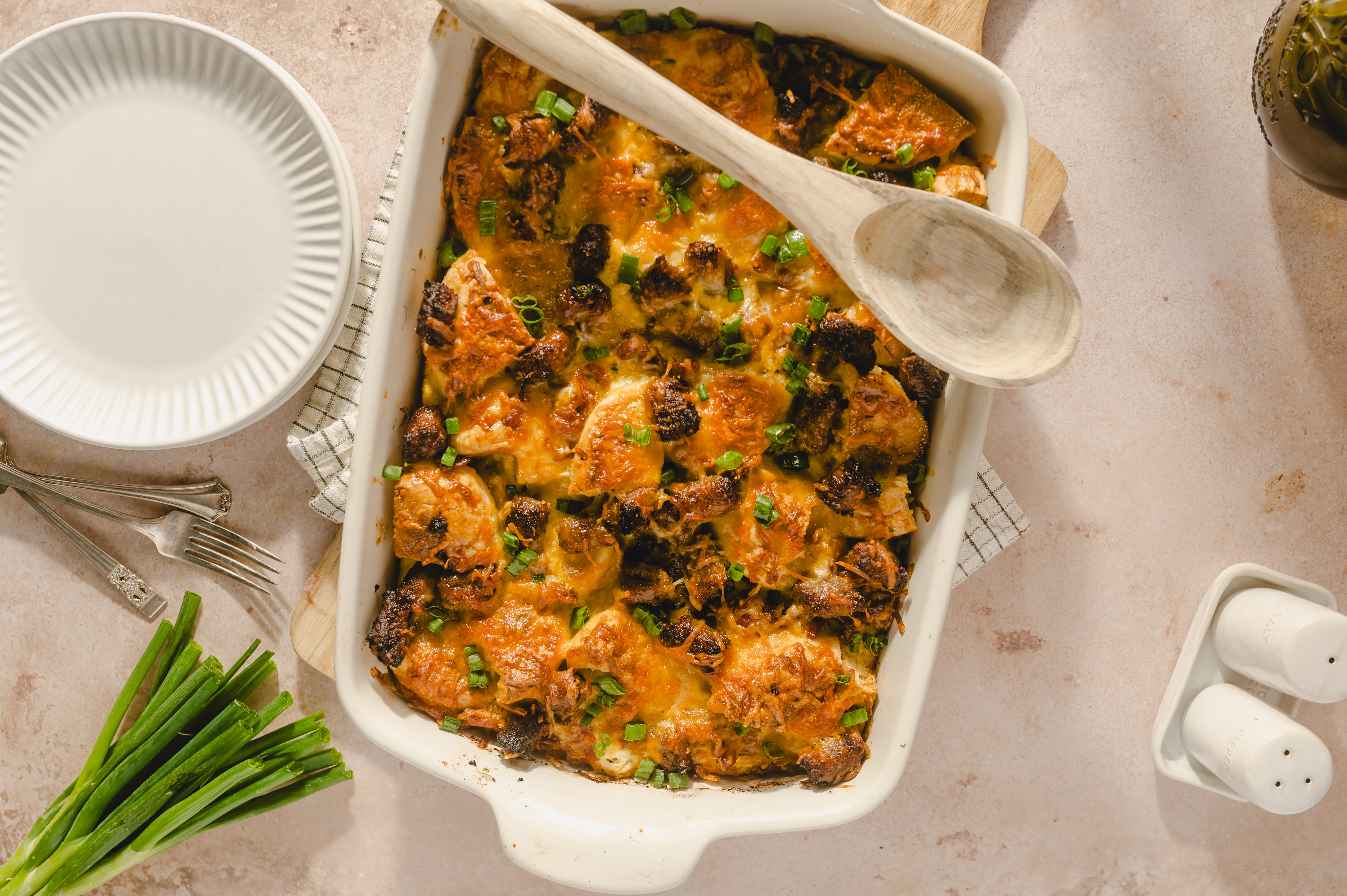 English Breakfast Casserole embraces the desire for a big breakfast with appropriate gusto! Fluffy, zesty seasoned eggs and bites of tantalizing English muffins and succulent crisp bacon, with a blanket of melty cheese and savory sausage, is just what you need to wake up happy in the morning! It's a substantial and delicious breakfast that brings all the favorites together. English Breakfast Casserole is positively guaranteed to give you positive feelings!