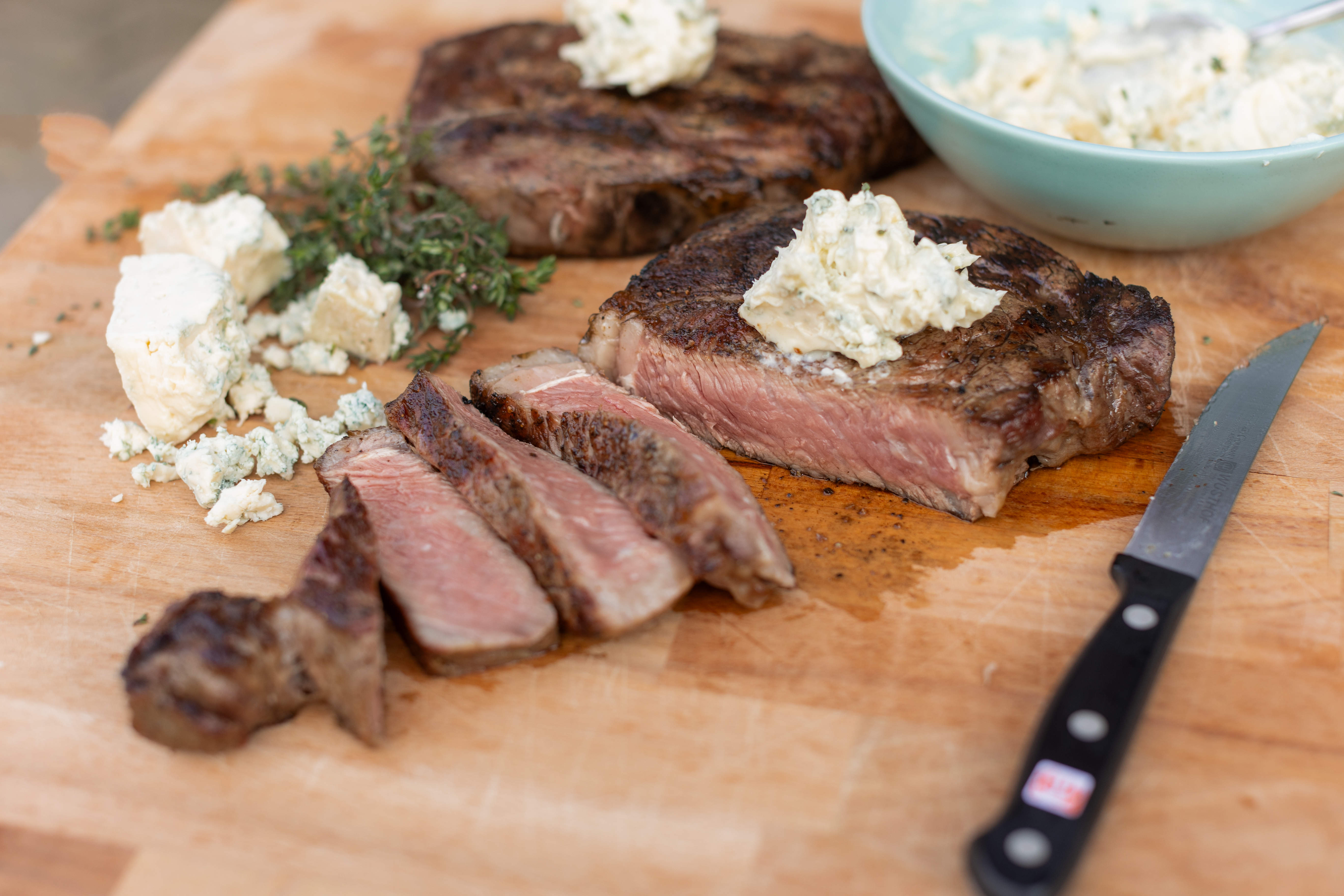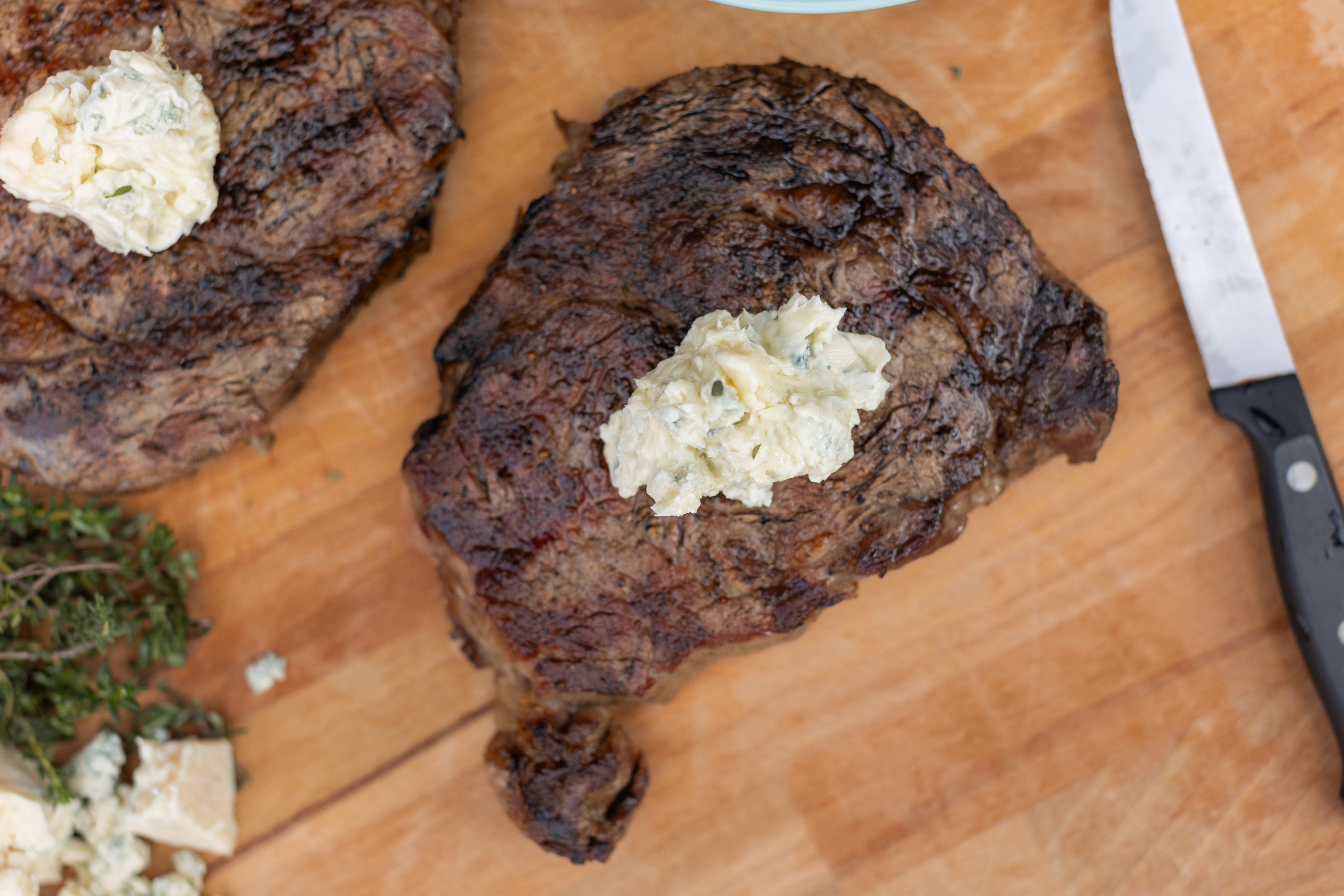 Step 8 -Transfer the steaks to a cutting board and top them with 1/2 of the blue cheese-butter.