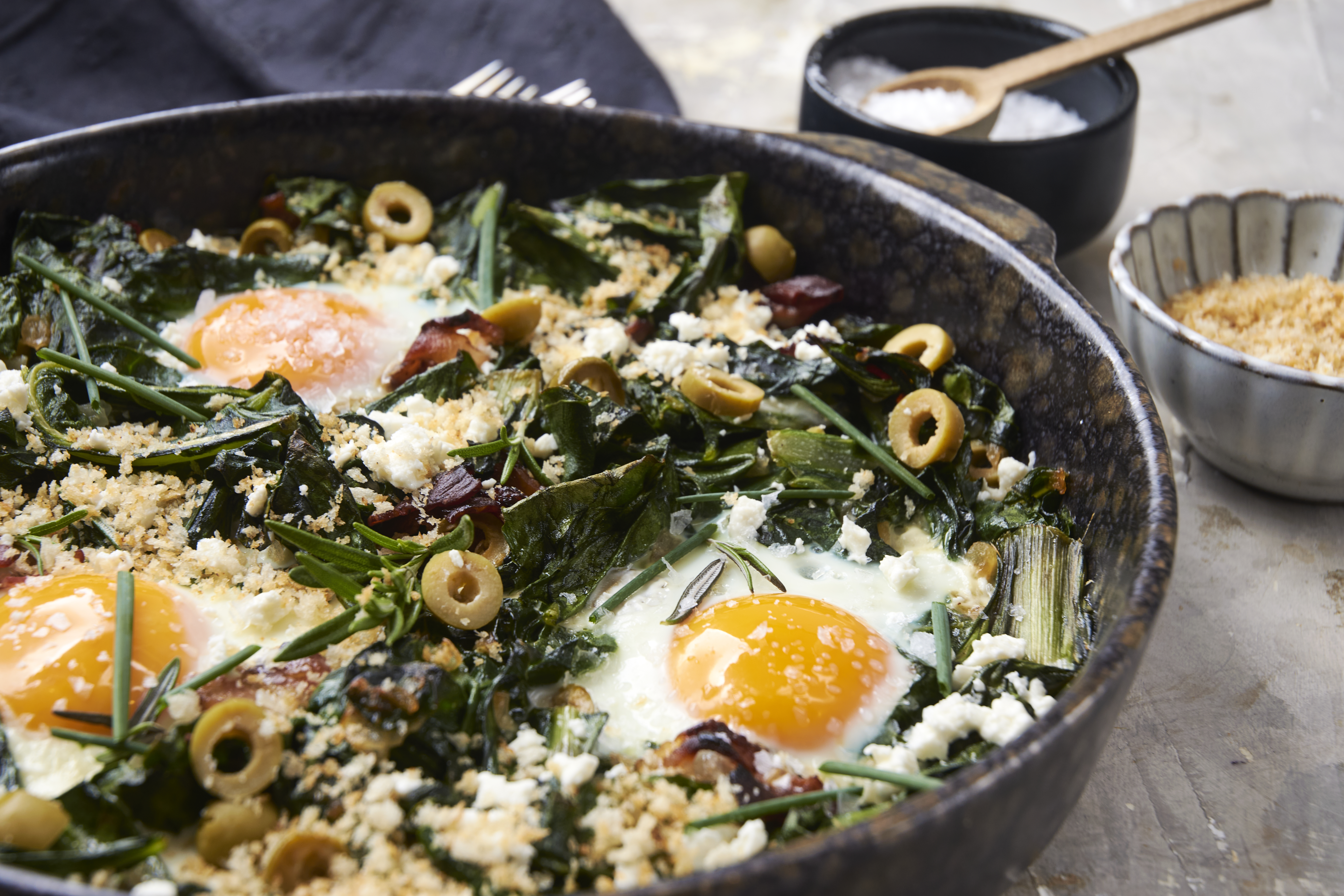 No ordinary breakfast here! This is a 5-star, top-rated bed-and-breakfast dish that is going to wow you! Fancy Baked Eggs cook the eggs while nestled in between leafy, wilted Swiss chard, succulent bacon, and extra-tangy olives. With a little sharp feta and some toast for scooping, Fancy Baked Eggs will blow any average omelet out of the water (or skillet)! This is how eggs become high-class!
