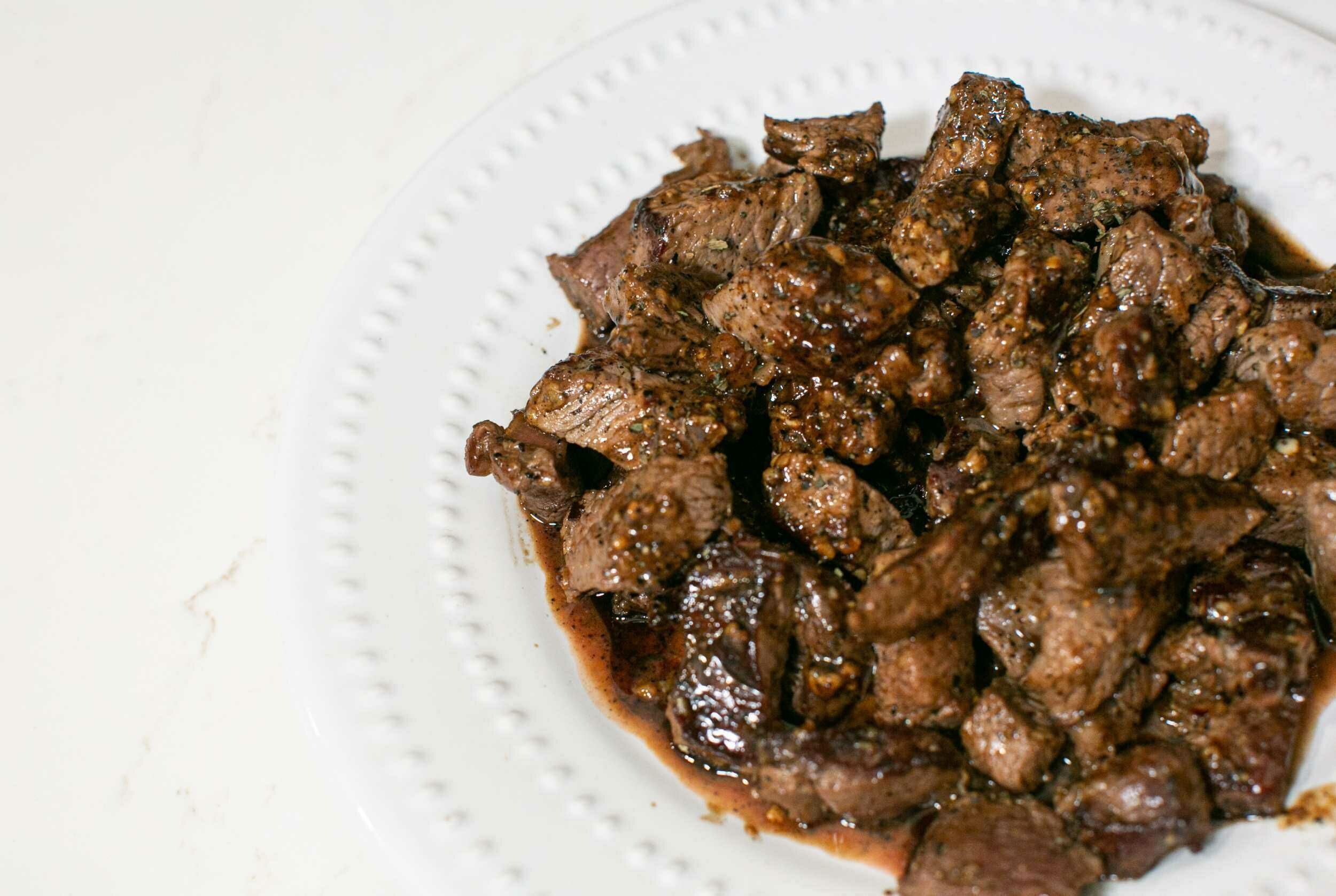 Step 6 -Directly pour the garlic-butter over the steak bites, tossing it all together.