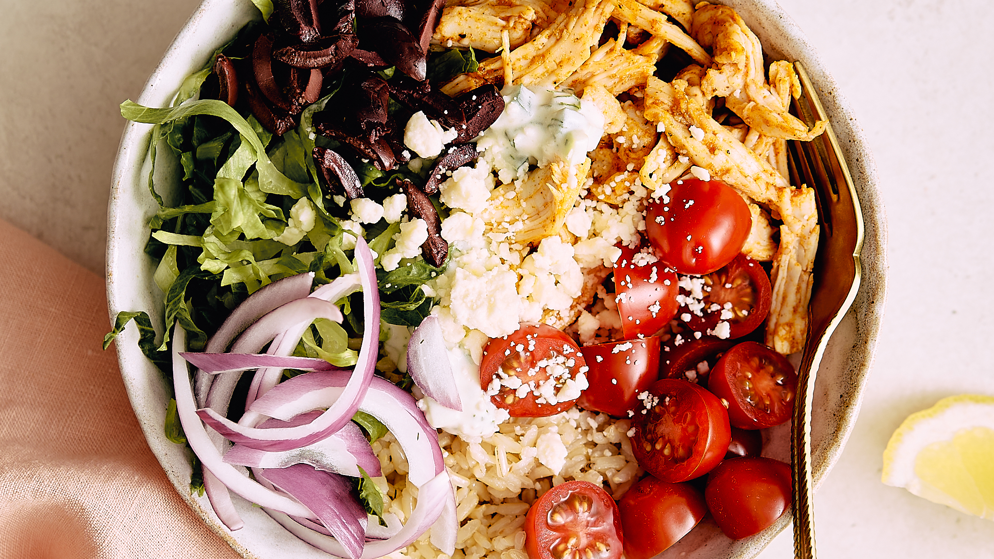 A little Mediterranean magic never made anyone frown when dinnertime rolled around. These Greek Rotisserie Chicken Bowls prove that and then some! The chicken is savory and delicately seasoned, and it comes served with nutty brown rice and classic Greek favorites like olives and sharp feta cheese. But the real secret to Greek Rotisserie Chicken Bowls' amazing flavor is the creamy, refreshing, homemade tzatziki sauce drizzled over everything. A little Mediterranean magic for everyone!