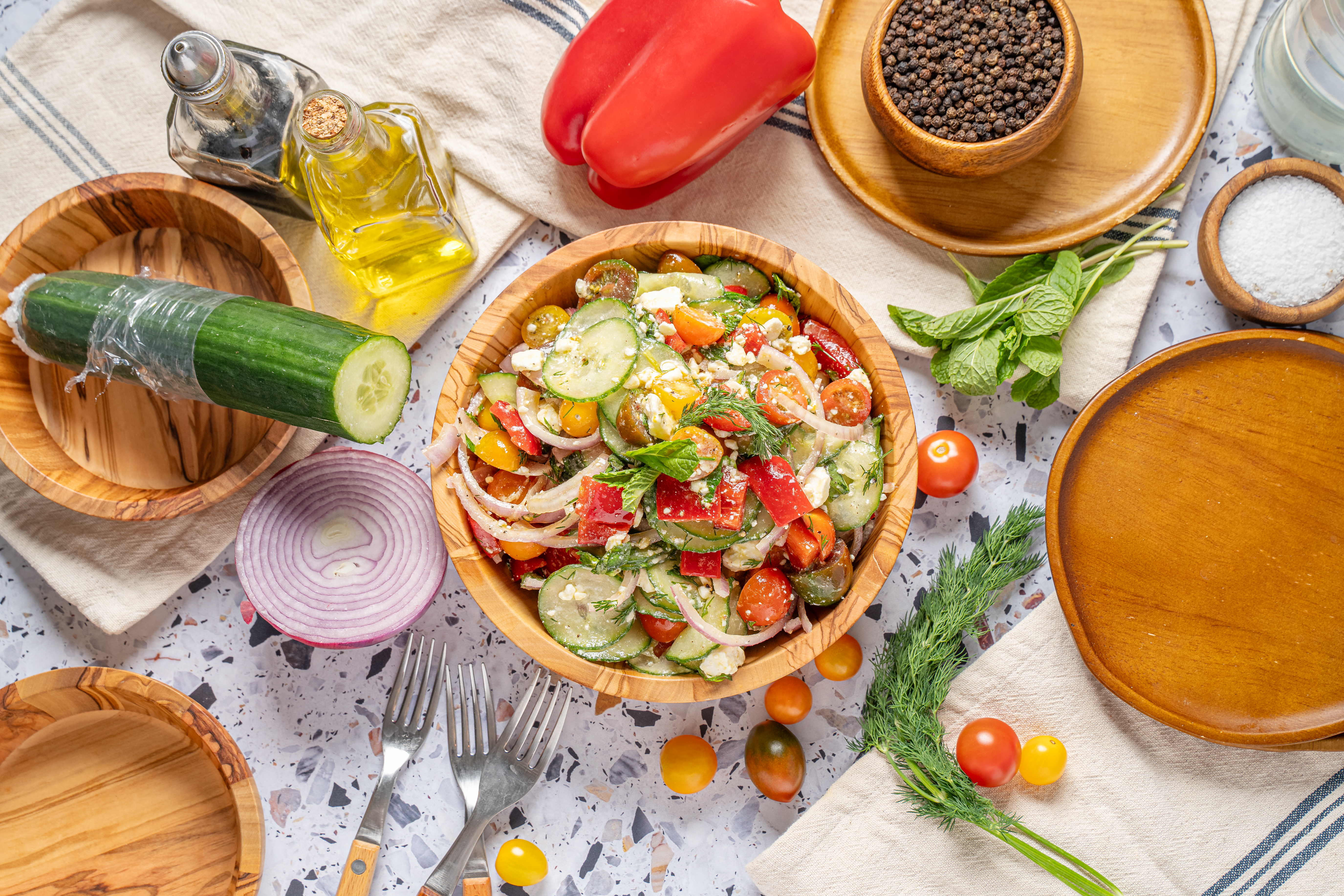The Greek Tomato Salad is a bowl of classic Mediterranean vegetables and flavors. Fragrant mint and basil accent juicy tomatoes, peppery red bell peppers, and refreshing cucumbers in a light and tangy garlic dressing. A sprinkling of feta cheese makes Greek Tomato Salad truly phenomenal, and a delight to feast on in spring or any weather!