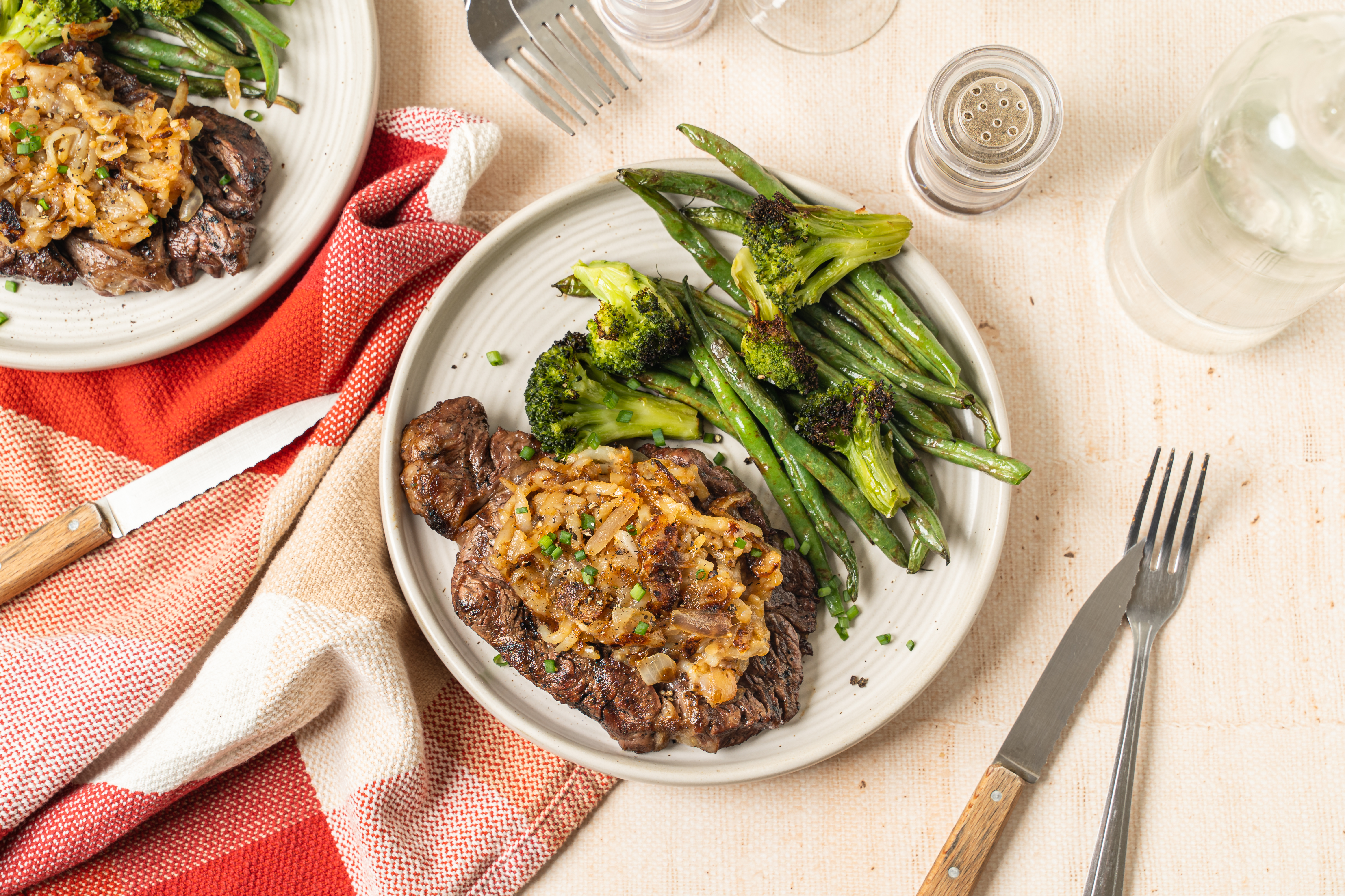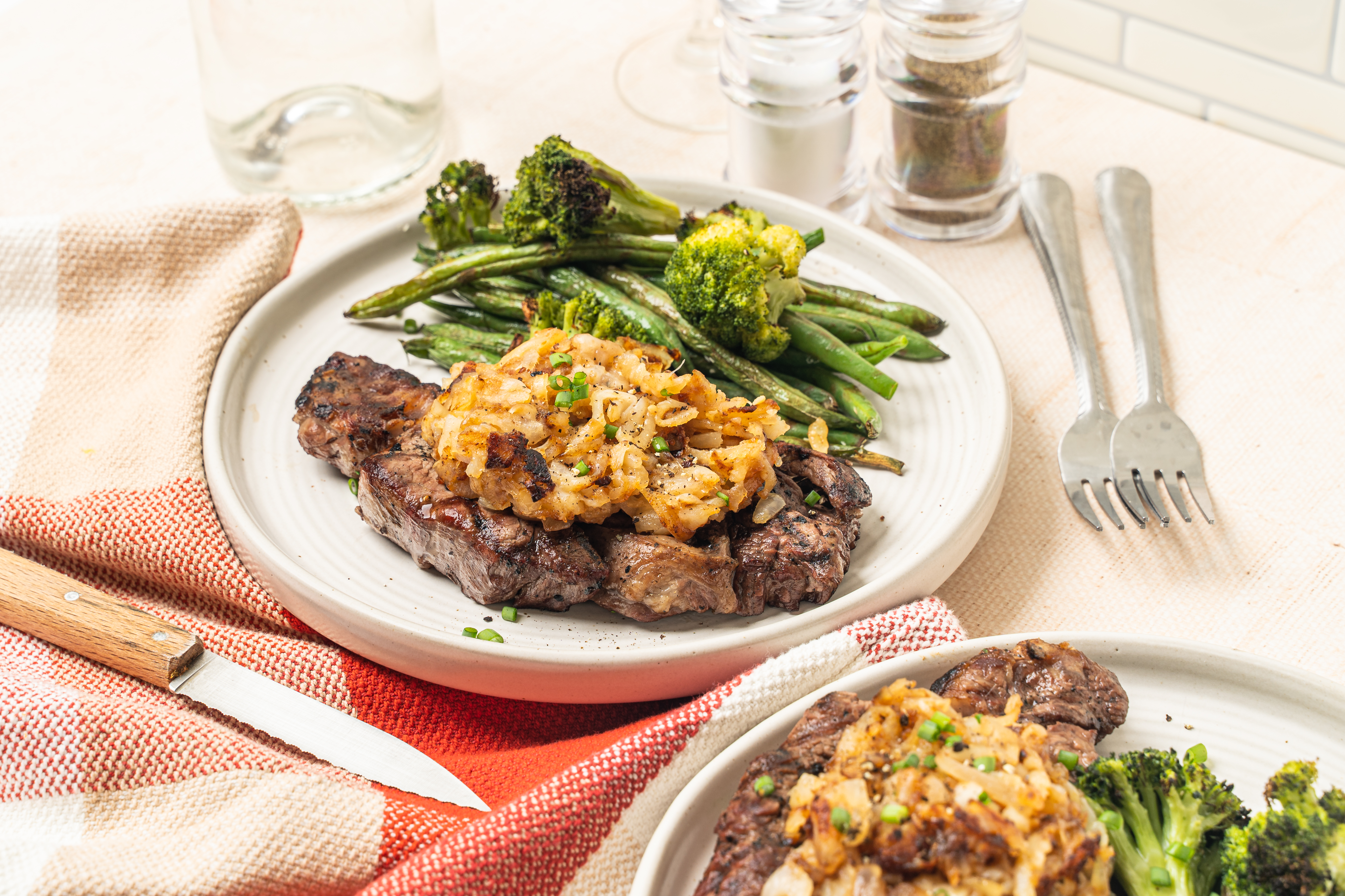 What's better than meat and potatoes? Potatoes on the meat! Genius! Hash Brown Steak tops a beautifully grilled, succulent, beefy steak with a crispy, cheesy hash brown topping. There's no need for side dishes when Hash Brown Steak is on the menu; it has everything you need piled high right on top! This is the best potatoes-on-meat dish since shepherd's pie!