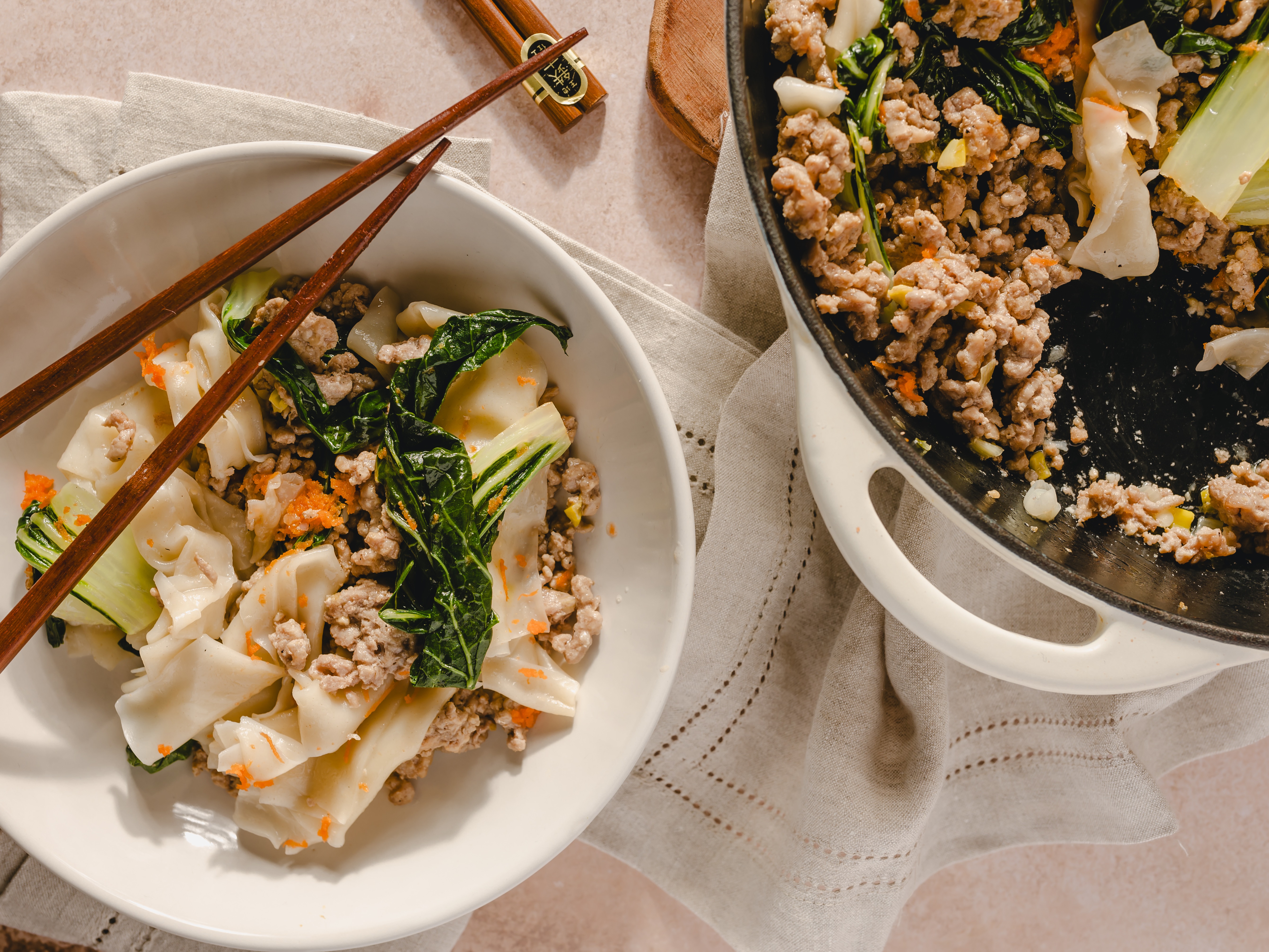 Step 6 -Add the cooked wonton wrappers to the pork mixture and toss to combine.