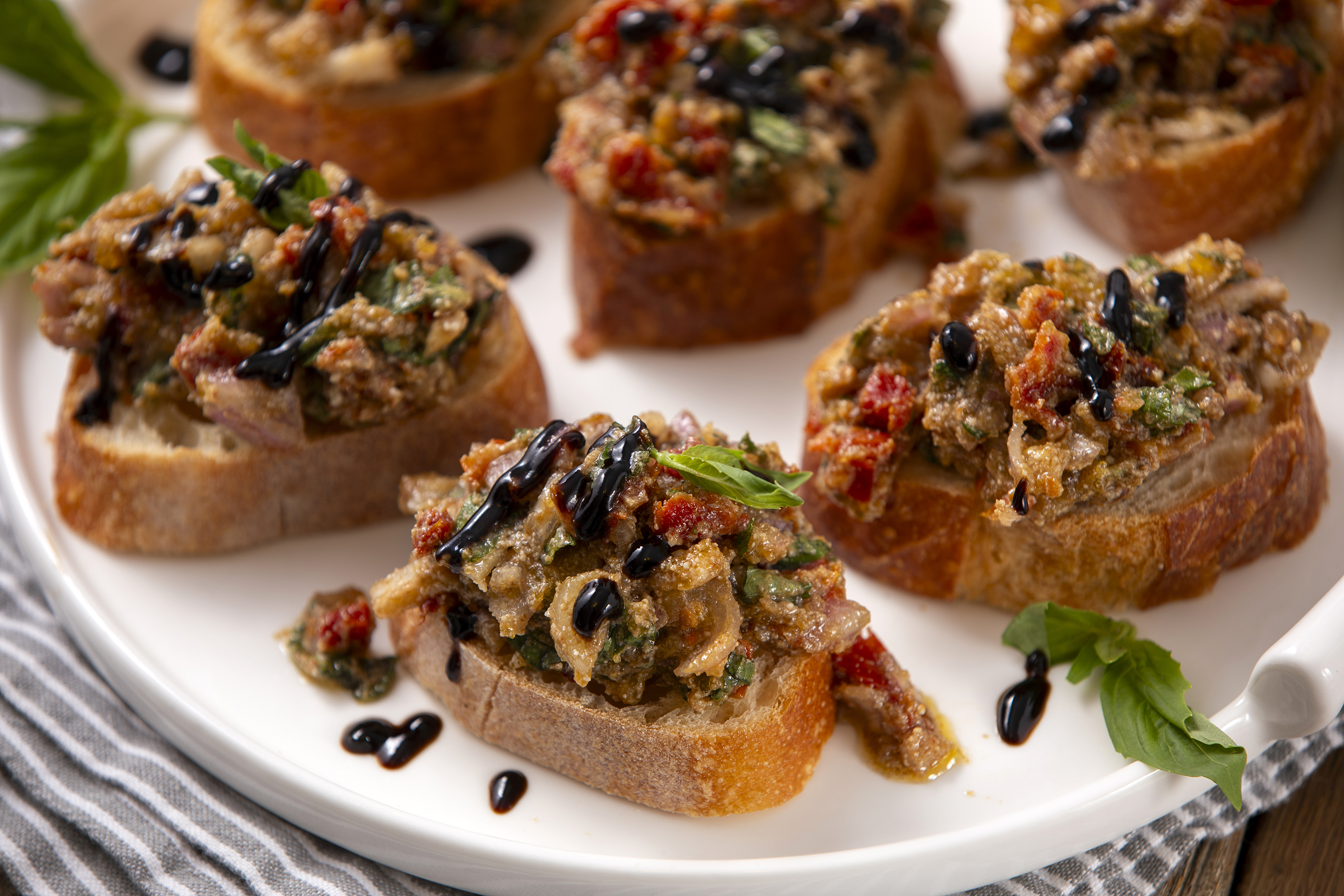Step 2 -Top the toasted bread slices evenly with the bread dip, then drizzle with the balsamic reduction. Optionally, serve the bread dip in a bowl with the toasted bread slices on the side.