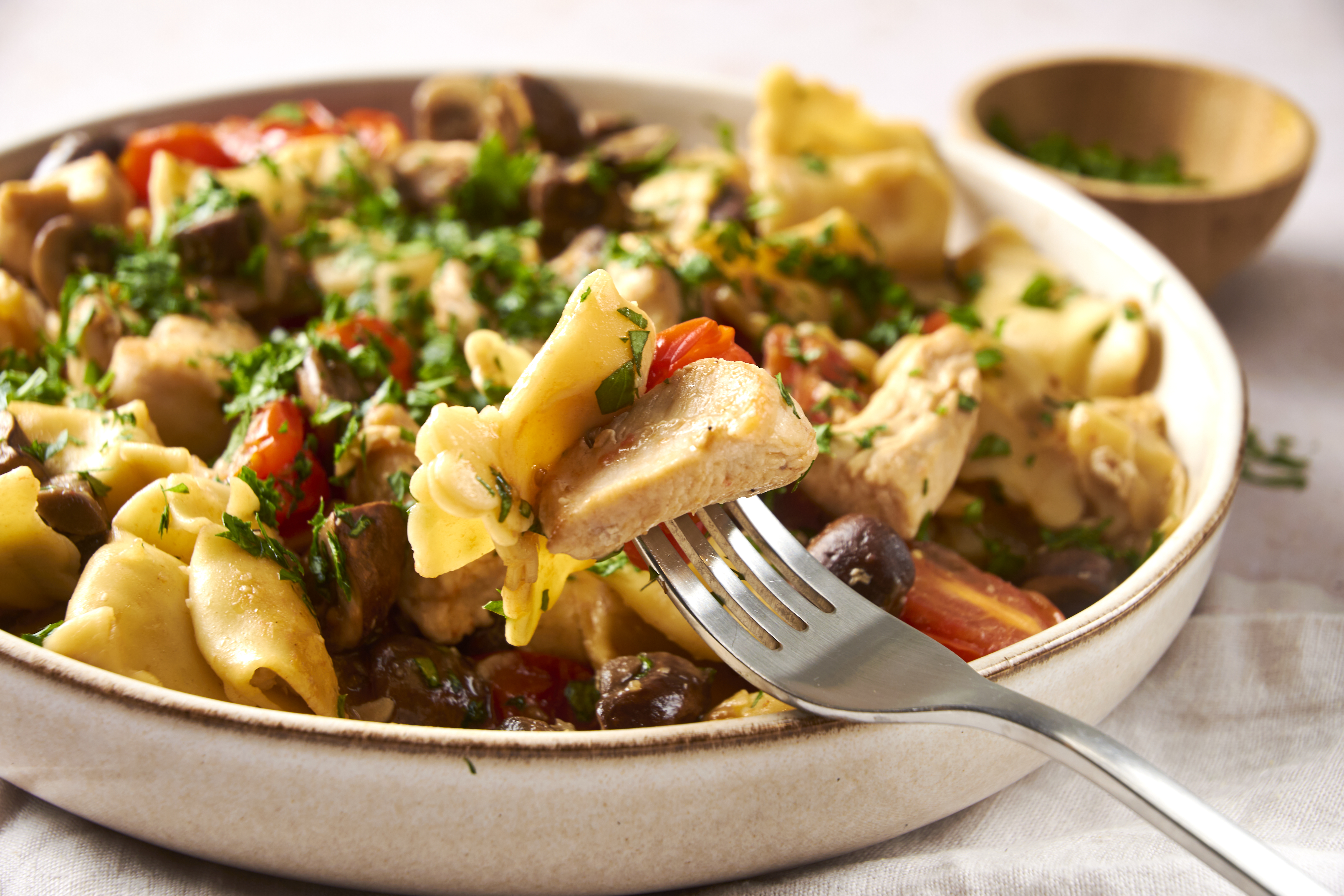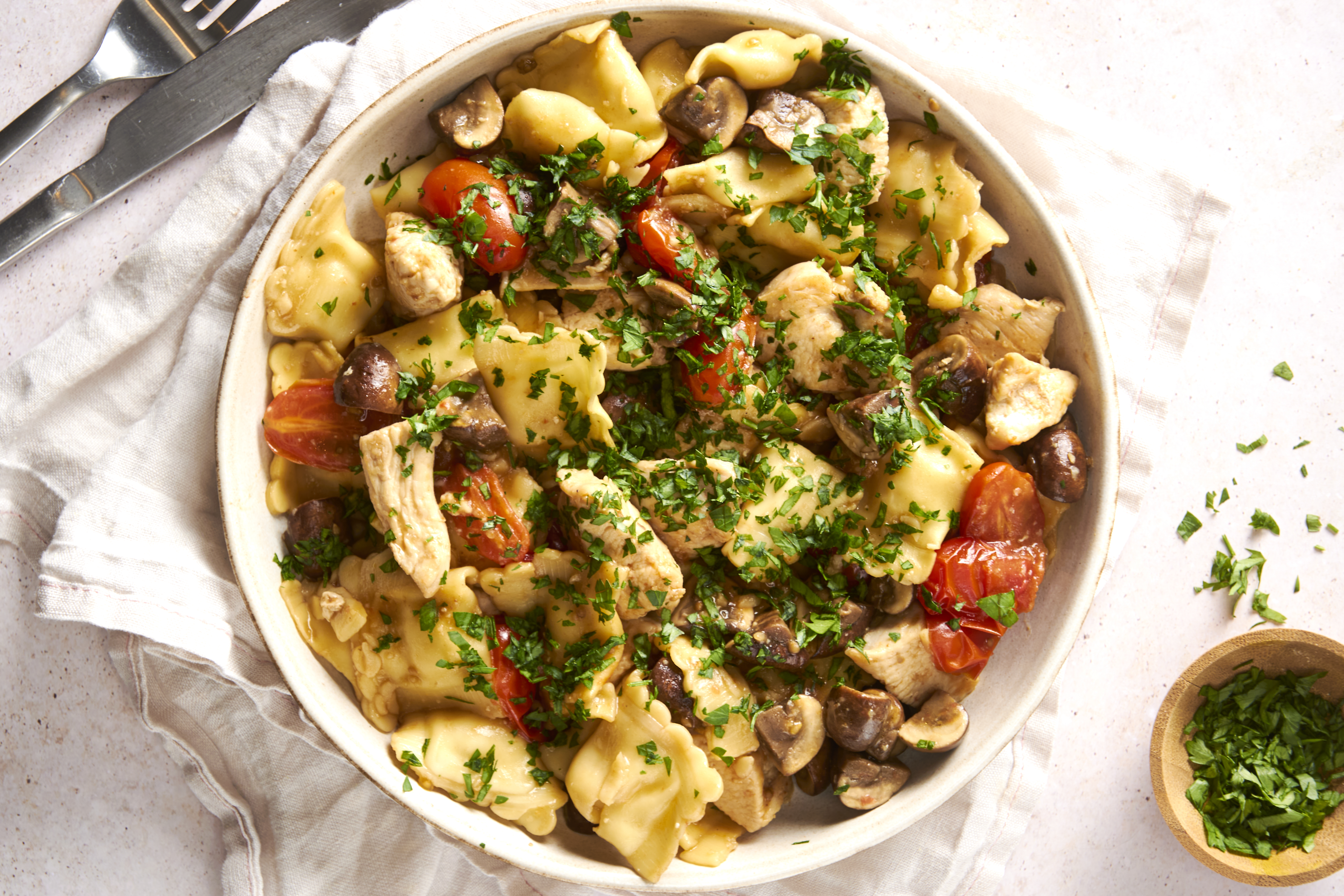 Just like Mom makes! Italian Chicken & Ravioli is going to have you rethinking what a great chicken noodle dish should taste like. The ravioli is tender and cheesy, and the chicken is wonderfully golden and, of course, delectably juicy! With plenty of sharp parmesan and beefy mushrooms, the savory flavor of this Italian Chicken & Ravioli will give other main courses the boot! Get it? Because Italy is shaped like a boot!