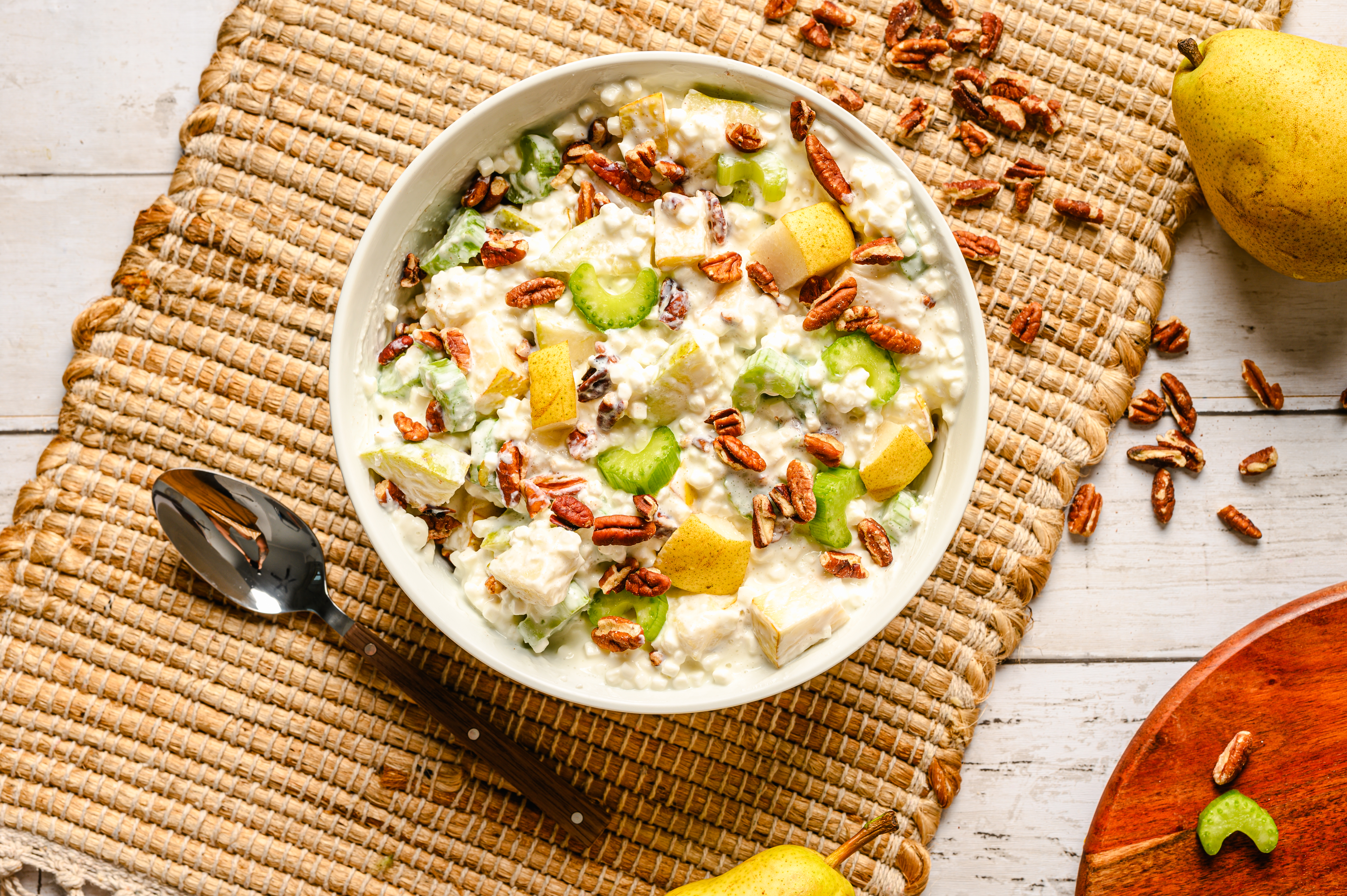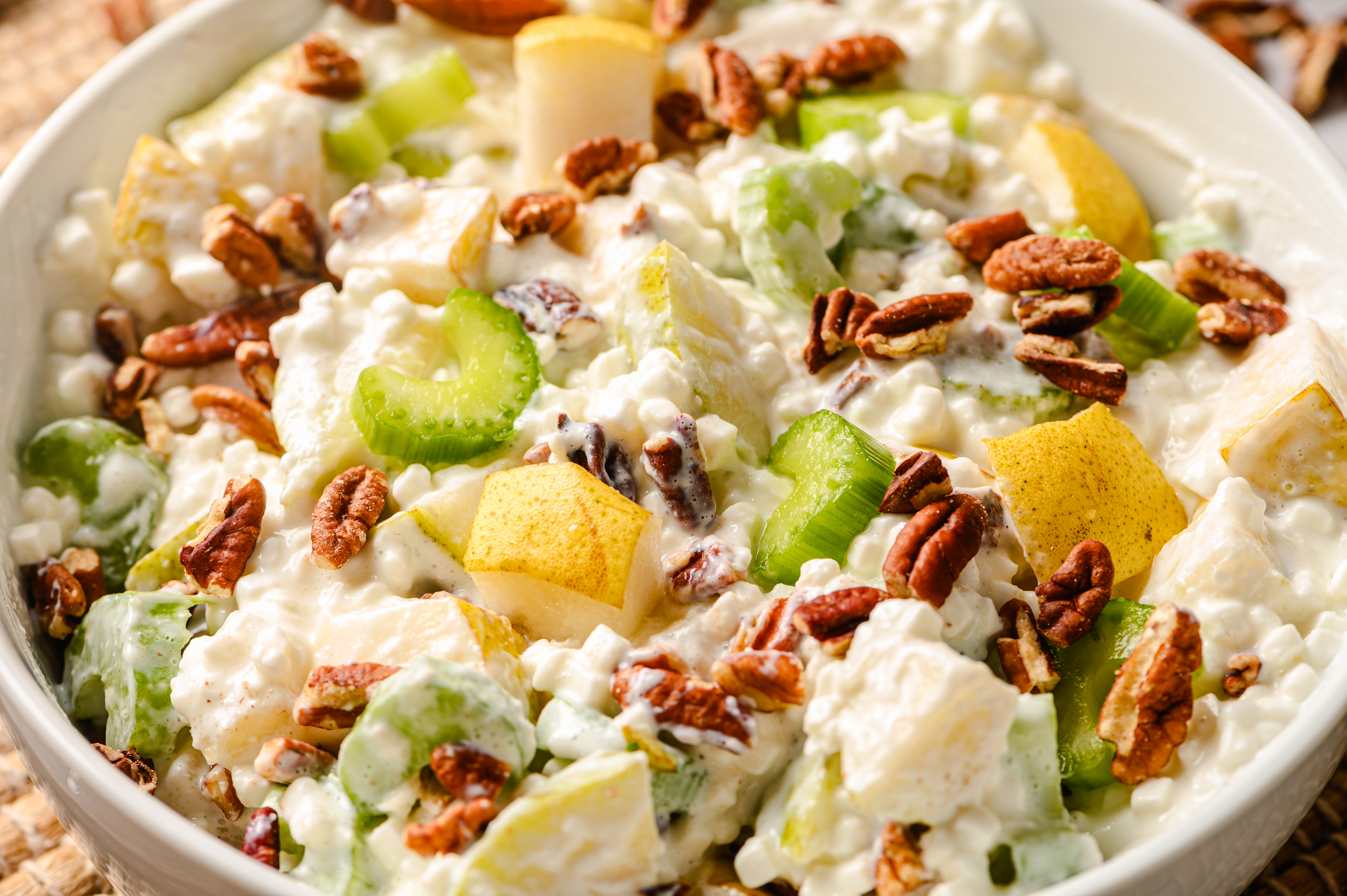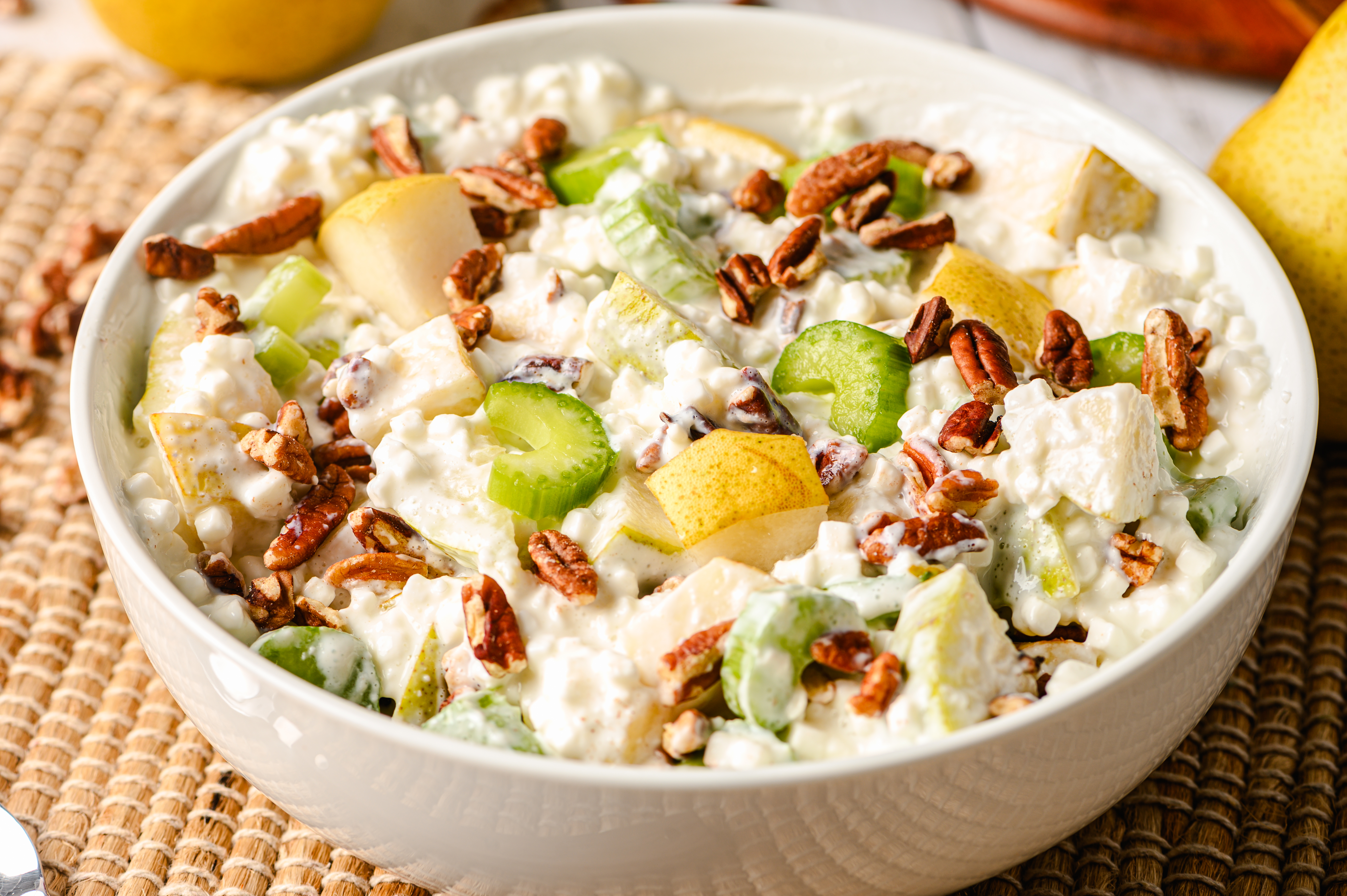 Step 1 -In a large bowl, add the cottage cheese, the pears, the celery, the pecans, and the ginger and stir to combine.