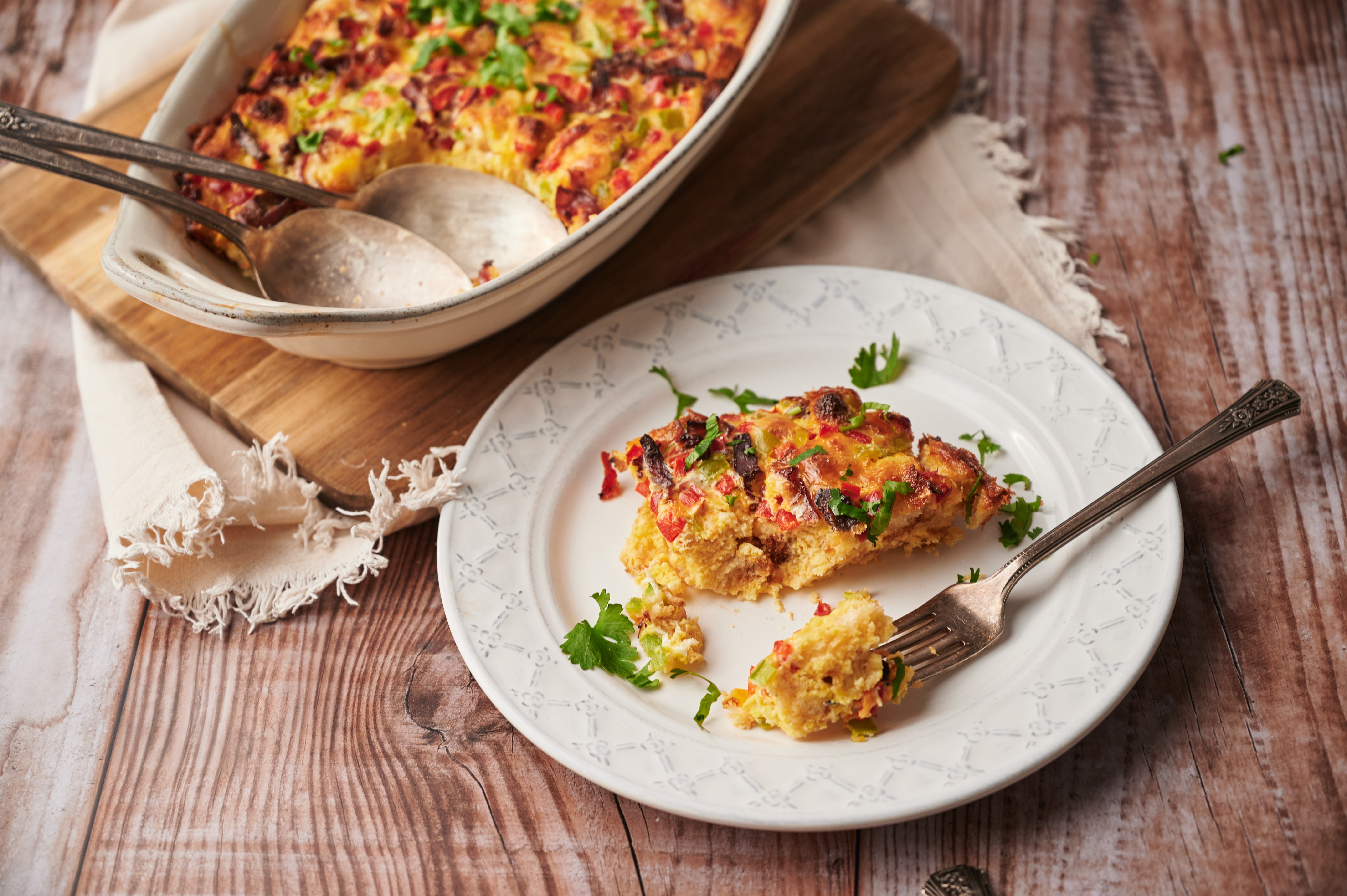Y'all! This here Low-Country Breakfast Bake is the best you will ever taste! A nice little package of fluffy eggs, crumbled bacon, perfect bell peppers, and lots of melted cheddar cheese sitting atop some softened croutons to become one of the tastiest morning meals you ever did see! Low-Country Breakfast Bake is so good, it doesn't have to be a down-home Charleston kind of meal; enjoy it wherever you roam to bring back that wonderful, everyone-is-welcome taste of home. Here's us wishing a good morning to y'all!