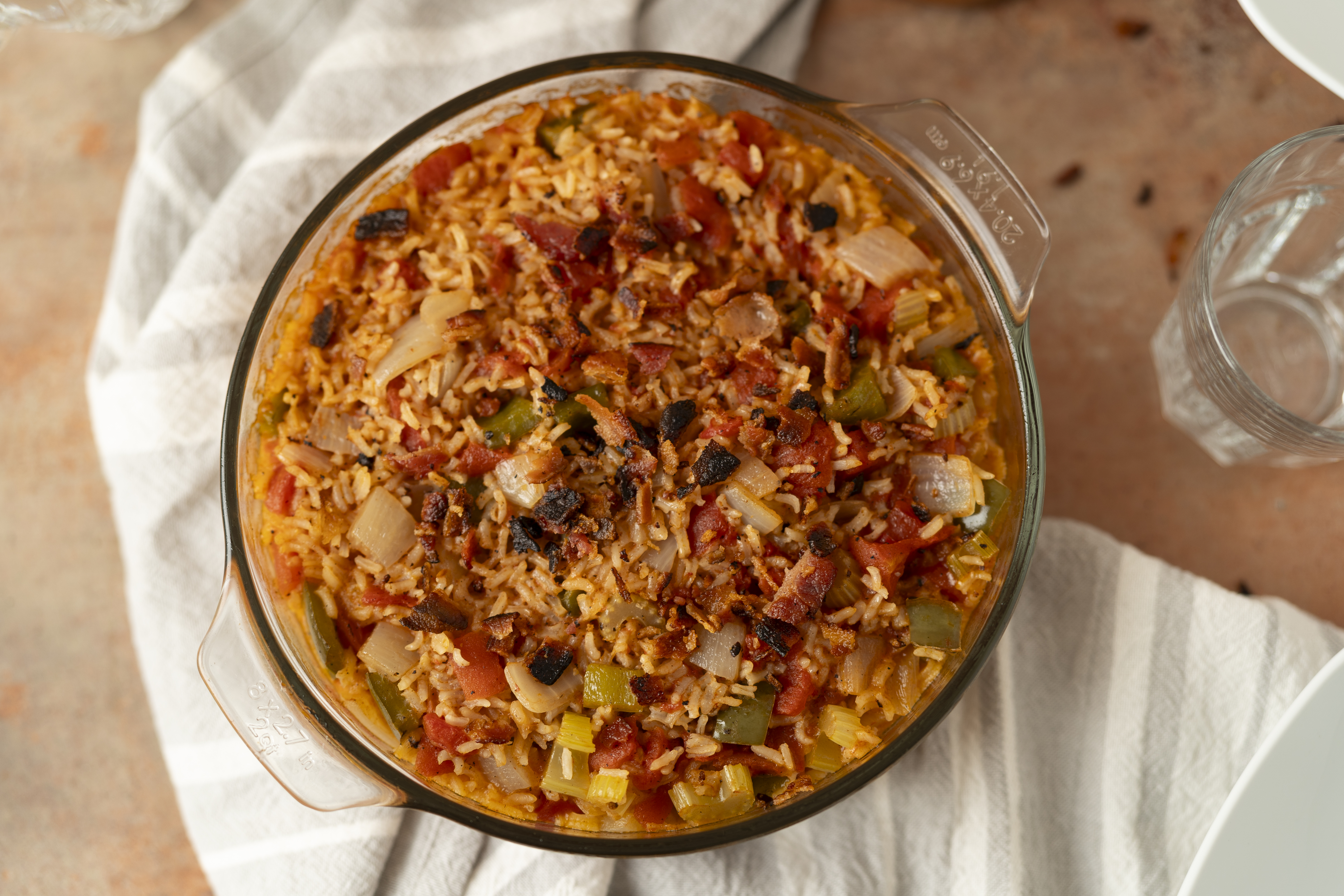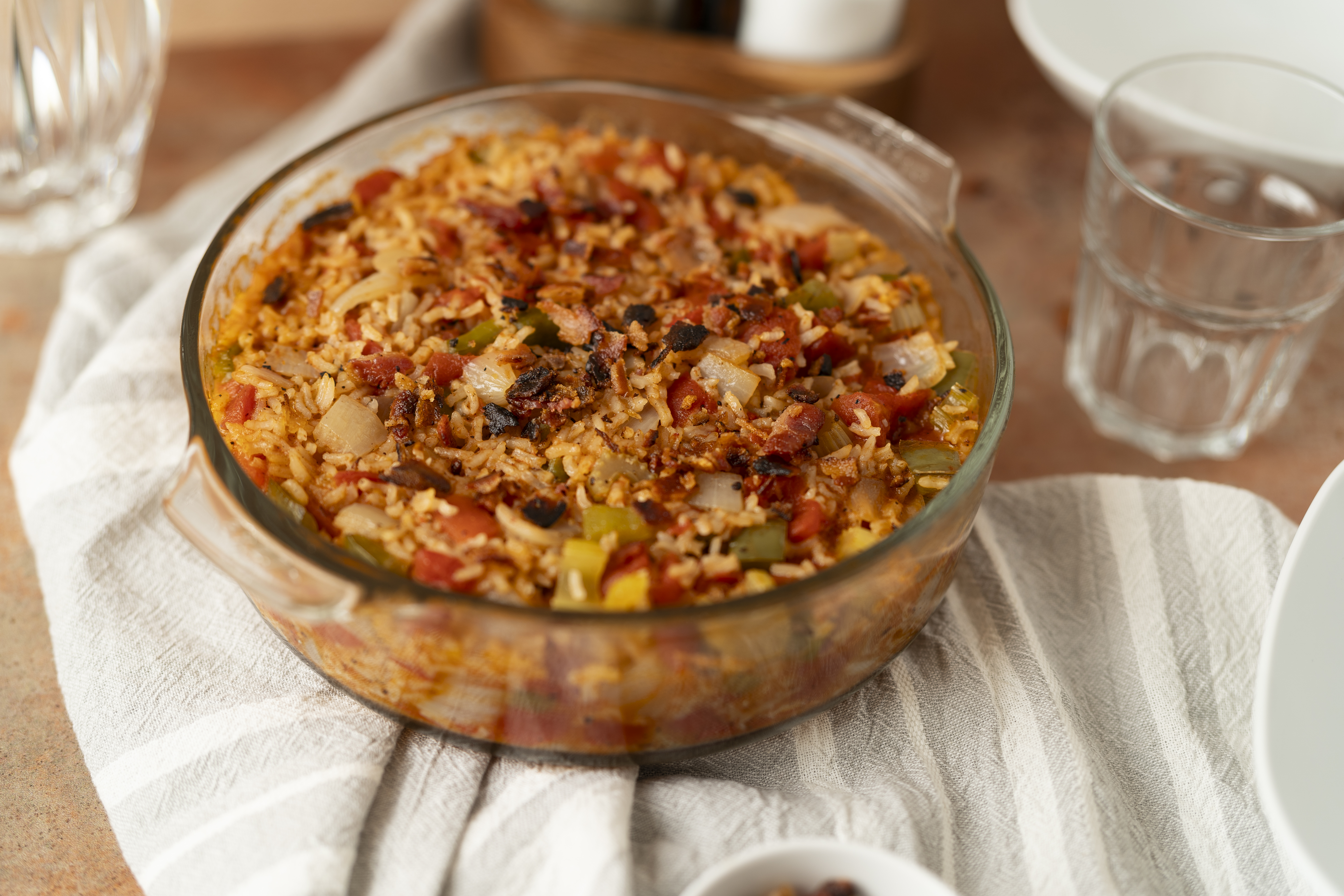The Lowcountry Red Rice Bake is country cooking at its purest and most comforting. It's such a wonder of deep, spicy, zesty flavors, with the rice absorbing succulent poultry and rich tomato flavors, to become a gorgeous sunset red. Crispy bacon on top just adds to that savory goodness! Lowcountry Red Rice Bake is how to do Southern cooking, no matter where you are!