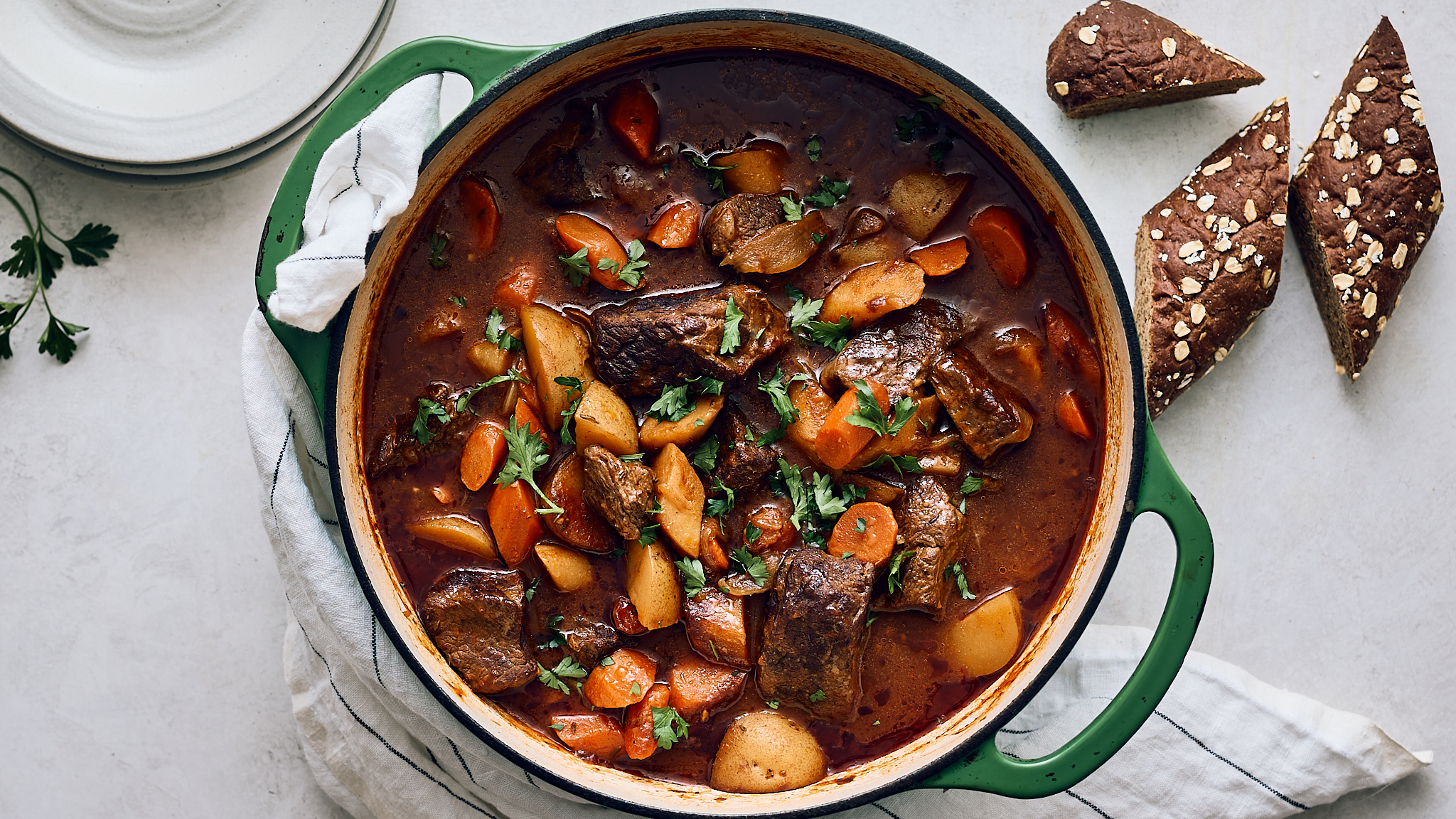 With St. Patrick's Day right around the corner, everyone wants a little of the Emerald Isle's good fortune! The Luck-of-the-Irish Stew provides some of that lovely shamrock charm (although, no shamrocks in these bowls, just some floral parsley)! Meaty chunks of beef, tender carrots, and creamy parsnips in a lovely beer-infused broth... mmm! A bowl of this Luck-of-the-Irish Stew will make your taste buds feel lucky!