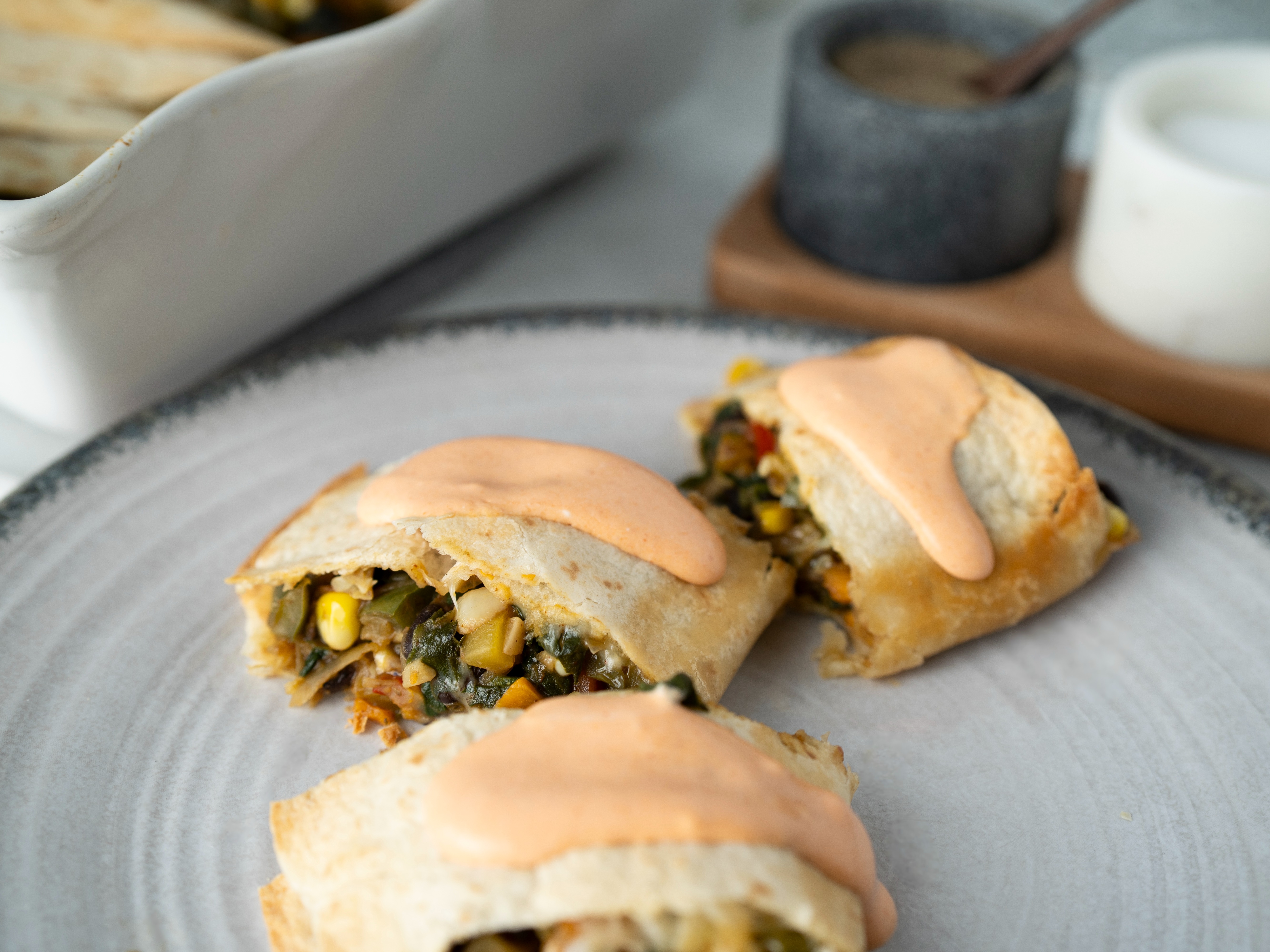 Step 10 -Evenly spread 1 cup of the veggie filling on one half of each of the tortillas.