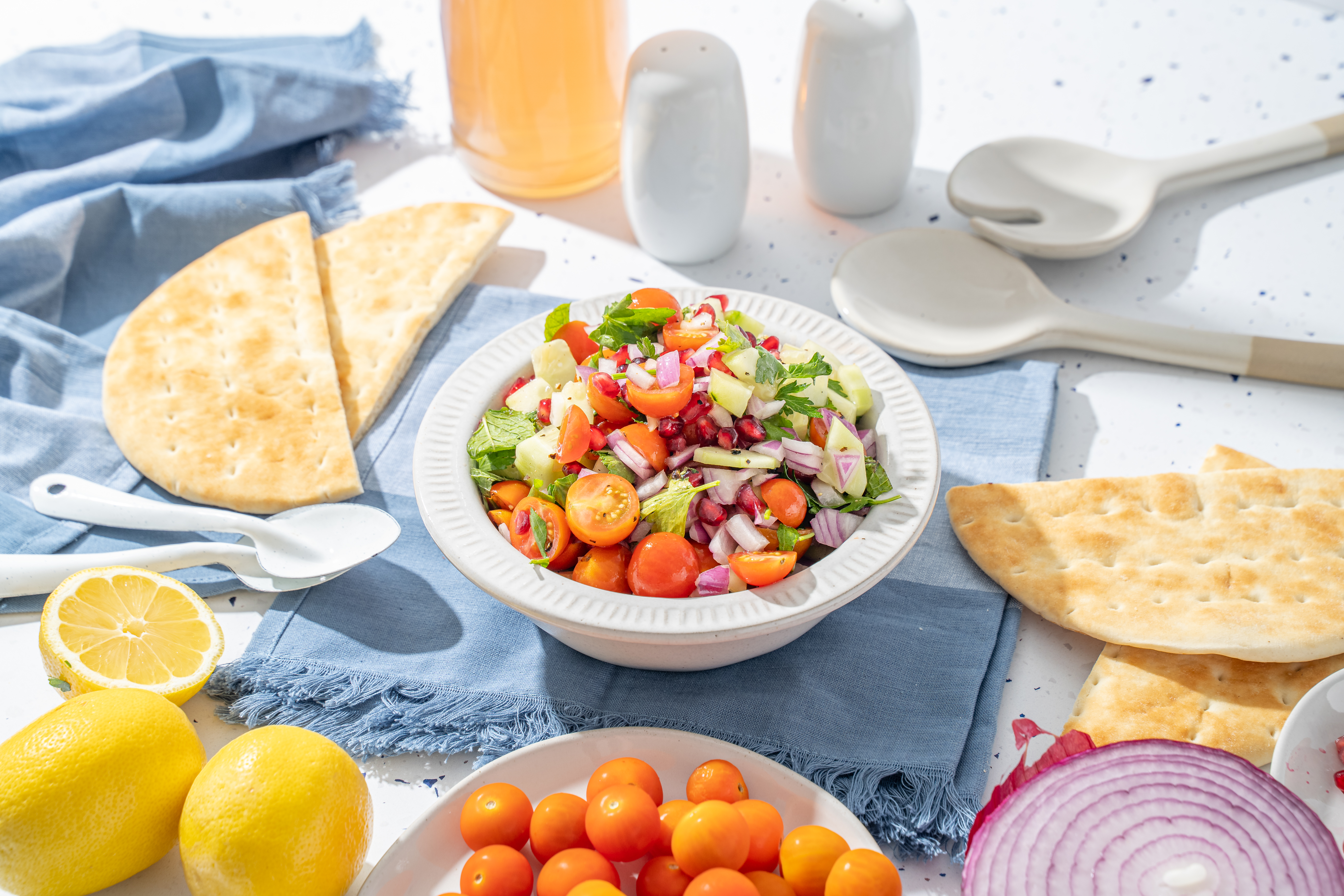 The Middle Eastern Salad knows how to alleviate the summer heat and the summer doldrums. The juicy, ruby, sweet pomegranate seeds, bright tomatoes, and refreshing cucumber are enhanced with the herbaceous and cooling flavors of parsley and mint, with a hint of lemon. Whether you're in the heart of the desert or relaxing poolside, Middle Eastern Salad knows how to satisfy your hunger with a burst of refreshment!