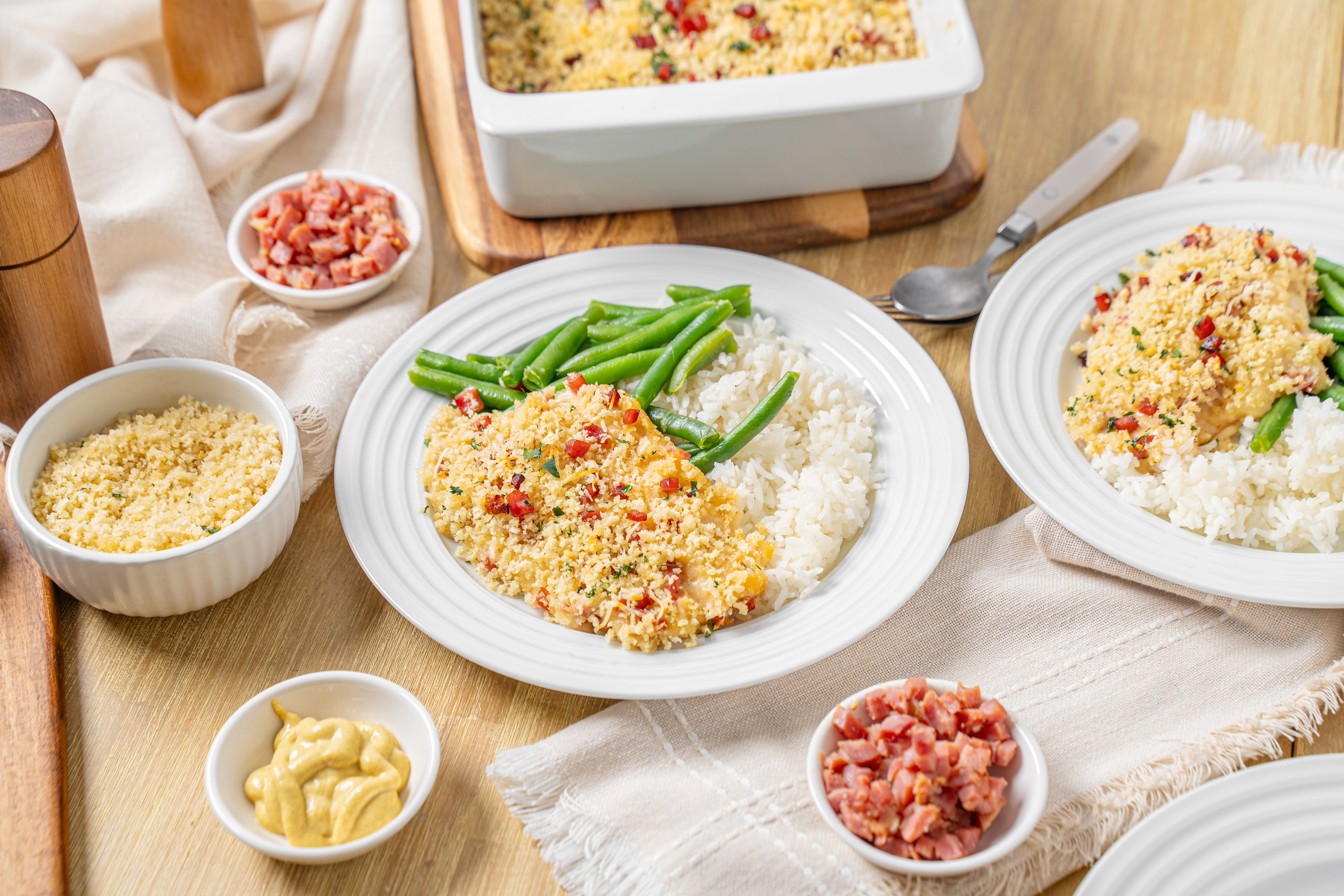 Mommy's Cordon Bleu takes the French classic and gives it a homespun but delicious makeover! The chicken is golden and juicy, perfectly savory, and ready to pair with a thick, luscious cheese sauce, crunchy panko topping, and bites of succulent ham. Is there any combination better than that? Mommy's Cordon Bleu proves that Mom knows best, especially when it comes to food!