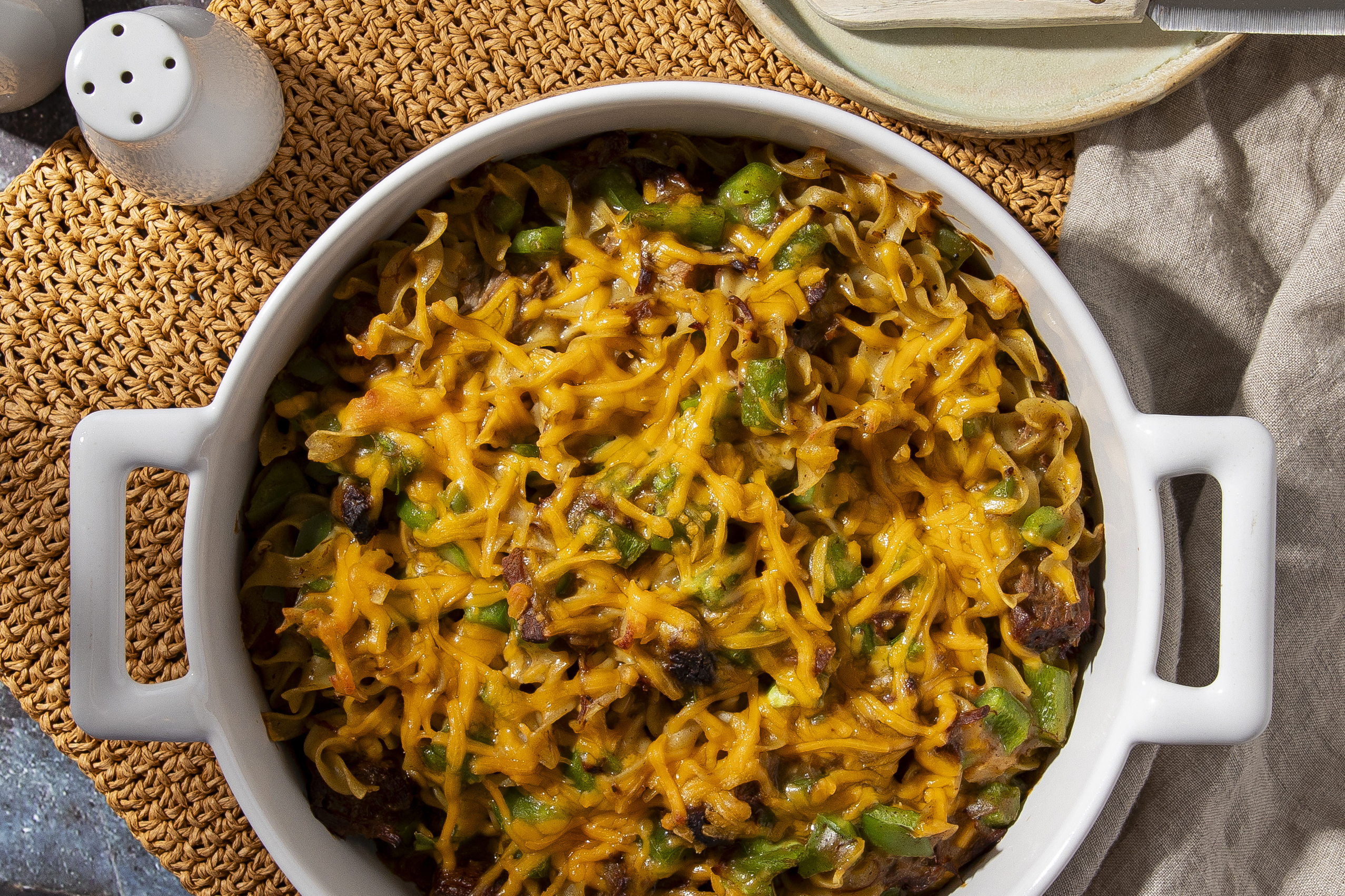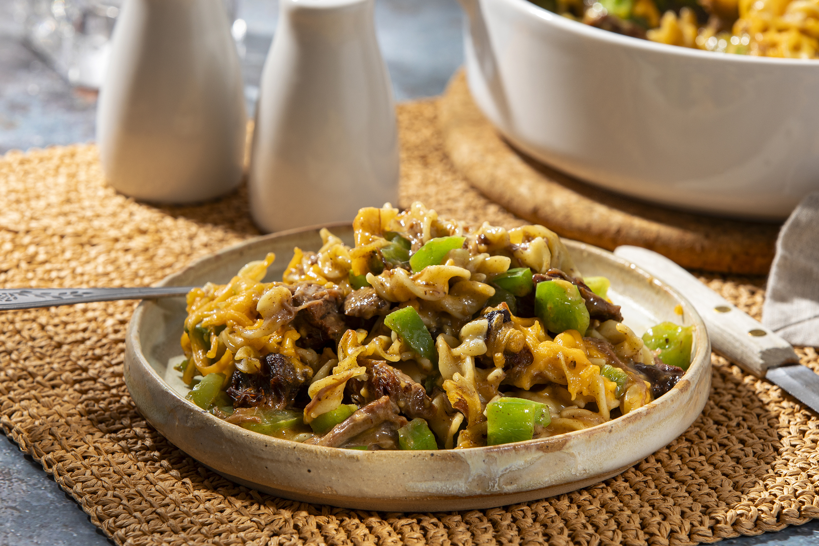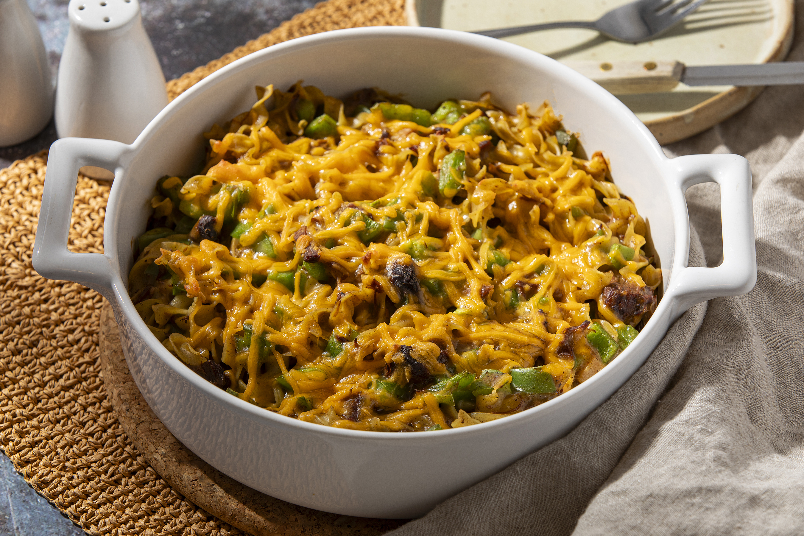The cow may say "moo" but you'll be saying "yum" when you take a bite of Moo-Moo Casserole! Cheesy, beefy, and filled with tender egg noodles, this is exactly what you need to use up any leftover roast beef in the fridge! With fresh green pepper for a crisp accent, Moo-Moo Casserole is easy and ready to beef up your dinnertime!